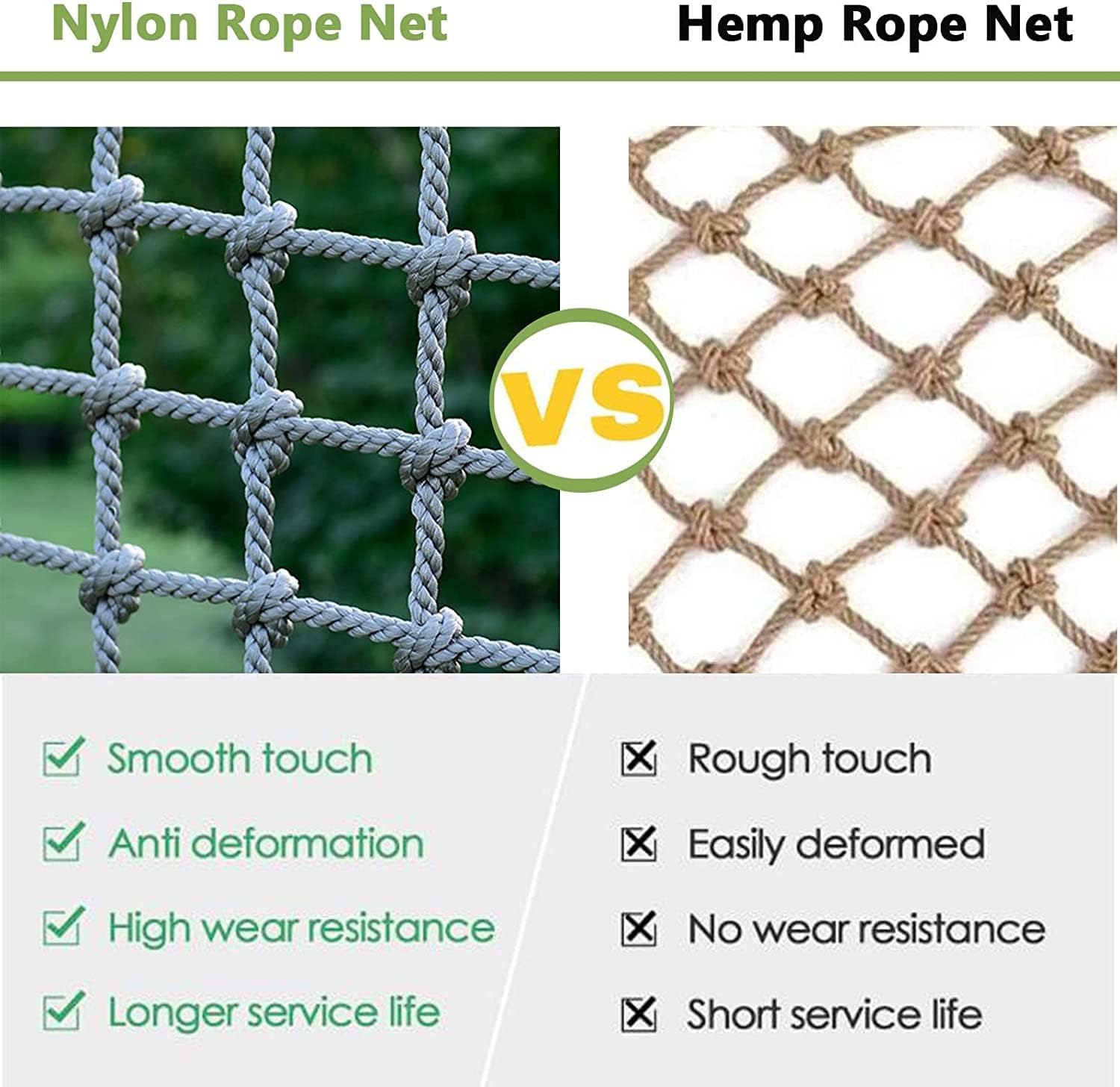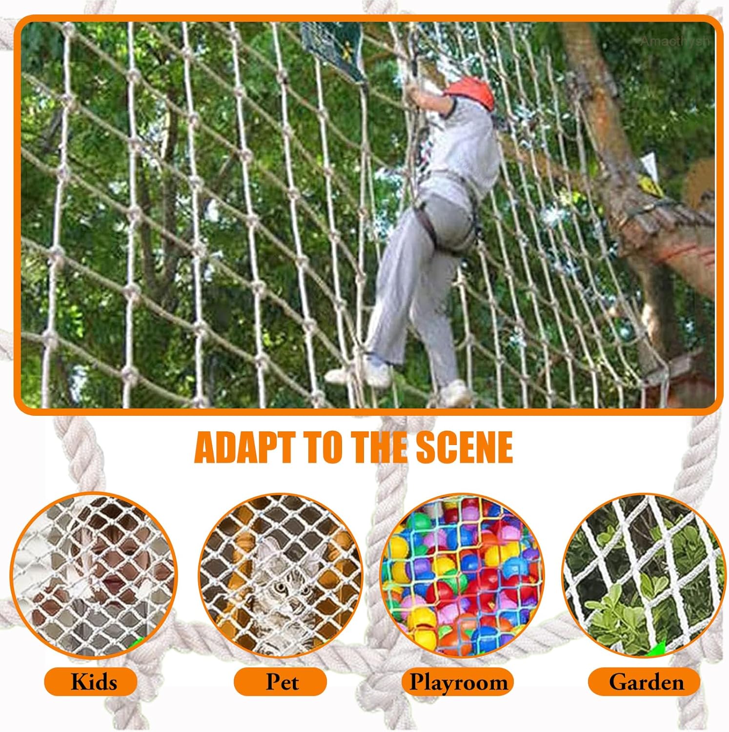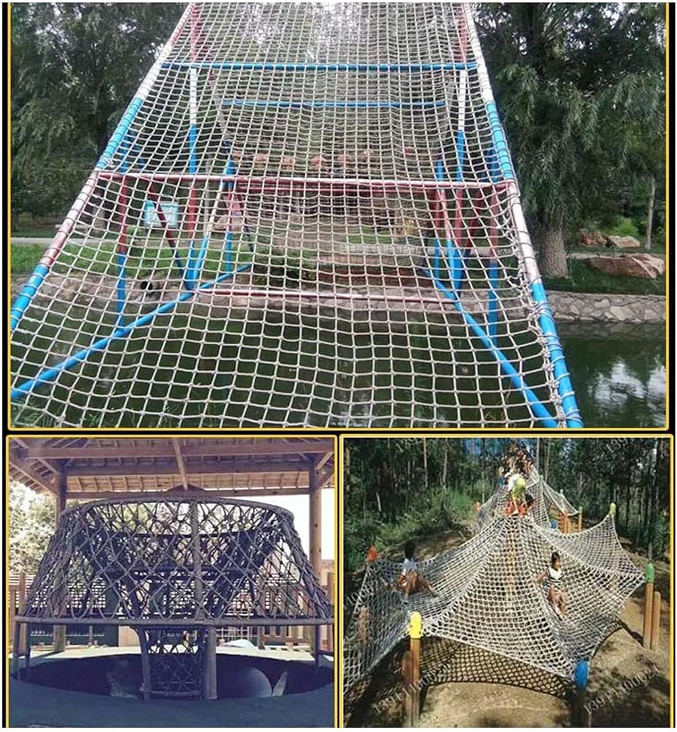 Specifiche della rete in corda: diametro della corda: 14 mm (0,55 pollici), maglia della rete in corda: 20x20 cm (7,9x7,9 pollici); Abbiamo una varietà di dimensioni tra cui scegliere. È possibile personalizzare le reti da arrampicata in altre dimensioni e specifiche. Materiale della rete in corda: la rete da arrampicata è realizzata a mano in corda in fibra di poliammide. La forza è uniforme e non facile da staccare. La superficie in rete è altamente resistente agli urti e portante. È realizzata in treccia multifilo ed è resistente all'usura Protezione di sicurezza: la rete in corda è adatta per balconi, scale, corridoi, cortili, scuole, palestre, campi da gioco e club sportivi per impedire la caduta di persone o oggetti e garantire la sicurezza di animali domestici e persone Rete decorativa multifunzionale: può essere utilizzata all'interno come decorazione, rete per soffitto, rete per pareti fotografiche, rete per asciugatrice e divisorio; può essere utilizzato all'aperto per parchi di divertimento, strutture pubbliche, recinzioni paesaggistiche e protezione di ponti sospesi. Promemoria caldo: dopo aver realizzato la rete di corda, potrebbe esserci un odore che scomparirà dopo la ventilazione e l'asciugatura. La rete in corda di fibra di poliammide diventa grigia dopo aver preso il sole, il che è normale