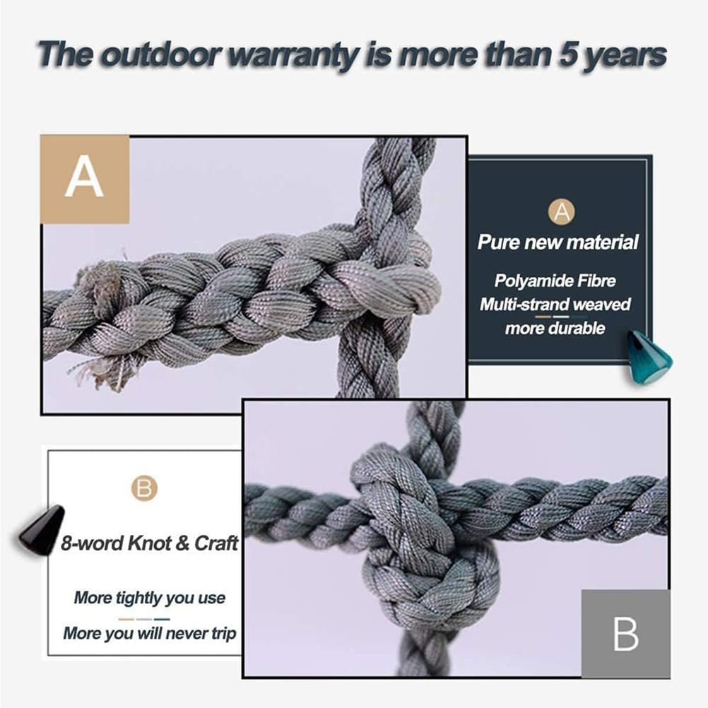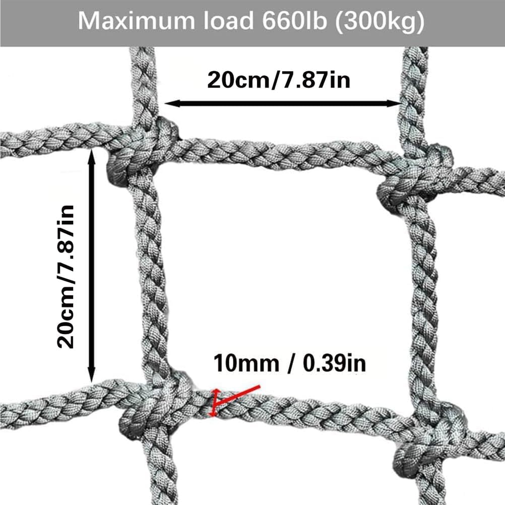 DIMENSIONE DELLA RETE DA ARRAMPICATA – Diametro corda 10/12 mm, dimensione maglie 20 x 20 cm. Disponibili dimensioni individuali per spessore della corda, spaziatura delle maglie e dimensioni nette (L x L). MATERIALE IN POLIESTERE DUREVOLE - Questa rete da arrampicata tessuta a mano in poliestere ad alta resistenza è antivento, resistente all'usura e durevole. RETE DI SICUREZZA MULTIUSO - Adatta per l'arrampicata dei bambini, balconi, ringhiere per scale, bar, librerie, ristoranti, decorazione del soffitto o anche protezione del cantiere. FACILE DA ASSEMBLARE E CONSERVARE - La rete in corda leggera e flessibile può essere facilmente piegata per il trasporto. Veloce da installare su diversi terreni per un facile utilizzo ovunque. GIOCO DI AVVENTURA E FORMAZIONE – Perfetto per percorsi a ostacoli e parchi giochi all'aperto. Promuove l'attività dei bambini, rafforza la forza, migliora l'equilibrio e aumenta la fiducia in se stessi.
