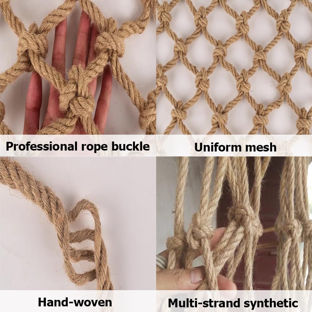 Materiale robusto e affidabile: La nostra rete da arrampicata ad alta resistenza è realizzata in juta naturale, robusta e affidabile, intrecciata con più fili, che la rendono robusta e affidabile per un utilizzo a lungo termine. Il colore naturale può donare un tocco retrò alla tua casa! Realizzata a mano: La nostra rete da arrampicata è tessuta a mano, la maglia è uniforme e bella, può sostenere il peso in modo uniforme, offre un'ottima protezione e ha una capacità di carico fino a 200 kg. Viene utilizzata per protezione e arrampicata, ecc. in momenti molto difficili. Comodo e pratico, facile da riporre: La nostra rete da arrampicata è ben progettata ed è facile da installare e smontare. Devi solo scegliere gli accessori giusti e fissarla alla struttura esistente della tua casa, e può essere utilizzata immediatamente. Rete da arrampicata multifunzionale: Usa la nostra rete da arrampicata per trasformare il tuo giardino nel paradiso dei tuoi bambini! Può essere utilizzata come rete di sicurezza per l'arrampicata, come accessorio per casetta sull'albero, come amaca, ecc. Puoi anche usarla su scale, balconi, ecc. per prevenire cadute accidentali. Offriamo servizi personalizzati: La nostra rete in corda ha uno spessore di 16 mm e una maglia di 15 cm. Se avete bisogno di altri spessori o dimensioni di corda, possiamo fornirvi servizi personalizzati. Non esitate a contattarci in qualsiasi momento!