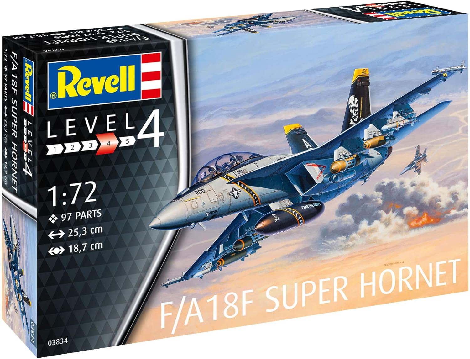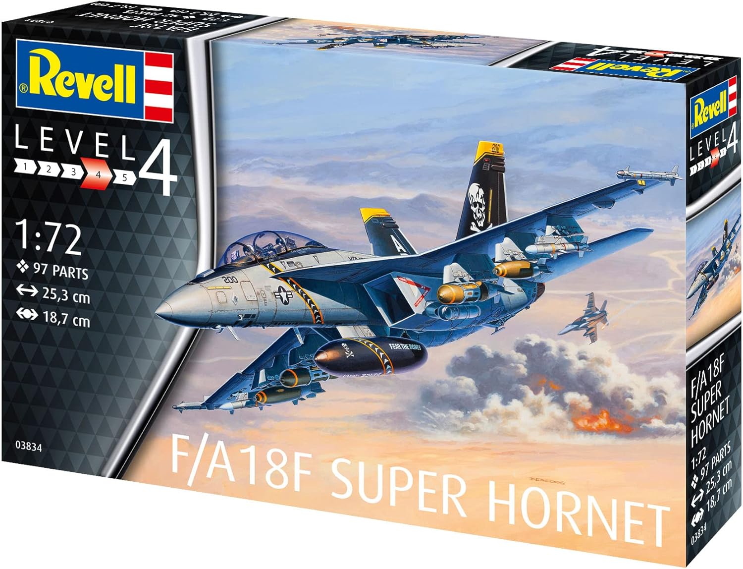 Questo kit modello è una replica dell'F/A-18F Super Hornet, sviluppato come aereo da caccia basato su portaerei. Il corpo dell'F/A-18F Super Hornet è realizzato in plastica rinforzata con fibra di carbonio (CFRP), che lo rende estremamente leggero e resistente allo stesso tempo. Dispone inoltre di una presa d'aria per un ulteriore raffreddamento e di uno speciale ugello per espellere i gas di scarico dal motore per ridurne la firma a infrarossi. Questo kit modello della Revell contiene tutte le parti necessarie per costruire questo aereo, oltre a istruzioni dettagliate per la costruzione con foto che mostrano ogni fase della costruzione. Ci sono anche vernici di base, pennello e colla. Revell