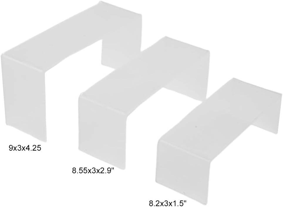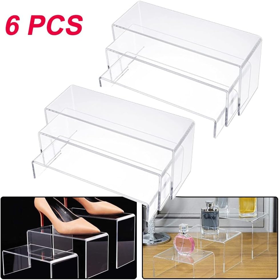 Espositore in acrilico: 6 rialzi rettangolari trasparenti in 3 dimensioni (22 x 7 x 10 cm, 20,8 x 7,6 x 3,8 cm) per artigianato, oggetti da collezione, gioielli, cosmetici e oggetti al dettaglio Espositore trasparente: realizzato in acrilico extra trasparente con bordi lisci per un look elegante e per una facile pulizia, fornendo un effetto visivo galleggiante senza distrarre dai tuoi oggetti in vetrina Scarpiera da banco per gioielli: il design trasparente migliora la visibilità in armadi, negozi, vetrine, fiere o feste consentendo una disposizione flessibile con tre diversi livelli di altezza Scaffale per dessert: ogni set include 3 supporti a forma di U per un supporto stabile di figure, premi, barattoli di bellezza o accessori, la costruzione riutilizzabile garantisce prestazioni di lunga durata Soluzione multiuso per display: le pellicole protettive su entrambi i lati devono essere rimosse prima dell'uso per rivelare una finitura impeccabile, possono verificarsi leggere variazioni di dimensioni dovute alla misurazione manuale