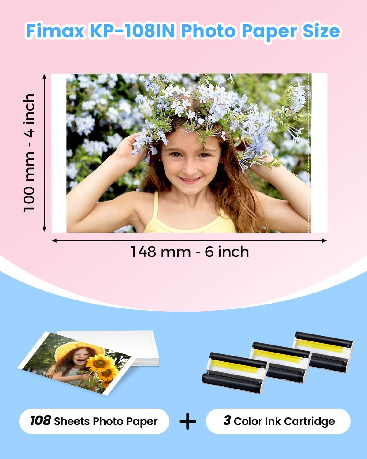 Inchiostro e carta fotografica 6x4 compatibili con stampanti fotografiche Canon SELPHY serie CP: CP100, CP200, CP220, CP300, CP330, CP400, CP510, CP600, CP710, CP720, CP730, CP740, CP760, CP770, CP780, CP790, CP800, CP810, CP820, CP900, CP910, CP1000, CP1200, CP1300, CP1500. Non compatibile con il modello quadrato QX10. Ciò garantisce prestazioni ottimali con la stampante. Dettagli del prodotto: include 3 cartucce d'inchiostro a colori e 108 fogli di carta fotografica; Modello: KP-108IN 3115B001(AA); Dimensioni cartolina: 100 x 148 mm/ 6 x 4 pollici Combinazione di materiali di consumo: richiede l'uso combinato di “cartuccia d'inchiostro da 6 pollici”, “carta da 6 pollici” e vassoio carta “P”. Questa combinazione garantisce il corretto funzionamento della stampante e una stampa di alta qualità. Gestione delle cartucce d'inchiostro: installare la cartuccia d'inchiostro dopo aver acceso la stampante e rimuoverla prima di spegnerla per evitare sprechi di nastro. Questa semplice pratica aiuta a prolungare la durata dei materiali di consumo e a risparmiare sui costi. Linee guida per l'uso della carta: ogni foglio di carta fotografica è dotato di una pellicola protettiva e può essere stampato una sola volta. Evitare di riutilizzare la carta per mantenere la qualità di stampa ed evitare problemi con la stampante.