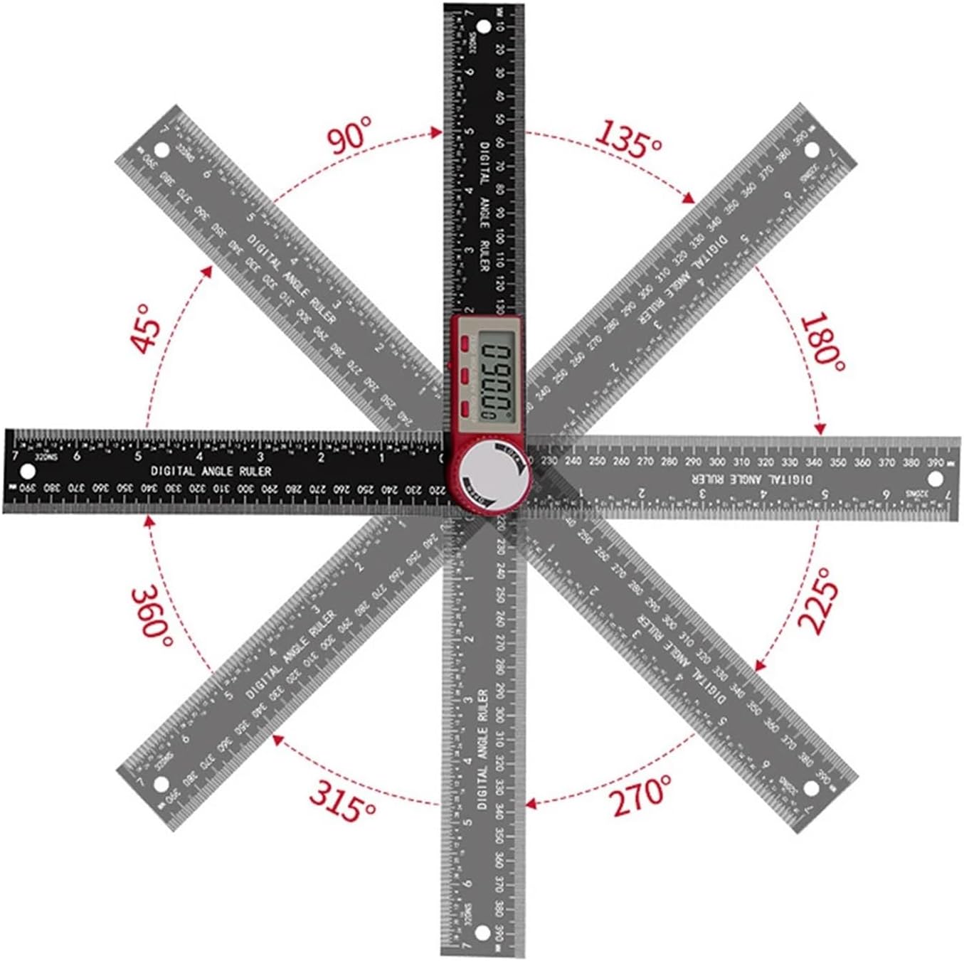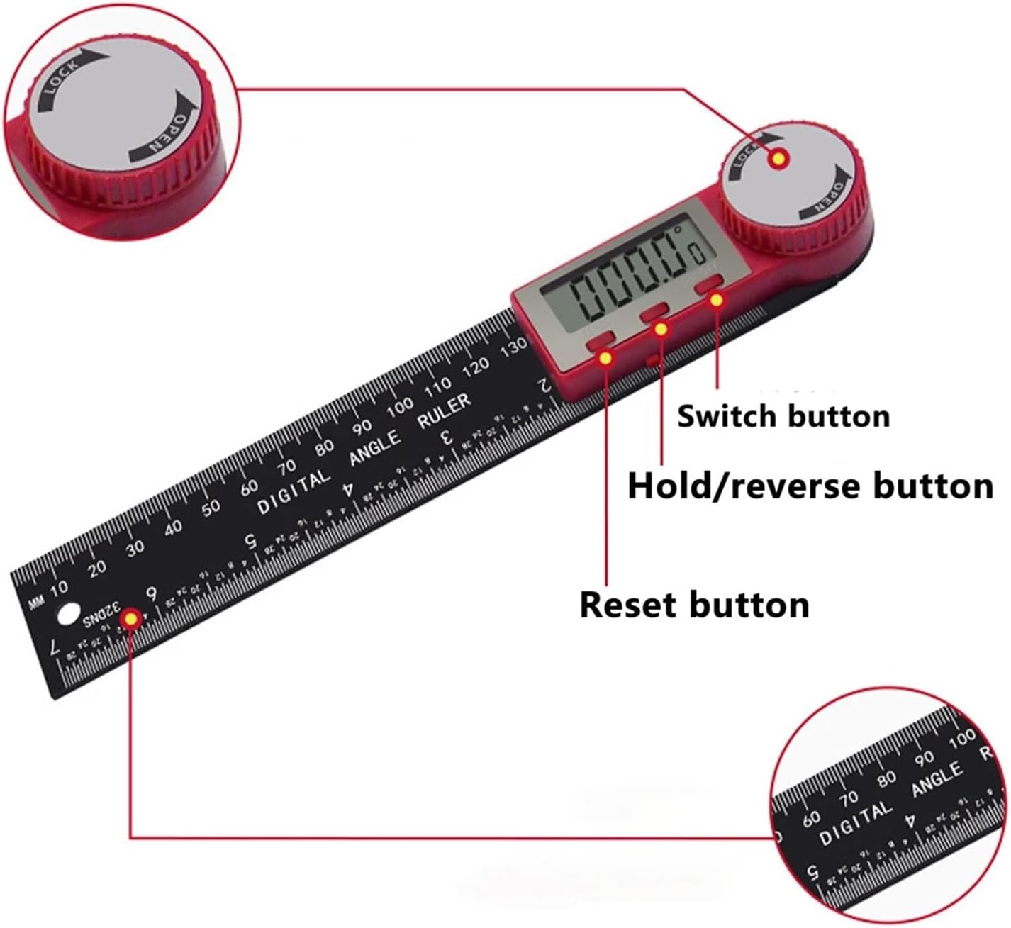 Display digitale ad alta definizione: dotato di display LCD ad alta precisione, visualizza i dati angolo in tempo reale, che sono chiari e leggibili, garantendo che gli utenti possano leggere gli angoli in modo rapido e preciso, adatti a vari ambienti di lavoro Design multifunzionale: integra un righello e un righello angolare, supporta la misurazione angolo interno ed esterno di 0-360° e ha una direzione di utilizzo regolabile, fornendo opzioni di misurazione flessibili ed è dotato di un righello lungo 40 cm for la misurazione e la marcatura, con vari funzioni Comoda funzione di blocco: il design della struttura di blocco può bloccare i dati a qualsiasi angolazione e supporta l'azzeramento con un solo tasto, utile for una regolazione precisa angolo e migliora l'efficienza del lavoro Tenuta regolabile: la funzione di blocco può regolare la tenuta for garantire che l'angolo non cambi arbitrariamente durante la misurazione, migliorare la stabilità, evitare il bloccaggio completo e mantenere un certo grado di flessibilità Alta precisione e ampio intervallo di misurazione: fornisce una risoluzione di 0,05°/3' e un'alta precisione di 0,5°, con un intervallo di misurazione di 0-360°, adatto a una varietà di esigenze di misurazione professionali, garantendo un'elevata precisione dei risultati di misurazione