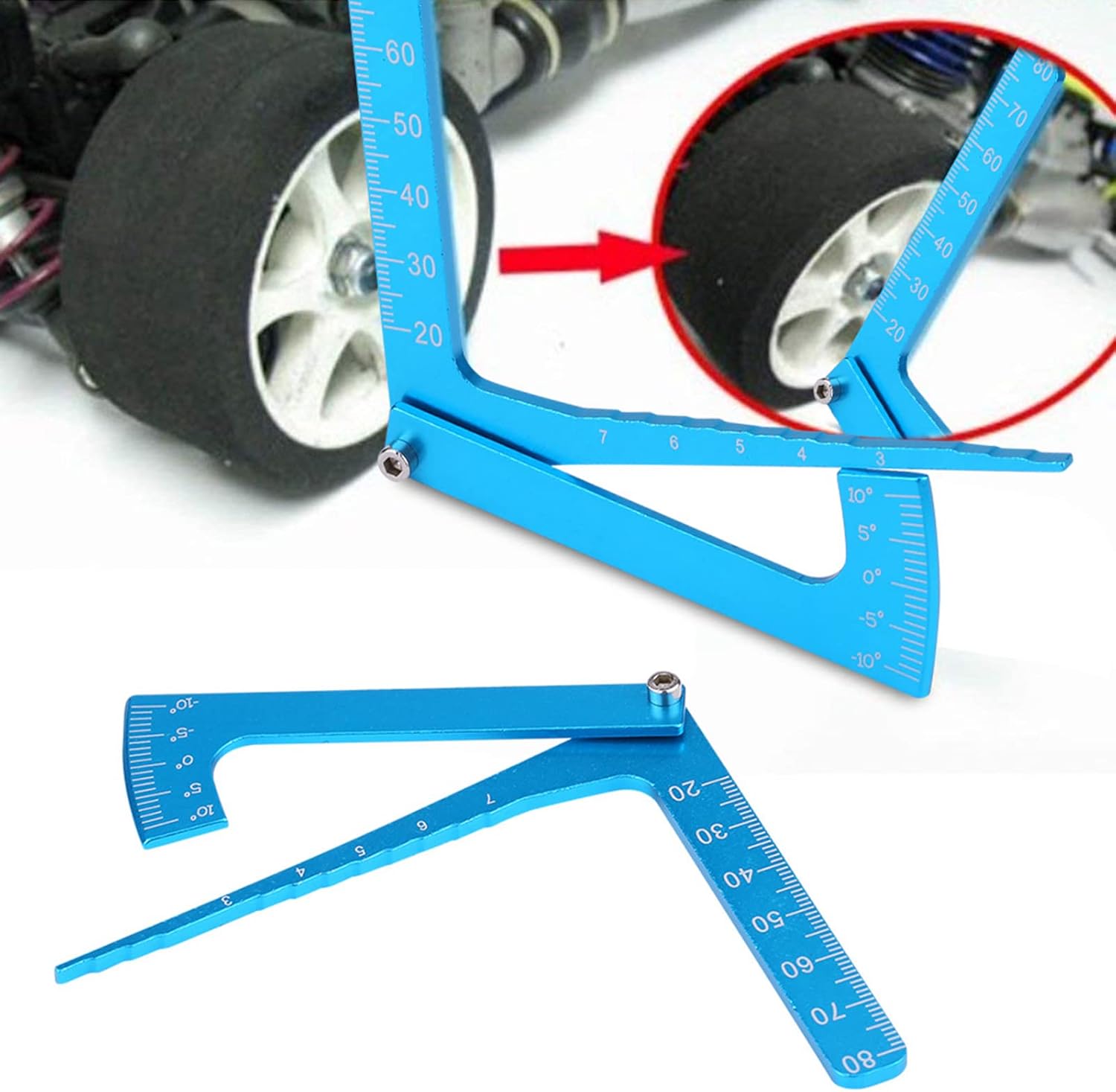 Buona fattura e dimensioni precise È luminoso e senza sbavature Realizzato in lega di alluminio Può aiutare a misurare e regolare l'altezza e la campanatura del cerchio della tua auto RC Mantenere camber in ottime condizioni