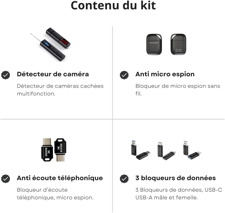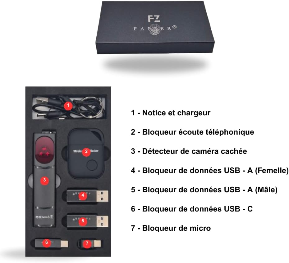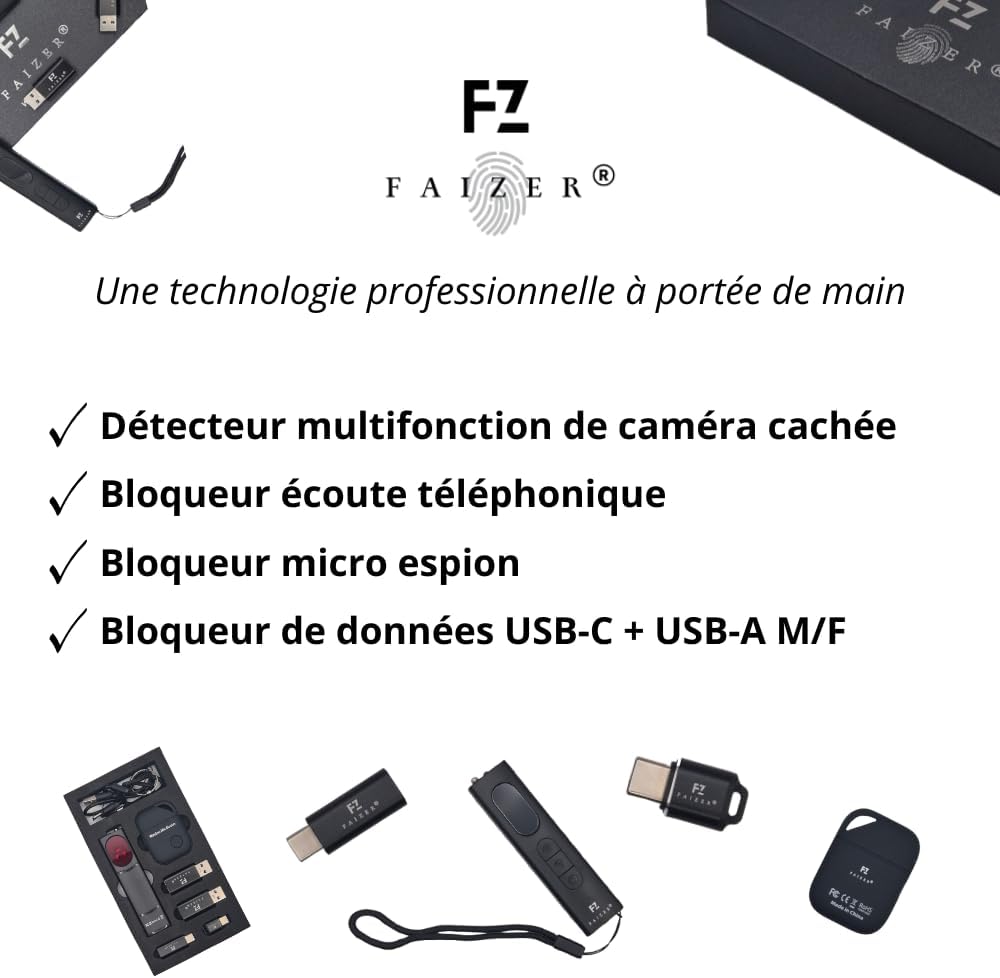 【Kit FAIZER rilevatore telecamera nascosta e microfono spia】 - Ultima tecnologia a portata di mano, proteggi la tua privacy con il nostro kit che include un rilevatore di telecamera nascosta e microfono camera, blocco dell'ascolto telefonico, blocco del microfono e tutti i tipi di blocco dati usb contro l'hacking. Rilevatore di mini telecamera spia wireless: Rilevatore di micro spia di segnale RF per rilevare trasmettitori di bug RF attivi come telecamere spia di trasmissione, tracker GPS tracker e bug audio wireless. Localizzatore di lenti per telecamera spia discreta e micro spia tramite semplice ispezione visiva grazie alla scansione laser a infrarossi. Rilevamento del campo magnetico per trovare tracker gps magnetizzato indesiderati. Torcia elettrica, più preoccupazioni, anche in un ambiente buio Sicurezza dei dati: questo rilevatore di telecamere spia, plotter gps e micro spia utilizza la tecnologia di scansione passiva, wireless e a infrarossi. Può rilevare con precisione le seguenti intercettazioni: ascolto telefonico, ascolto di riunioni, localizzazione GPS, ascolto in auto, telecamere wireless, telecamere cablate, sorgenti di radiazioni elettriche, ecc. Può prevenire efficacemente le perdite della tua privacy grazie al blocco dati USB. Rileva più dispositivi micro camera spia: questo rilevatore di microfono e telecamera spia può rilevare telecamere wireless 1,2 G/2,4 G/5,8 G, mini telecamere nascoste, intercettazioni telefoniche, dispositivi di ascolto audio-video a celle GSM/CDMA/DECT, tracker GPS indesiderati e molti altri dispositivi come la penna spia micro telecamera nascosta hidden cam. Cattura i segnali RF nella gamma di frequenza da 1 MHz a 8 GHz Blocco dati USB-C - Proteggi i tuoi dati quando colleghi il telefono alle stazioni di ricarica pubblica, le spie possono rubare tutti i tuoi dati, proteggerti con il nostro blocco dati usb c. I blocker di dati USB FAIZER impediscono il furto di dati e la trasmissione di malware bloccando fisicamente i pin di trasferimento dati, garantendo così la privacy e la protezione delle informazioni personali durante la connessione a porte USB pubbliche. Offrono una protezione completa contro accessi non autorizzati, violazioni dei dati e spoofing come un cappuccio USB. Blocco dati USB-A - Proteggi i tuoi dati quando colleghi il telefono alle stazioni di ricarica pubblica, le spie possono rubare tutti i tuoi dati, proteggerti con il nostro blqer dati USB-A blocker USB. Blocco dati USB-A e C - Proteggi i tuoi dati quando colleghi il telefono alle stazioni di ricarica pubblica, le spie possono rubare tutti i tuoi dati, proteggerti con il nostro blocco dati USB-A e C dati.
