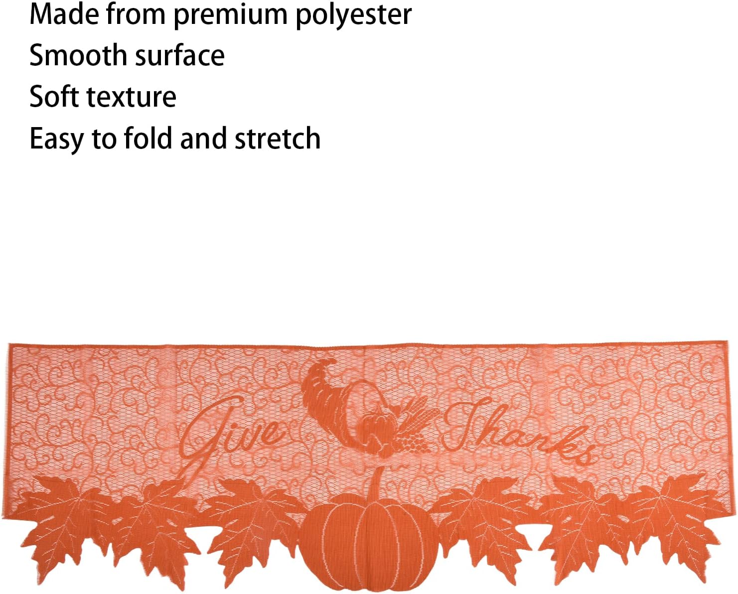 [Materiale premium]: realizzato con poliestere di alta qualità, questo corridore di tavoli del Ringraziamento con pizzo garantisce una durata per l'uso a lungo termine. [Texture morbida]: la superficie morbida e liscia di questo runner del tavolo del Ringraziamento offre un tocco confortevole, adatto sia per il lavaggio delle mani che per le macchine. [Cucitura ad alta densità]: con cuciture ad alta densità, questo corridore del tavolo del Ringraziamento è facile da piegare, allungare e pulire, mantenendo la sua forma nel tempo. [Modello squisito]: con un affascinante design di zucca e foglie d'acero, questo runner da tavolo del Ringraziamento aggiunge un'atmosfera calda e festosa a qualsiasi stanza. [Decorazione versatile]: per migliorare il camino, il camino, la finestra, la porta, il tavolo da pranzo, il tavolino, il ristorante o anche come scialle o sfondo, rendendolo un pezzo di arredamento versatile per varie occasioni.