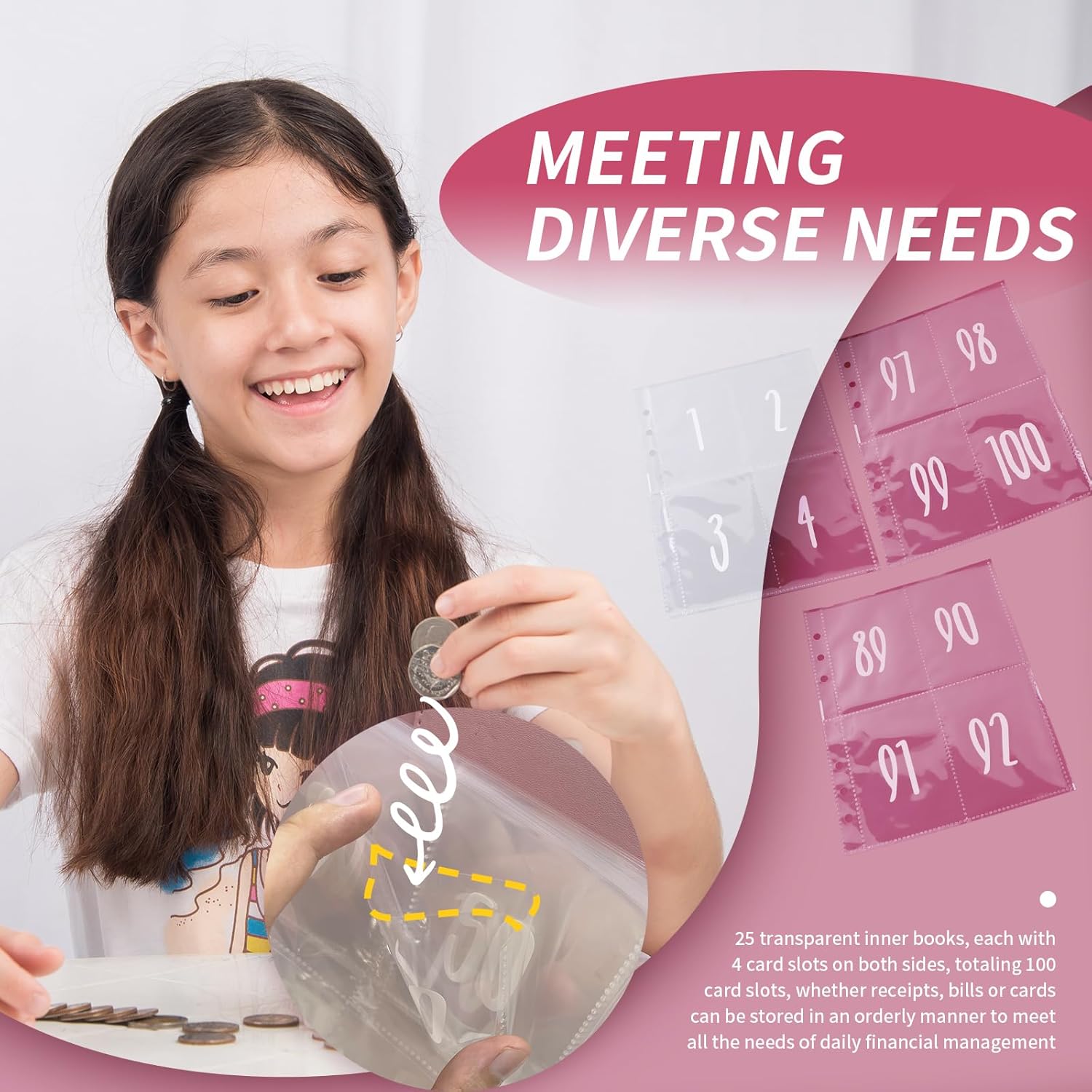 Impermeabile e resistente agli strappi: La copertina libro risparmio soldi per il risparmio è realizzata in ecopelle, impermeabile e resistente agli strappi, mentre le pagine interne sono realizzate in resistente materiale PVC, una doppia protezione che garantisce che il libro rimanga intatto in ambienti diversi e vi accompagni a lungo nel vostro viaggio di risparmio. Cambio pagina flessibile: il design del raccoglitore metallico consente di rimuovere e sostituire facilmente le pagine interne, sia per regolare l'ordine dei record che per aggiungere nuove pagine, adattandosi perfettamente ai progressi della vostra sfida di risparmio. Registrazioni chiare: la challenge del risparmio include un inserto con l'importo digitale e un set completo di 3 schede perforate appositamente progettate per la sfida del risparmio. Insieme al registro delle schede perforate, i depositi giornalieri sono registrati in modo chiaro, in modo da poter vedere i progressi a colpo d'occhio e motivarsi a continuare ad andare avanti. Molteplici esigenze: 25 inserti trasparenti, ciascuno con 4 slot per schede sul fronte e sul retro, per un totale di 100 slot per schede: ricevute, banconote o carte possono essere organizzate per soddisfare tutte le esigenze di gestione finanziaria quotidiana. Comoda apertura e chiusura: Dotato di una robusta chiusura magnetica, si apre e si chiude in modo fluido e sicuro e può essere aperto o chiuso rapidamente anche nei momenti di maggiore affluenza, migliorando la comodità d'uso.