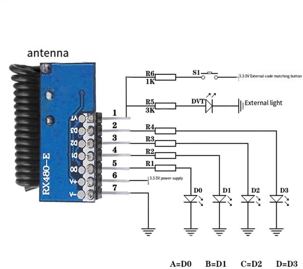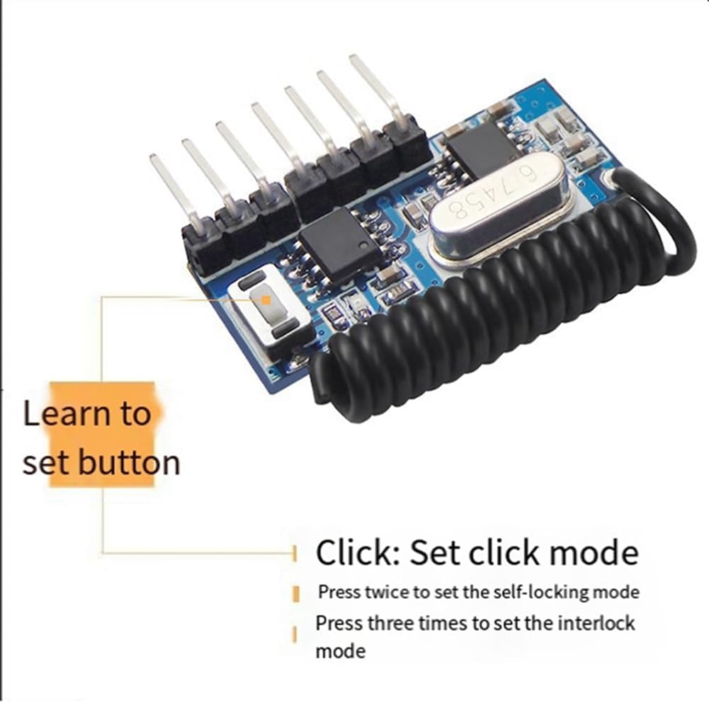 Il modulo di ricezione ha 7 modalità, tra cui jogging, auto-blocco e blocco, che possono essere selezionate e impostate. Il modulo di ricezione adotta la modalità di selezione della chiave. Non è necessario selezionare manualmente la modalità tramite saldatura, cavi di collegamento, ecc., Che consente di risparmiare tempo e costi di manodopera. Il modulo di ricezione ha un chip di decodifica e può supportare EV1527, PT2262 e altri chip di codifica. viene premuto il pulsante del , l'uscita di D0, , D2 e D3 è di livello alto, e non viene premuto, è di livello basso. Il può adottare il metodo di codifica di apprendimento EV1527/codice fisso 2260. Ogni ha un codice di indirizzo indipendente per evitare codifiche incrociate e interferenze reciproche.