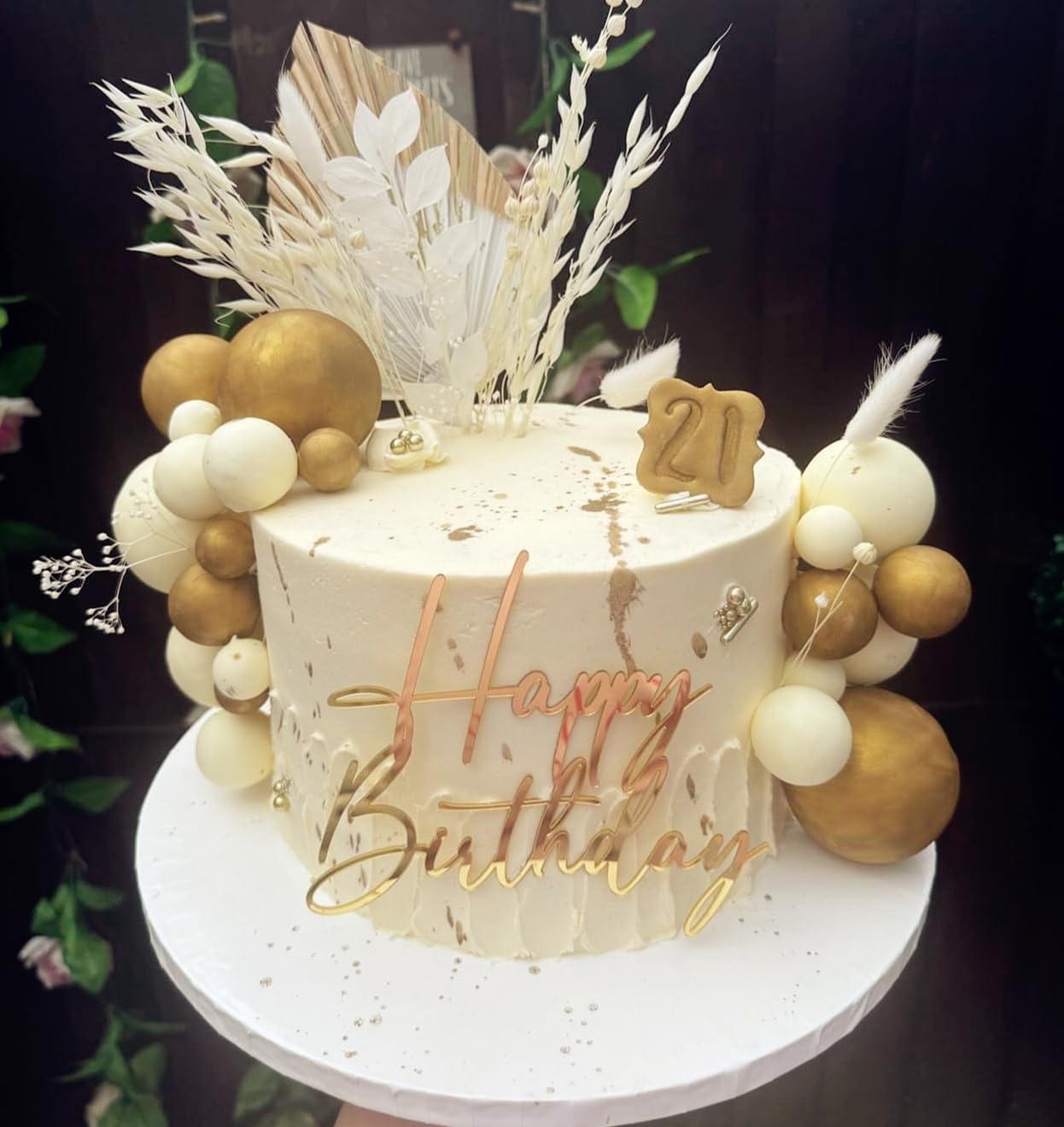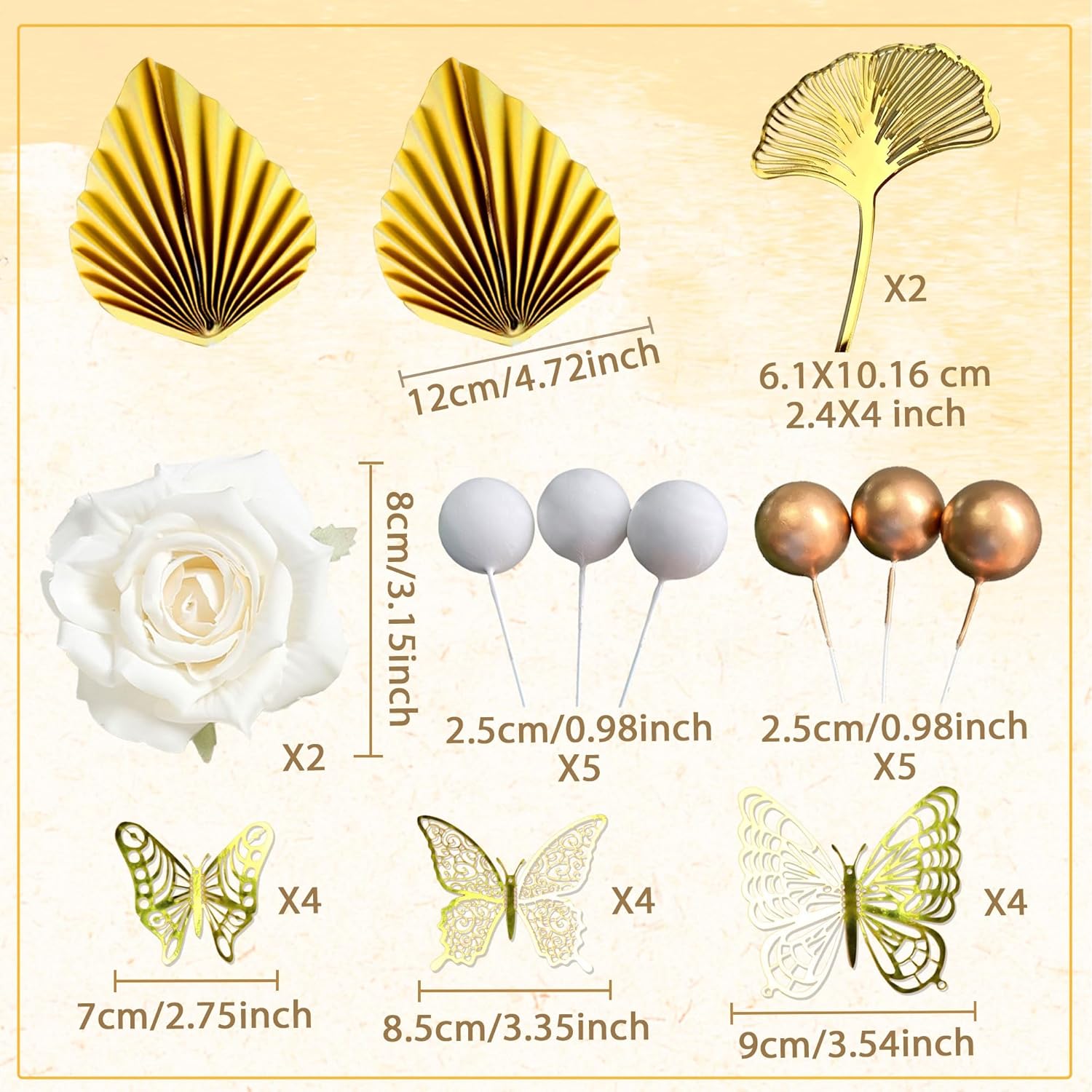 Il nostro set di toppers per torta in foglia di palma dorata ha tutto ciò di cui hai bisogno per rendere questo giorno indimenticabile. Questo set di toppers per torta bohémien è adatto per feste di compleanno, matrimoni e feste festive. Il set include: 2 foglie di palma, 2 foglie di ginkgo, 2 rose bianche, 5 palline bianche, 5 palline dorate, 12 farfalle Fai da te la tua festa con il nostro topper per torta champagne Boho per celebrare il tuo momento fantastico. Se hai problemi, fammi sapere