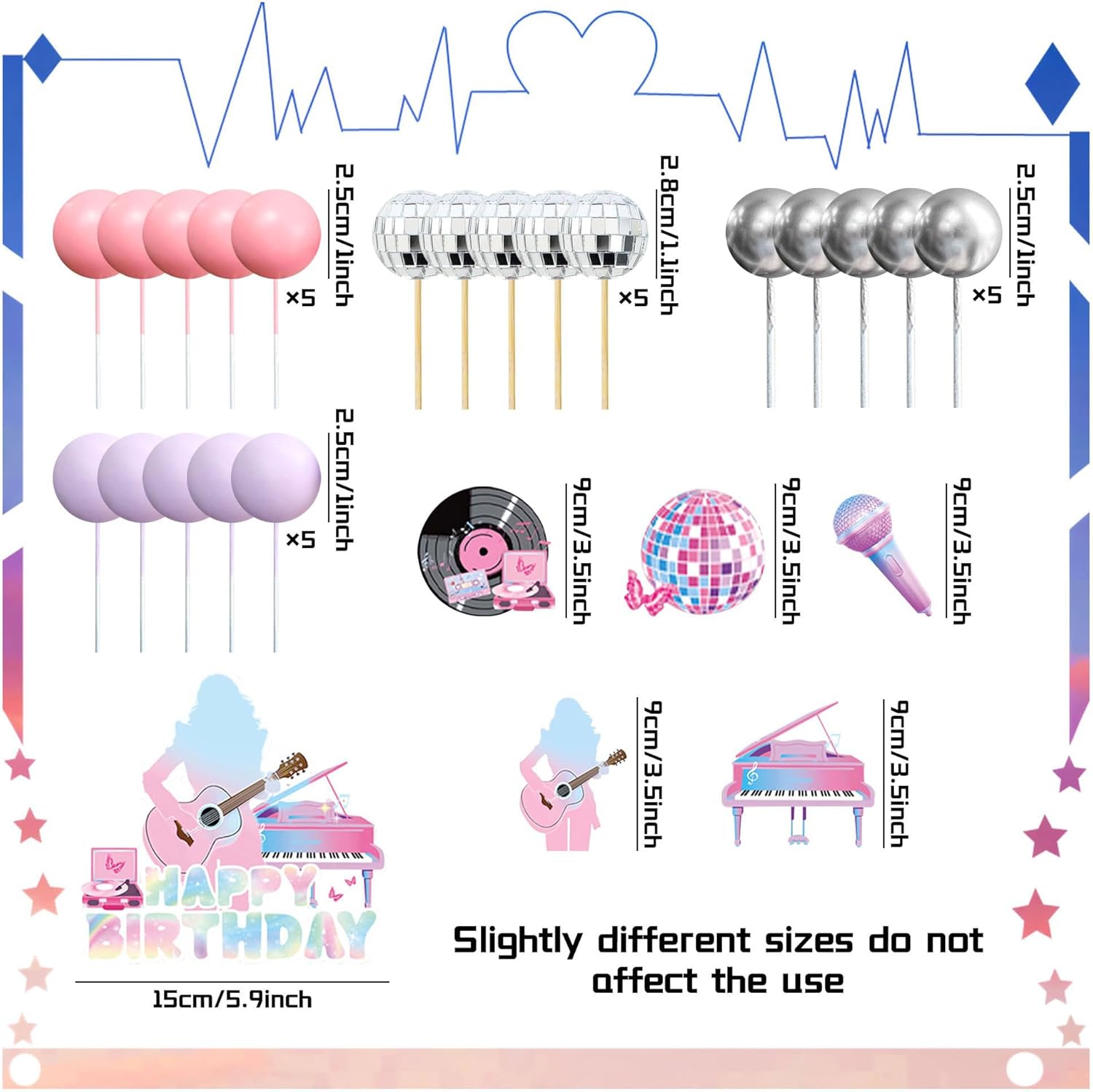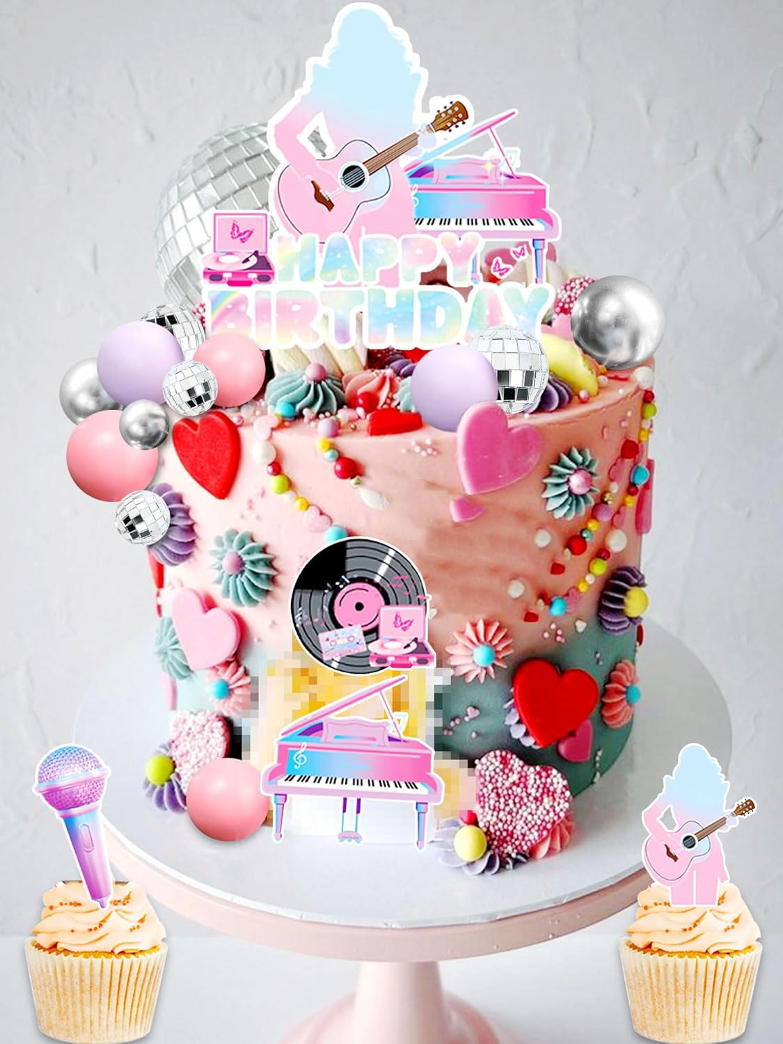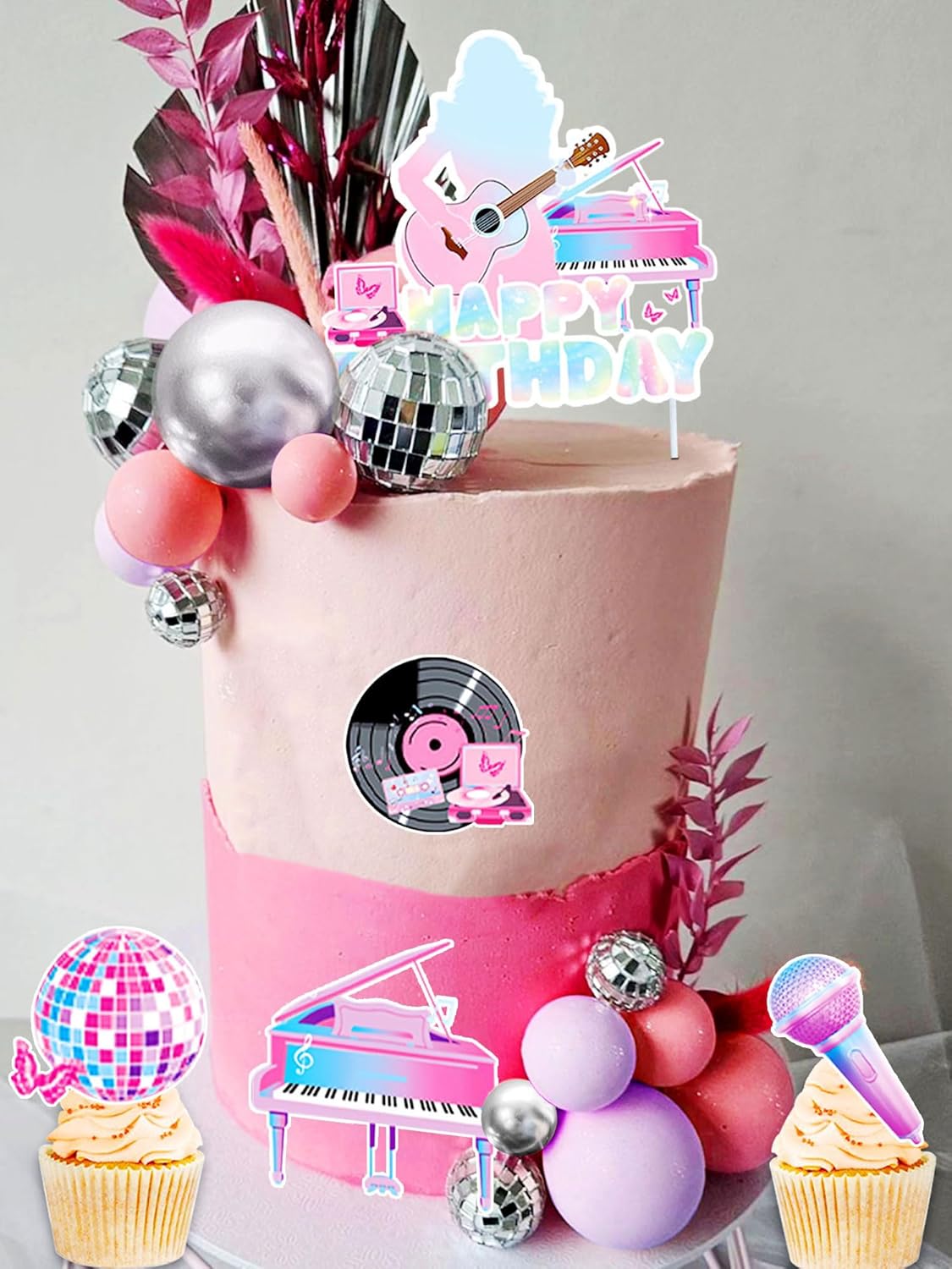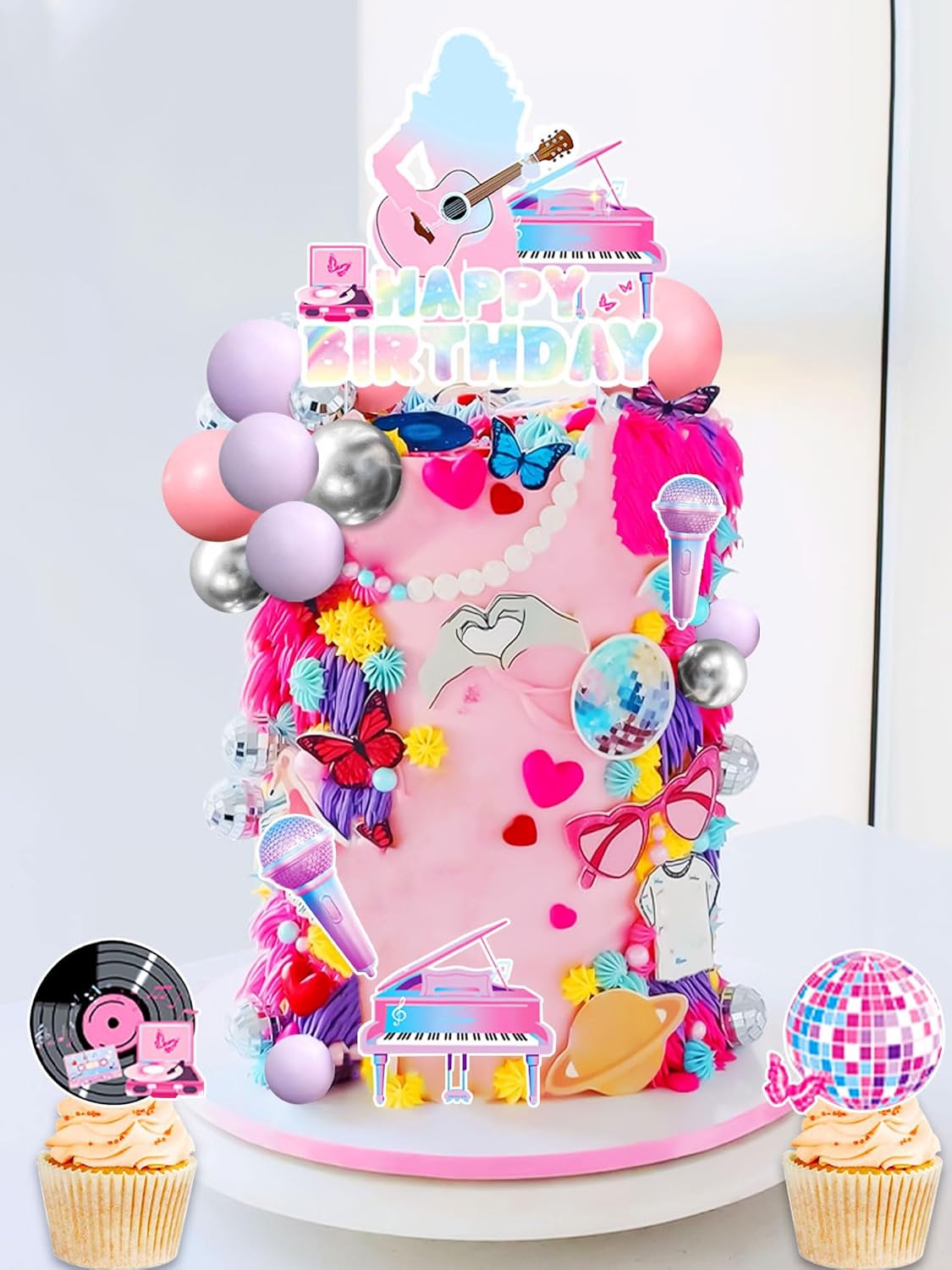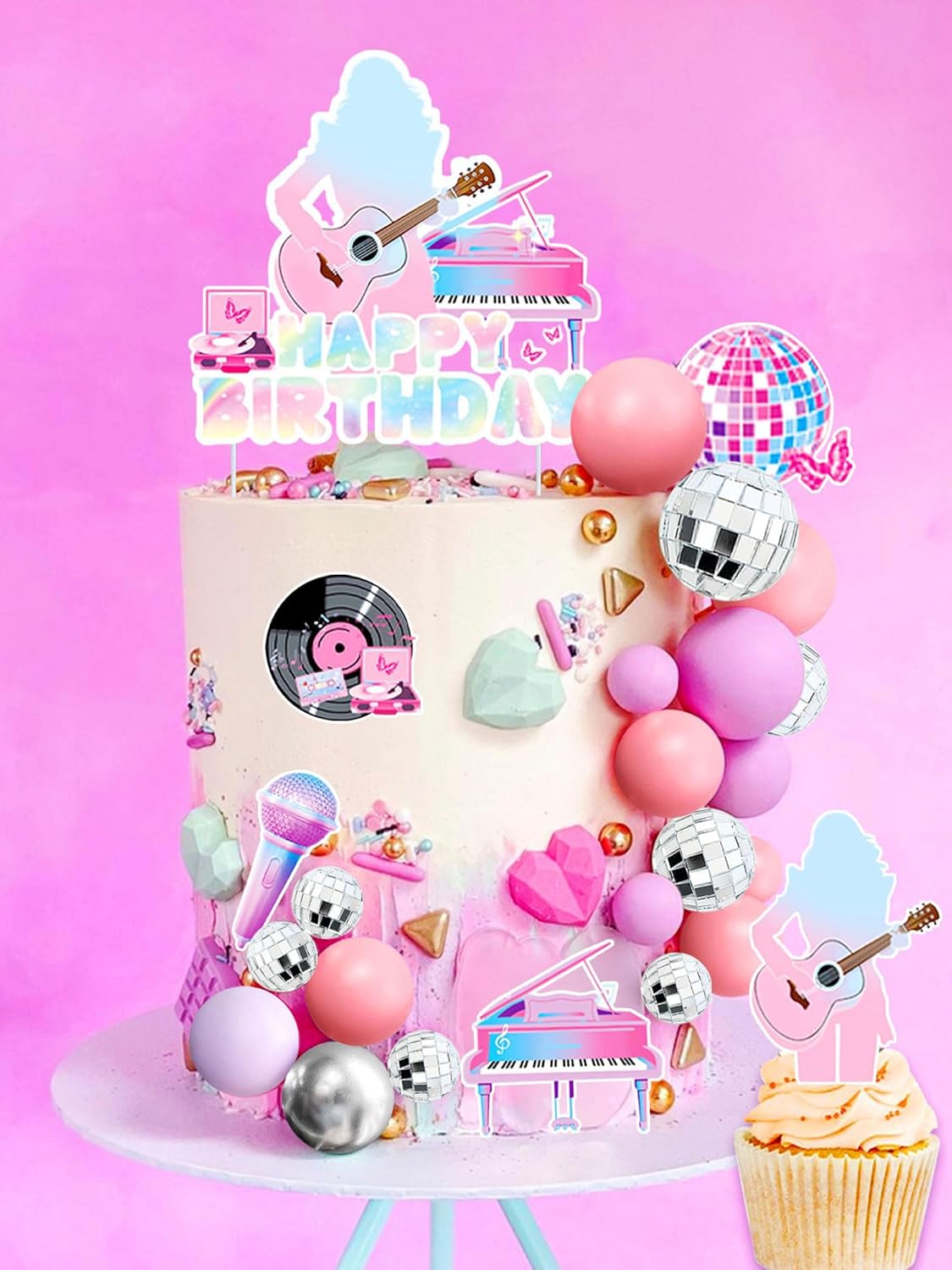 Il nostro set di decorazioni per torta di compleanno per cantanti ha tutto ciò di cui hai bisogno per rendere questo giorno indimenticabile. Questo set di decorazioni per feste a tema compleanno per ragazze è adatto per la festa di compleanno di cantanti. La confezione include: 1 inserto per torta HAPPY BIRTHDAY, 6 toppers per torta a tema musicale, 5 palline da discoteca, 5 palline rosa, 5 palline viola, 5 palline argentate. La nostra torta decorativa nell'era del mio compleanno renderà la tua torta più interessante e immergerà la tua famiglia e i tuoi amici in un'esperienza indimenticabile. Se avete problemi, fatemelo sapere