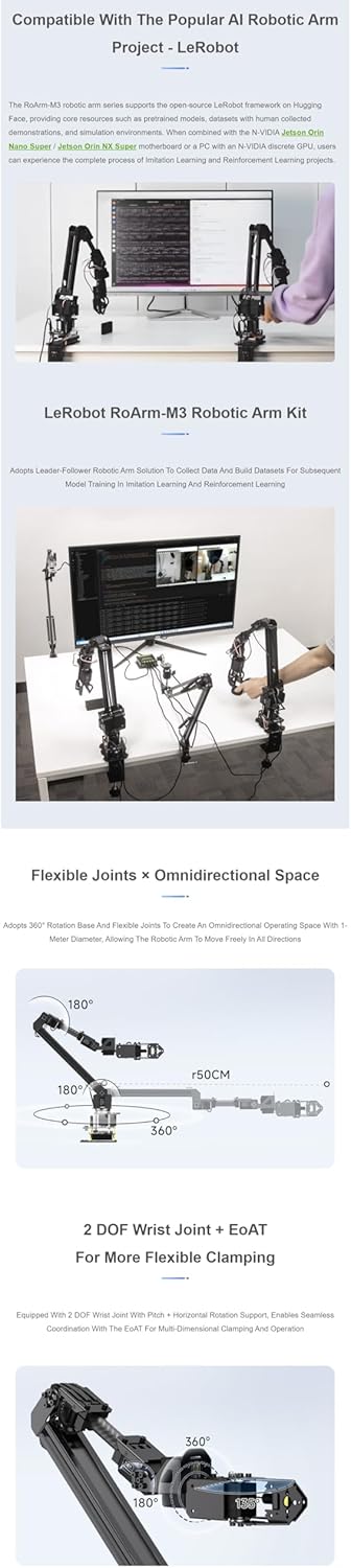 Supporta il progetto open source del braccio robotico AI mainstream LeRobot, fornendo una libreria di codice di esempio completa per una rapida implementazione al braccio robotico RoArm-M3, risparmiando tempo di sviluppo. Risorse di apprendimento abbondanti: offre risorse di apprendimento open source complete per aiutare gli utenti a iniziare rapidamente e sviluppare applicazioni robotiche, facilitando un rapido accesso all'apprendimento imitativo e rinforzato. La base girevole a 360° con movimento flessibile del giunto crea uno spazio di lavoro con un diametro fino a 1 m per ottenere una libertà di movimento completa. Fornisce applicazioni Web multipiattaforma e modalità di controllo coordinate, riducendo la difficoltà di utilizzo e consentendo agli utenti di utilizzare facilmente bracci robotici. Open source il codice di controllo e la documentazione dell'interfaccia di comunicazione della serie di bracci robotici RoArm-M3, che è conveniente affinchè gli utenti effettuino lo sviluppo secondario.