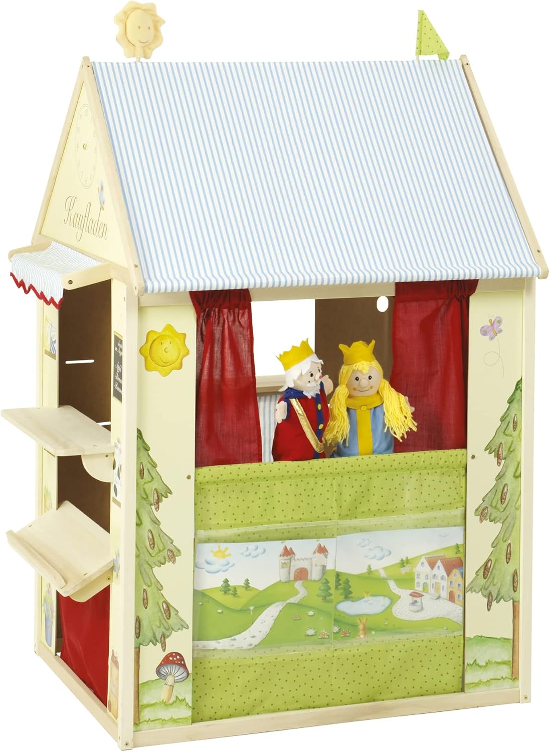 La casa da gioco roba comprende quattro pagine giocabili con diversi mondi di esperienze e numerose possibilità di gioco. La casa per giochi di ruolo pronta per il gioco si presenta come un negozio con bancone e orologio, scambio della posta, chiosco o panca, nonché un teatrino con tenda e borsa fondale per personalizzare te stesso. Una fiancata con un grande quadro e un'anta in tessuto completano la casa del tuo bambino. La struttura del telaio della stabile casetta da gioco è realizzata in legno massiccio, le quattro pareti laterali in MDF stampato con cura ed elementi in tessuto. Affinché tuo figlio possa giocare ai diversi giochi di ruolo, è incluso un set completo di accessori. La casetta sviluppata in Germania promuove la creatività, l'interazione sociale ed è altamente raccomandata per bambini dai 3 anni in su. Questa casetta per bambini è stata sviluppata in Germania secondo la norma europea sulla sicurezza dei giocattoli (EN 71). Tutti i materiali utilizzati sono testati e certificati privi di sostanze nocive.