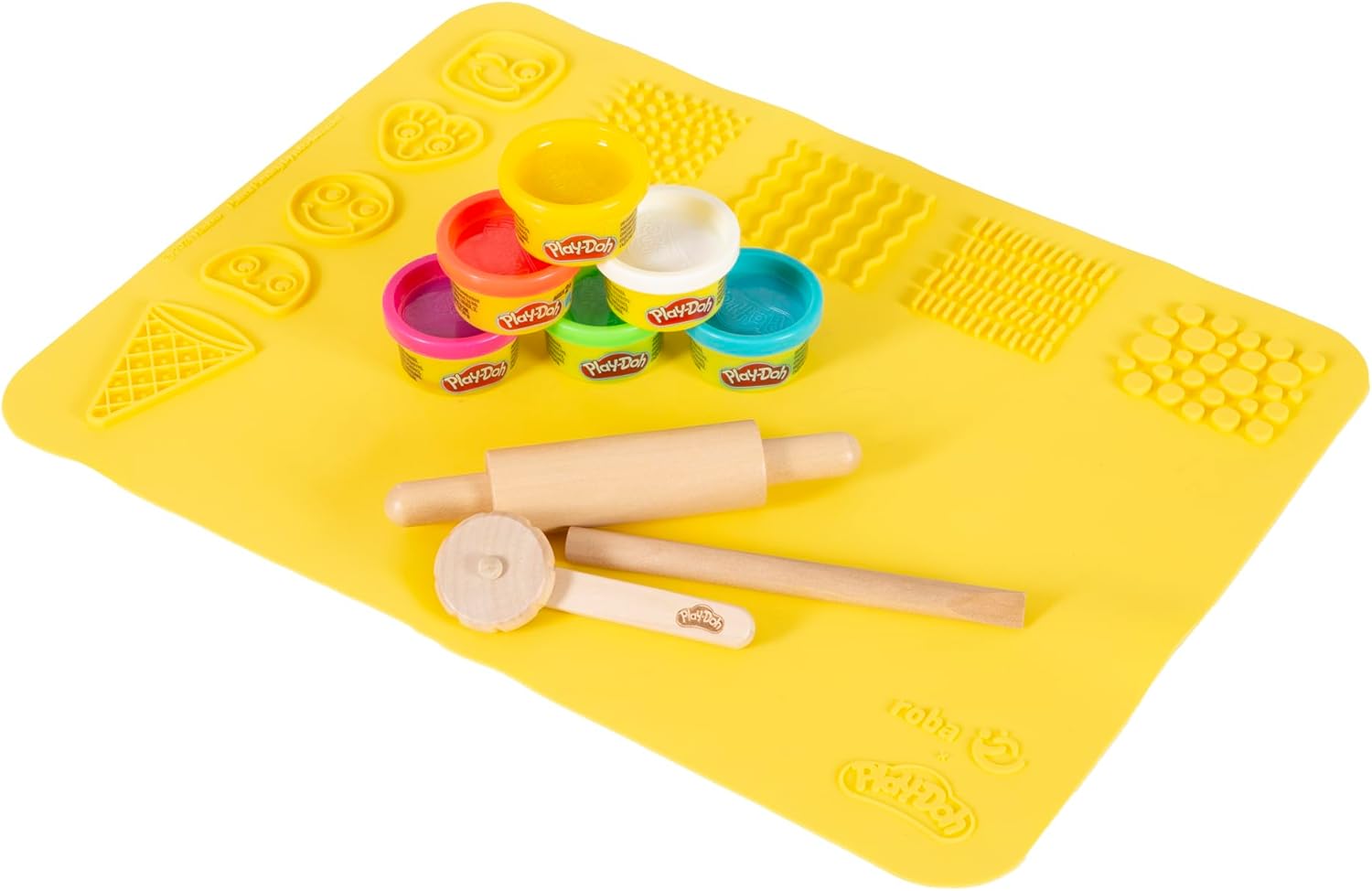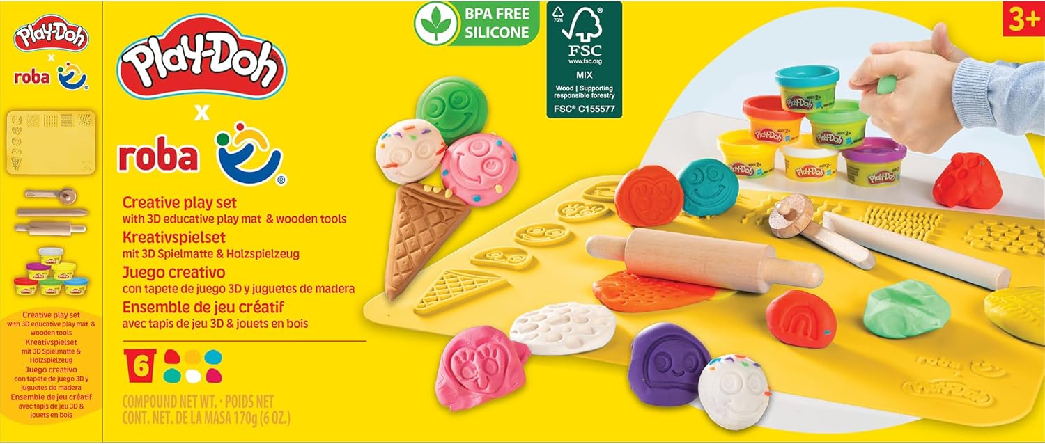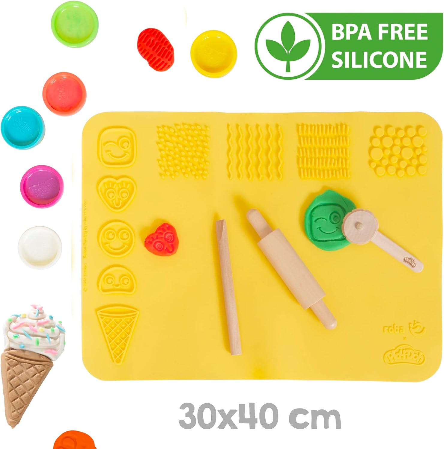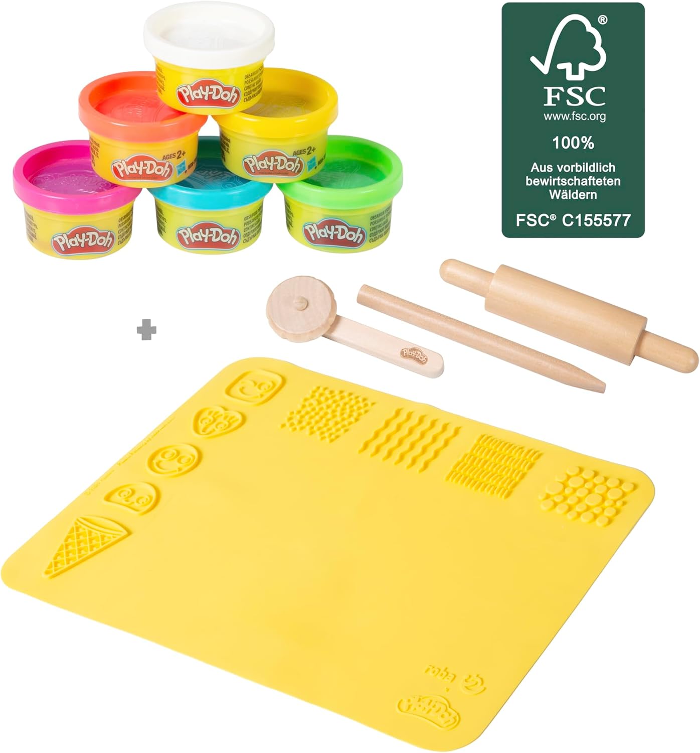 TAPPETO 3D BREVETTATO: tappeto da gioco e da lavoro (AxL: 30 x 40 cm) in silicone privo di BPA - Con facce divertenti e forme per creare con la fantasia STRUMENTI IN LEGNO CERTIFICATI FSC: tre strumenti di alta qualità - attrezzo per modellare, mattarello e tagliapizza - realizzati in legno sostenibile certificato FSC SET GIOCO CREATIVO CON PASTA PER MODELLARE: 6 barattoli di pasta Play-Doh rossa, gialla, blu, verde, bianca e viola - Perfetto per progetti di modellazione versatili e giochi fantasiosi GIOCO CREATIVO E VERSATILE: regalo creativo per bambini a partire da 3 anni - Ideale per la scuola materna o a casa, favorisce la creatività e le abilità motorie SOSTENIBILE E PEDAGOGICAMENTE VALIDO: set di gioco ecologico che supporta il pensiero creativo e le abilità motorie