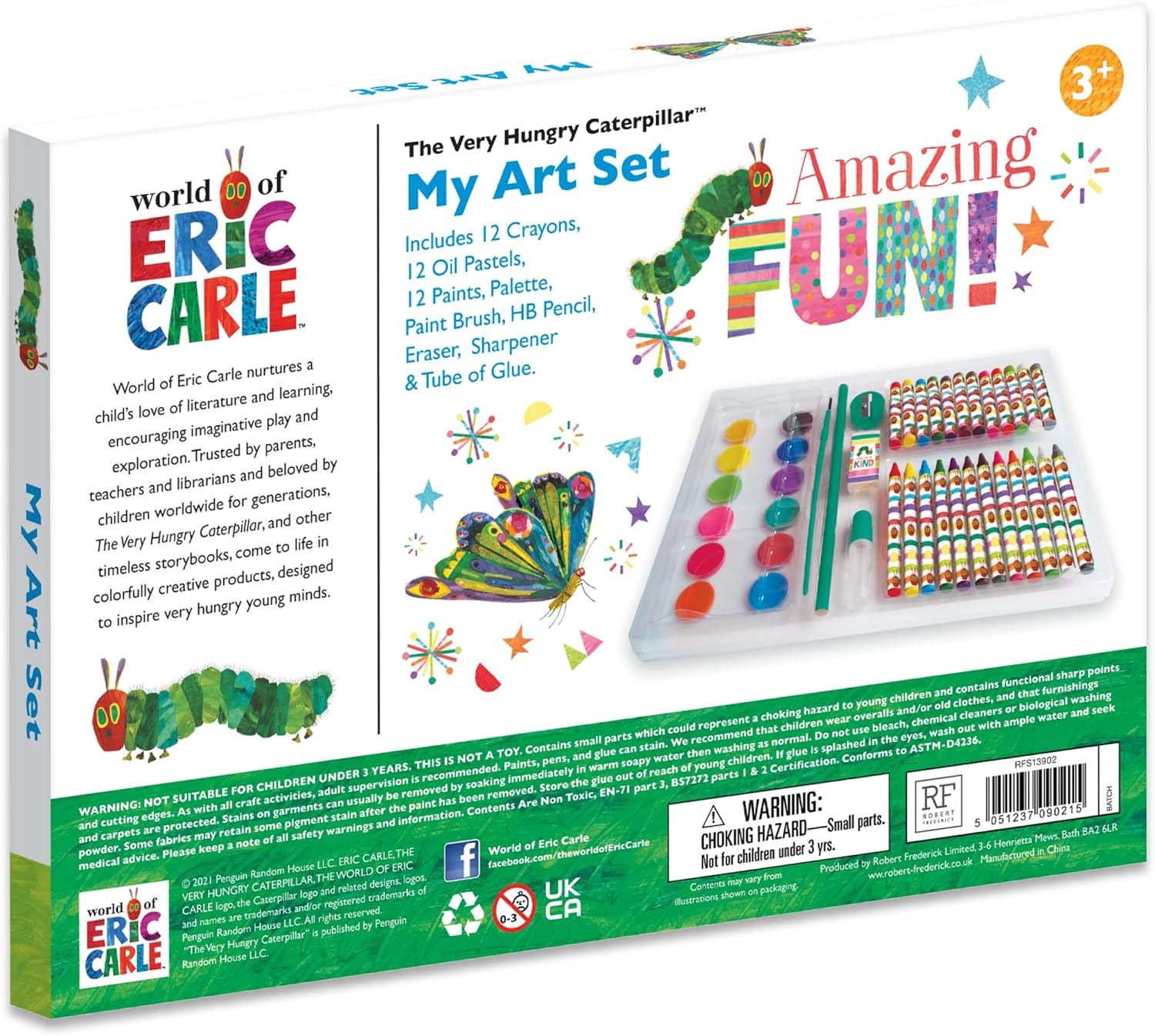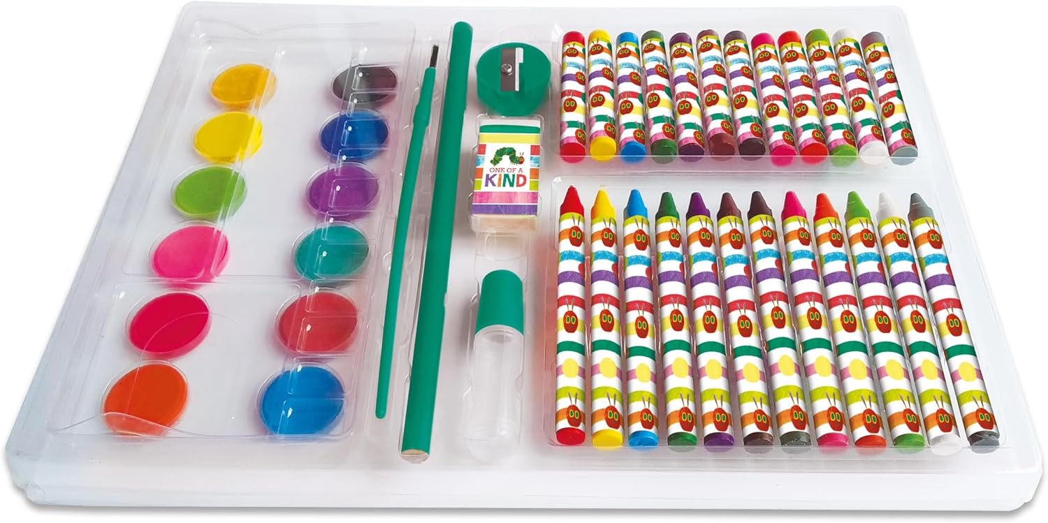 Incoraggia la creatività: incoraggia il tuo giovane artista in erba con questo set artistico da 42 pezzi con il bruco molto affamato. I bambini adoreranno scegliere tra la selezione di vernici e pastelli. Contenuto della confezione: il set artistico misto include 12 colori, 1 tavolozza di miscelazione, 1 pennello, 1 matita, 1 temperamatite, 1 gomma, 1 tubo di colla, 12 pastelli ad olio e 12 pastelli. Perfetto per i bambini: i pastelli, i pastelli ad olio e la gomma sono tutti decorati con opere d'arte del personaggio di Eric Carle. I bambini adoreranno la selezione di diversi colori e opzioni di disegno. Dipingere, disegnare e incollare: lascia correre libera l'immaginazione del tuo bambino e vedere cosa può creare con questo kit artistico. Tutti i pezzi sono testati per la sicurezza e adatti ai bambini. Creativo e consapevole: incoraggia il tempo creativo senza schermo per i bambini promuovendo abilità fantasiose con il disegno e la pittura.