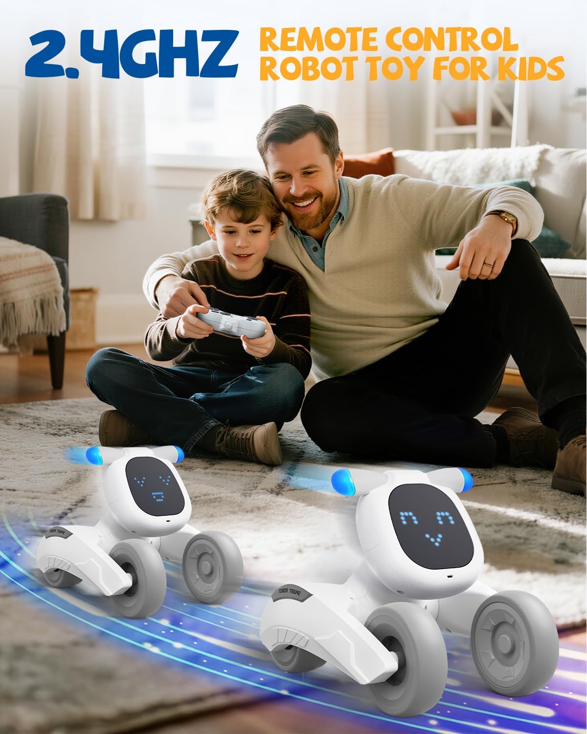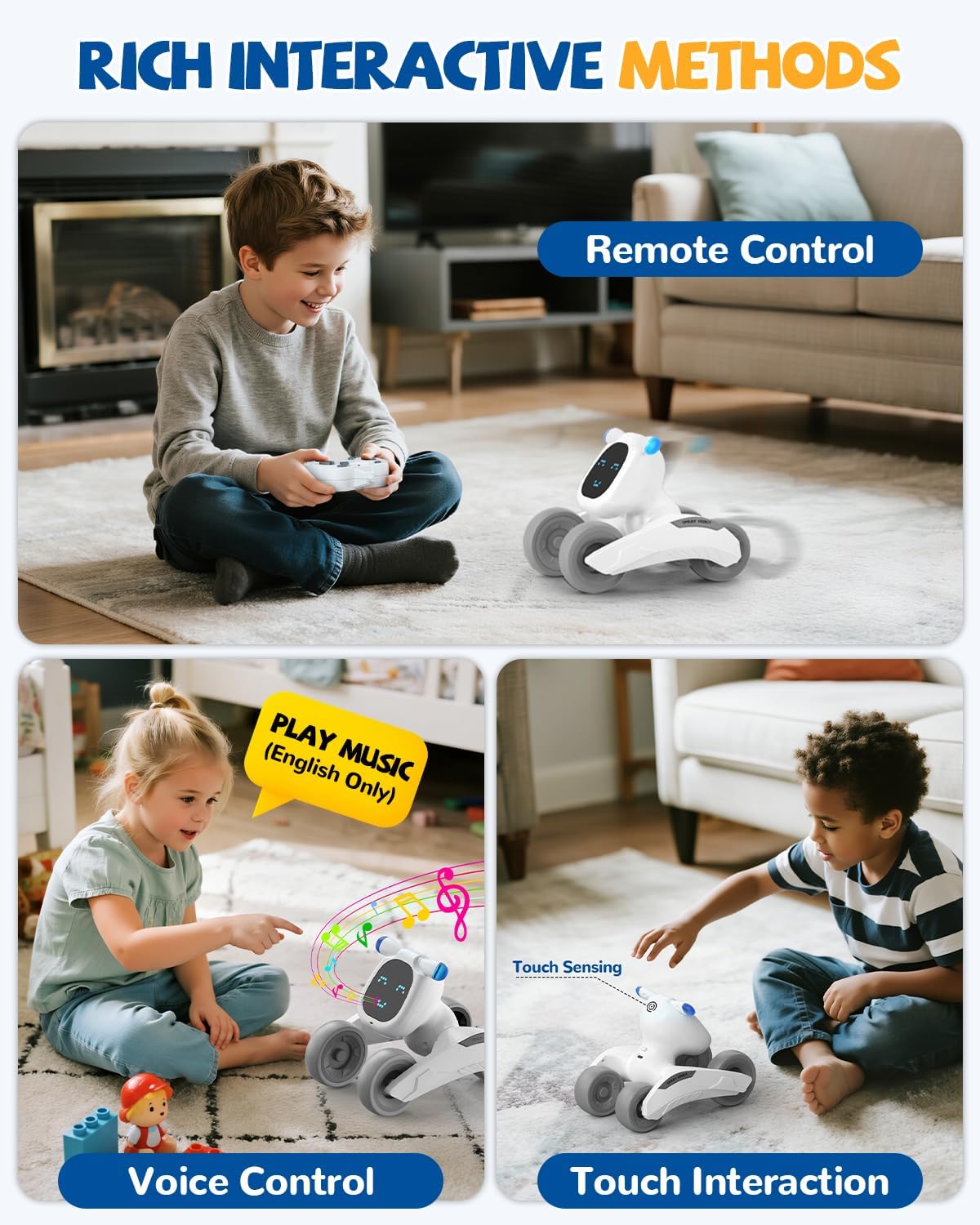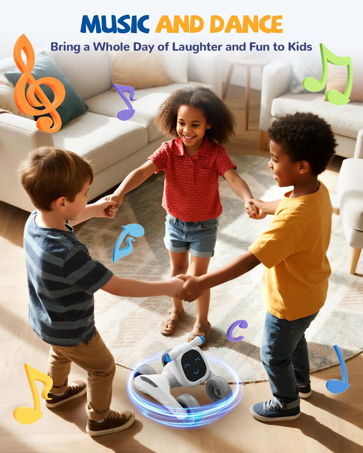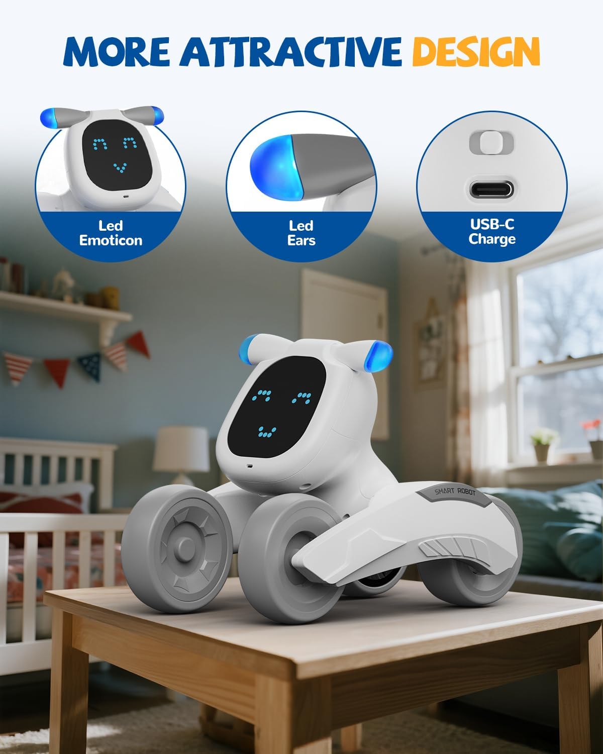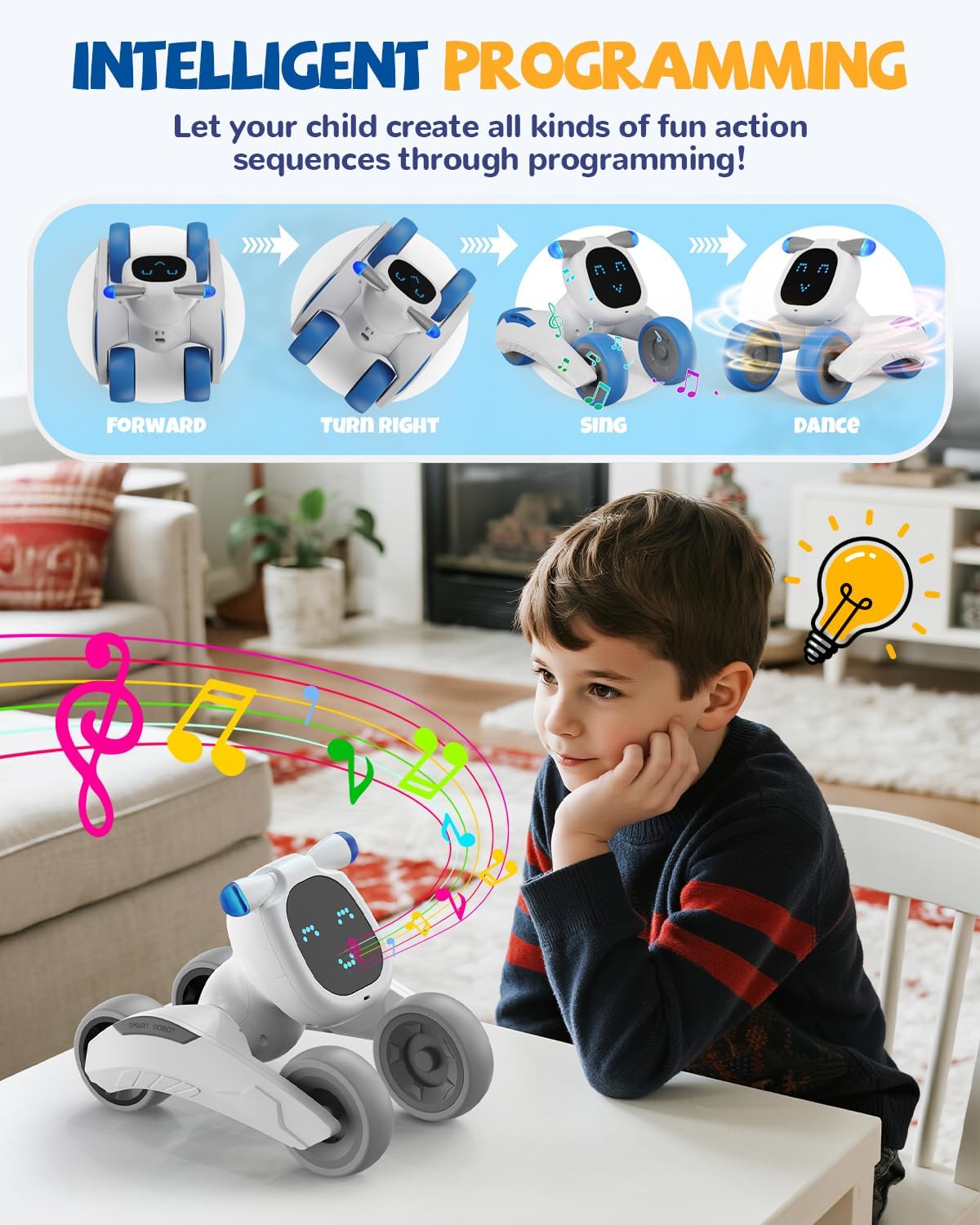 【Interazioni Varie】: Questo robot giocattolo per bambini supporta il controllo vocale (solo in inglese), il funzionamento tramite telecomando e i sensori tattili. Può muoversi rapidamente e con agilità in tutte le direzioni ed è dotato di una modalità programmabile. Non lasciatevi ingannare dal suo aspetto compatto: in modalità dimostrazione automatica, il robot giocattolo mostra anche i suoi incredibili talenti di ballerino. Riconosce fino a 11 comandi vocali (solo in inglese). Basta dire “Hey, Puppy” e il robot giocattolo reagirà immediatamente. 【Musica e Danza】: Il Robot Giocattolo canta e balla insieme al vostro bambino, con 14 canzoni e coreografie integrate, comprese canzoni di compleanno, di Natale, filastrocche e melodie classiche. Grazie ai sensori tattili, può cantare, ballare o reagire all’interazione del bambino in modo casuale, esprimendo diverse emozioni e movimenti. Ciò crea un’esperienza di gioco varia e interattiva, stimolando fantasia e creatività e garantendo divertimento per tutto il giorno. 【Occhi LED】: Le orecchie e gli occhi di questo Robot Bambini sono dotati di luci LED che possono esprimere una vasta gamma di emozioni – dalla gioia alla sorpresa fino alla curiosità. Gli effetti luminosi variabili rendono il Robot Telecomandato particolarmente vivace e interattivo, rendendo il gioco con i bambini ancora più coinvolgente. Quando canta o balla, le sue espressioni facciali cambiano in base all’azione, trasmettendo immediatamente la sua allegria ai bambini e trasformando ogni momento di gioco in un’esperienza felice. 【Batteria Ricaricabile】: Il Robot Giocattolo è dotato di una batteria ricaricabile e di diversi motori che garantiscono prestazioni solide. La batteria può essere facilmente ricaricata tramite USB – direttamente da una presa di corrente, da una power bank o dal collegamento a un computer. La protezione integrata contro il sovraccarico assicura una ricarica sicura. Così, i bambini hanno tutto il tempo per immergersi completamente nel gioco con il Robot Bambini, senza che la mancanza di energia interrompa il divertimento. 【Regalo Ideale per Bambini】: Questo Robot Telecomandato per bambini è il regalo perfetto per ragazzi e ragazze dai 3 ai 12 anni. Stimola fantasia e creatività, migliorando comunicazione e abilità pratiche. Che sia per il gioco quotidiano, picnic o attività all’aperto come il campeggio, il Robot Giocattolo rimane sempre un fedele compagno dei bambini. Il suo design accattivante lo rende un regalo eccellente per compleanni, Natale, Halloween e molte altre occasioni. Regalate al vostro bambino un’esperienza indimenticabile piena di gioia e divertimento con questo Robot Bambini.