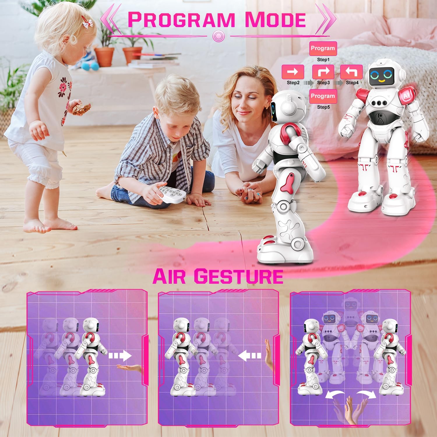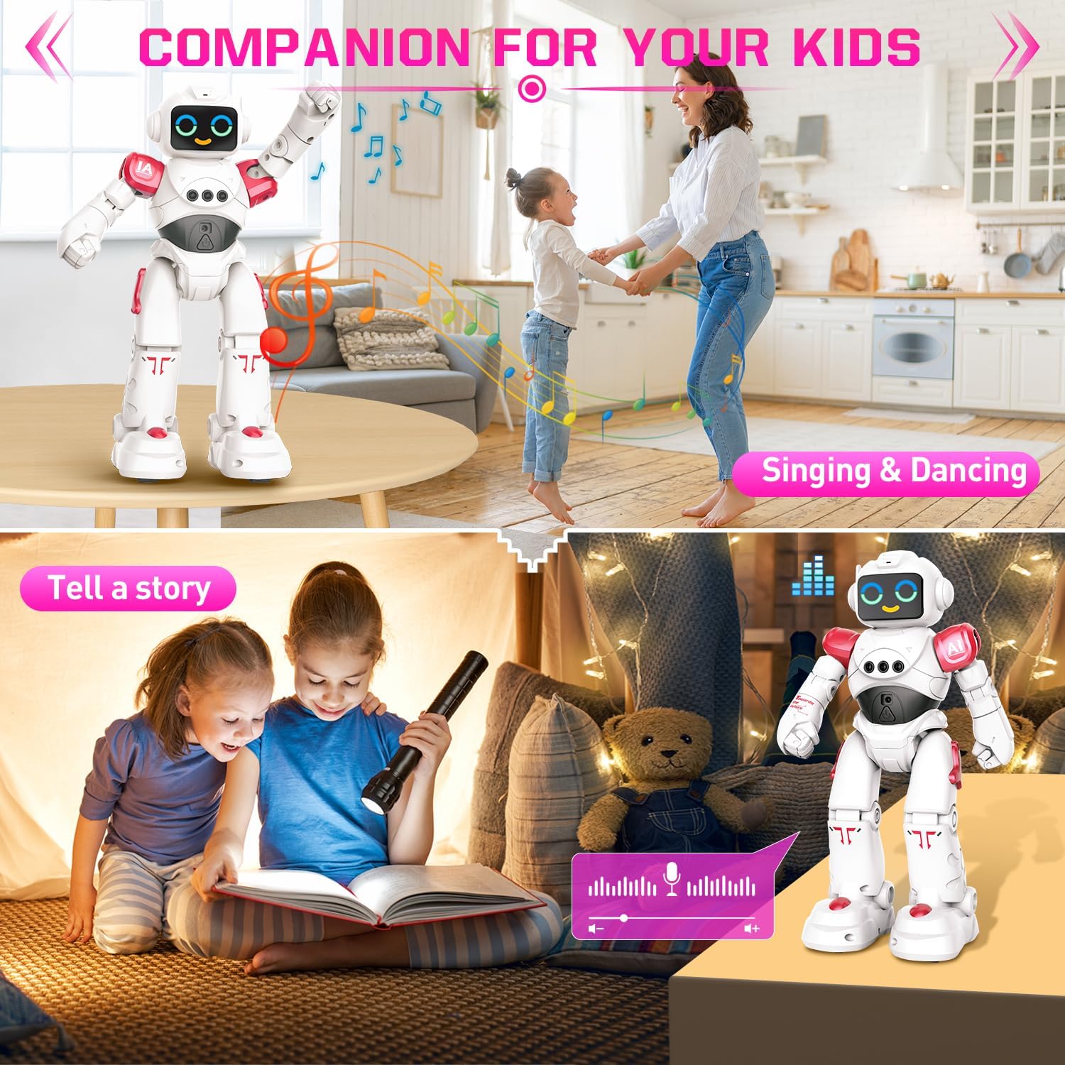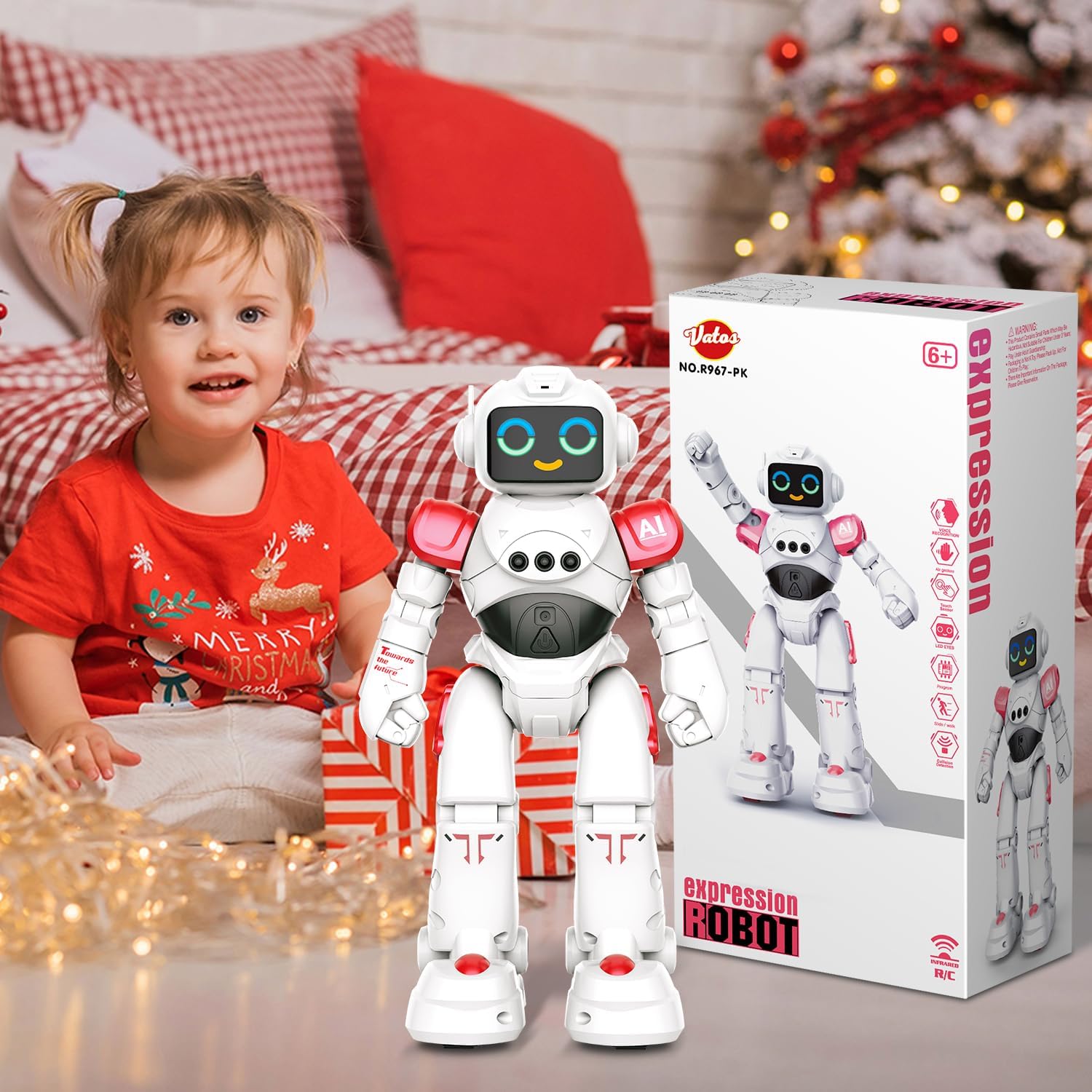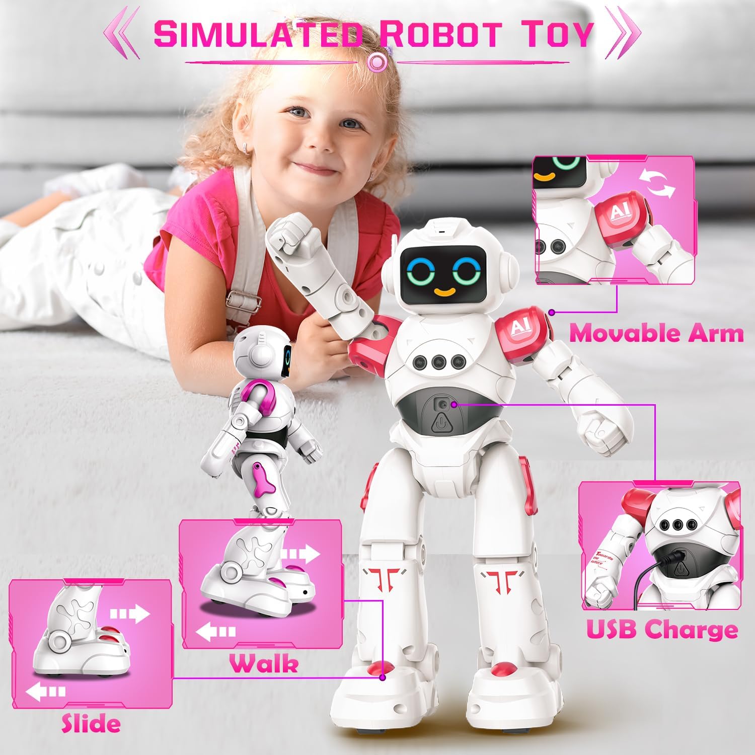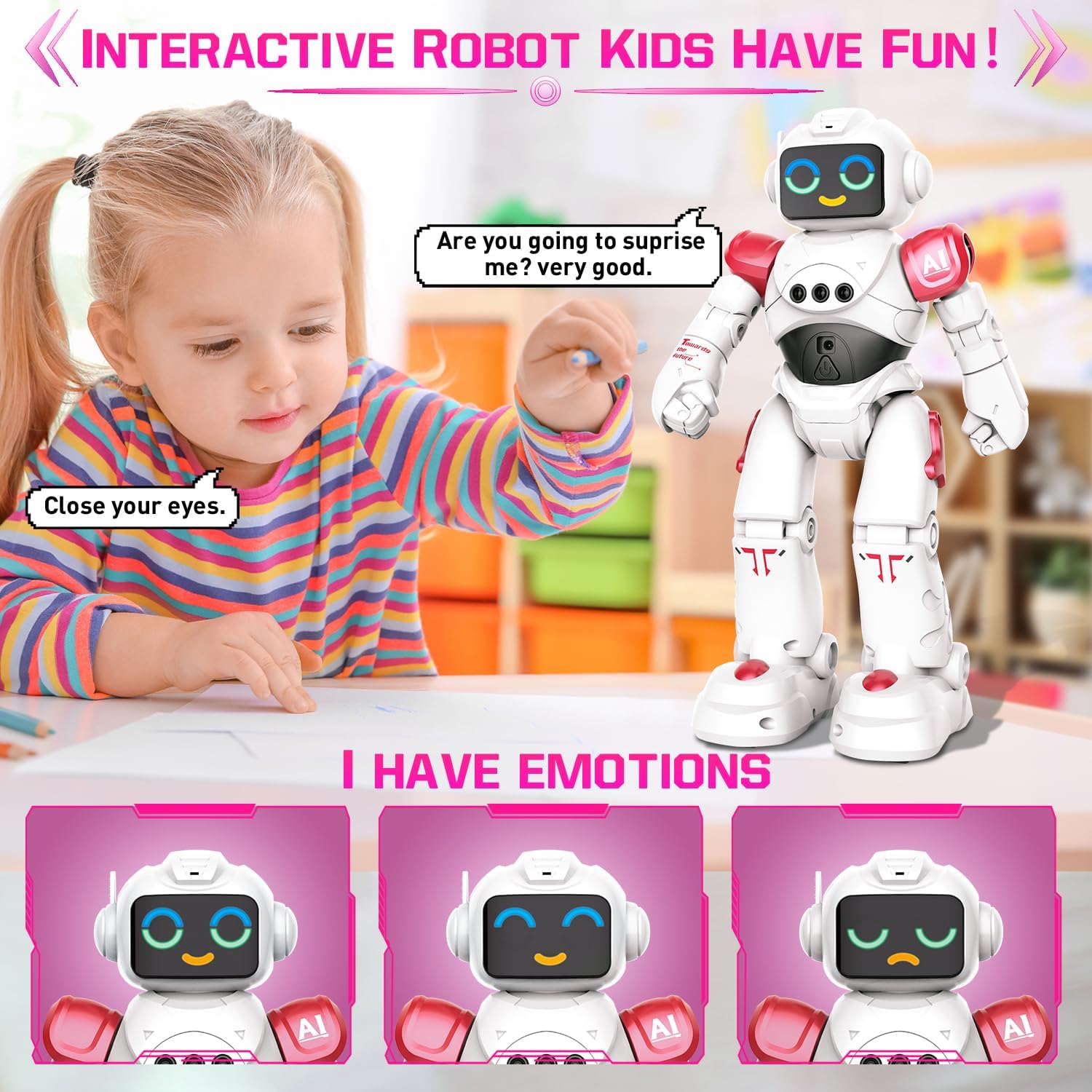 Smart Talking & Repeat - Impegnati in conversazioni con il robot mentre risponde al tuo comando vocale, creando un'interazione dinamica. Utilizzo del telecomando, emissione di comandi specifici e testimonianza di azioni istantanee. Premi il pulsante "Ripeti" Il robot ripete quello che dici. Elevando l'intrattenimento, il robot è una fonte di coinvolgimento dinamico. Gesture Sensing Programmabl Robot - L'integrazione del rilevamento dei gesti consente di comandare intuitivamente i movimenti e le azioni del robot attraverso semplici gesti delle mani. Inoltre, la sua funzione di azioni programmabili ti consente di coreografare sequenze uniche, infondendo le tue interazioni con creatività personale. Robot ha giunti mobili che gli permettono di ottenere pose realistiche. Due stili di camminata distinti, camminata tradizionale e scorrimento fluido aggiungono un ulteriore livello di intrigo ai suoi movimenti. Robot Emo ricaricabile con funzione touch - Le innovative espressioni oculari elettroniche del robot danno vita alla sua personalità con tre espressioni distinte. Questa comunicazione visiva aggiunge profondità alle tue interazioni. Migliorando il coinvolgimento emotivo, l'area toracica del robot è sensibile al tocco, rispondendo con reazioni giocose ai tuoi tocchi delicati. Il giocattolo robot per bambini è ricaricabile tramite USB, design intuitivo ulteriormente consolidare la sua posizione di compagno tecnologicamente avanzato e sicuro. Dance & Tell Story - Balla alla musica, creando affascinanti routine di danza. La capacità di raccontare storie del robot offre non solo divertimento ma anche valore educativo. Dotato di una tecnologia avanzata di prevenzione degli ostacoli, il robot naviga autonomamente nell'ambiente circostante, garantendo un viaggio sicuro e prevenendo collisioni indesiderate con oggetti. Sicuro per i bambini: realizzato meticolosamente con materiali durevoli e di alta qualità, il robot presenta un esterno esteticamente gradevole e durevole. Gli effetti di illuminazione a LED integrati contribuiscono al suo fascino visivo, esaltandone il fascino durante le interazioni.