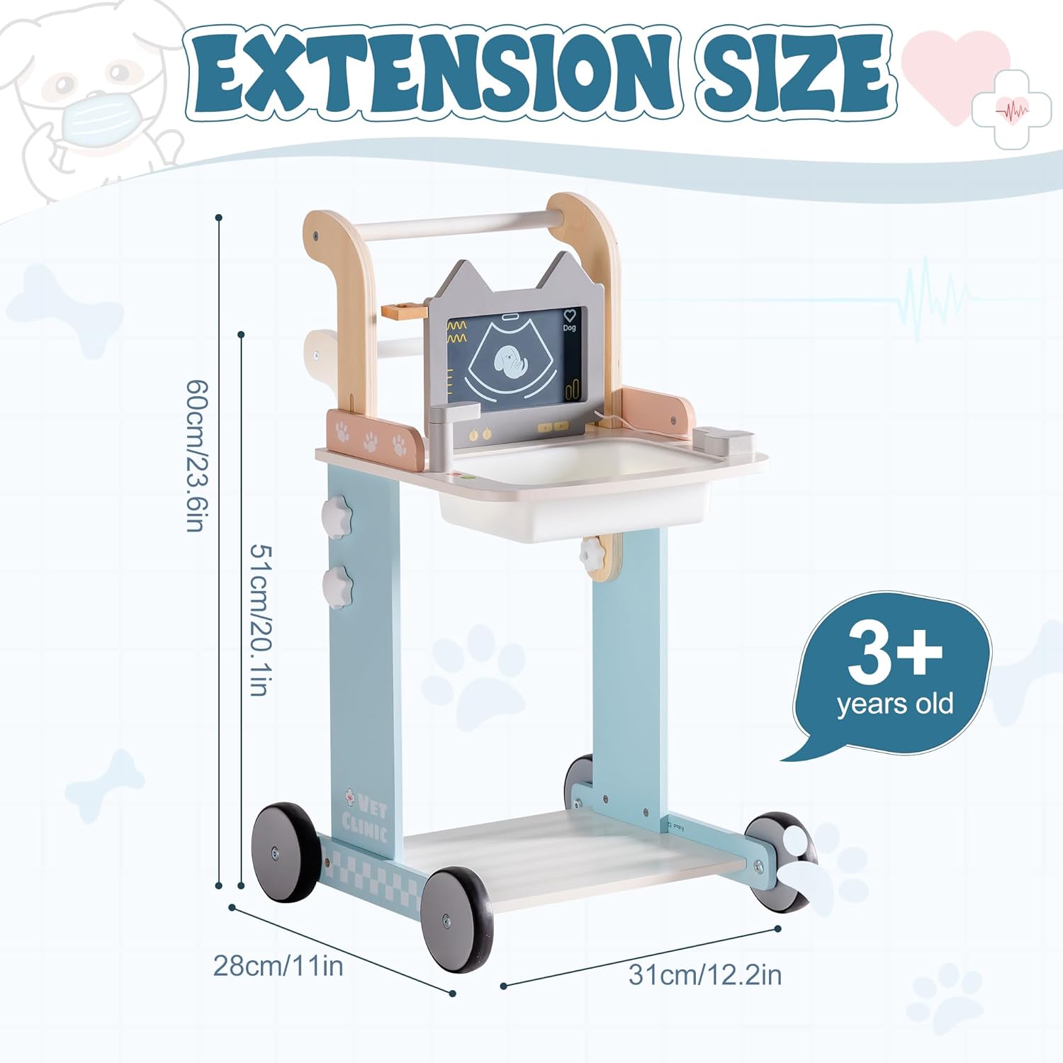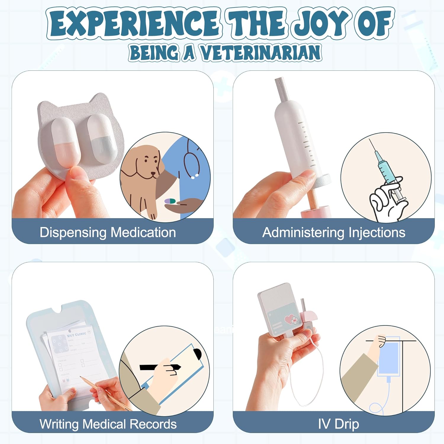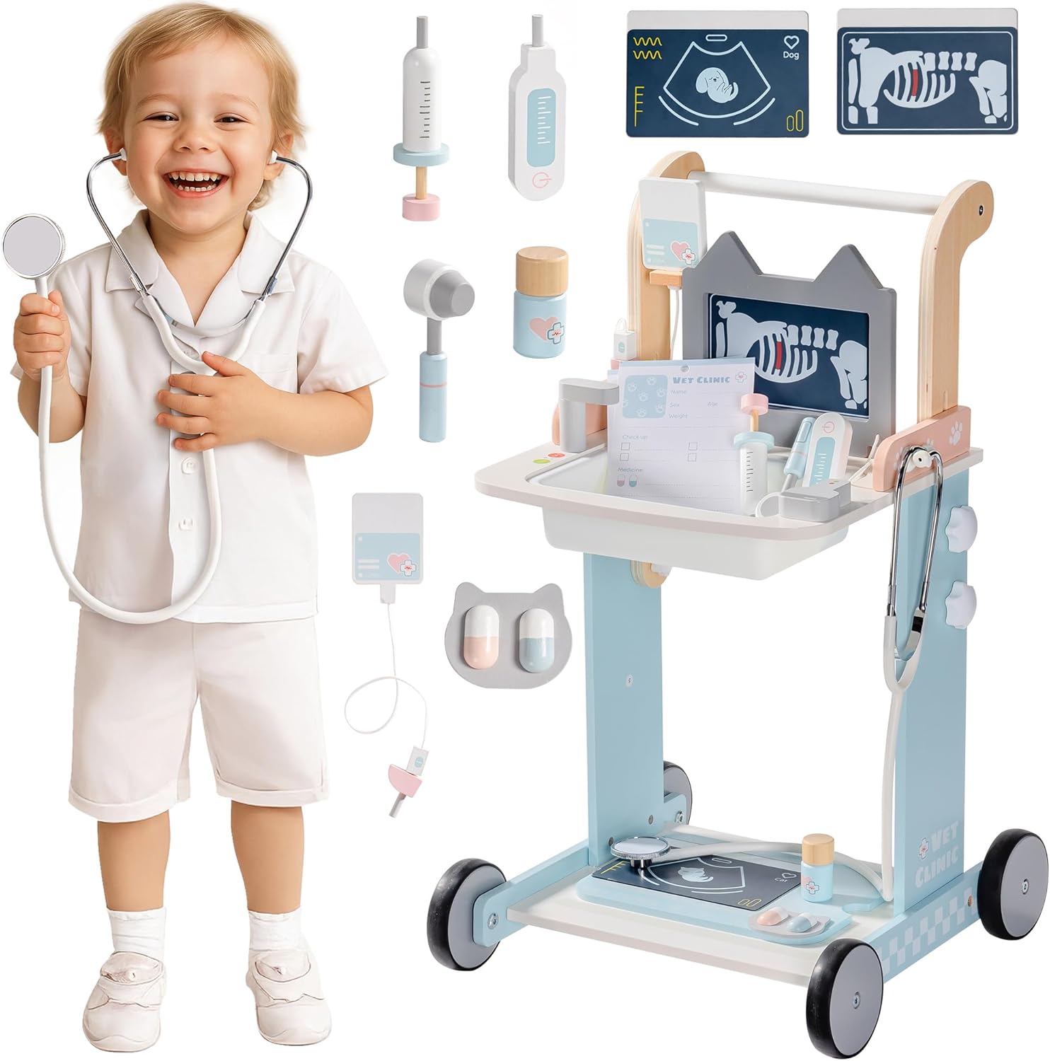 Clinica veterinaria completa con strumenti realistici: il set contiene più di 10 pezzi, tra cui uno schermo a raggi X funzionante, stetoscopio, siringa, termometro, martello riflettente e altro ancora: tutto ciò di cui i bambini hanno bisogno per essere un vero veterinario! Schermo interattivo a raggi X per una diagnosi pratica: la schermata a raggi X consente ai bambini di eseguire esami fittizi ed esplorare le "frattaglie" dei loro pazienti animali. Perfetto per introdurre i bambini nel mondo delle cure veterinarie Stimola la creatività e l'empatia: questo set da gioco veterinario incoraggia i bambini a prendersi cura dei loro "pazienti", a sviluppare empatia, responsabilità e comprensione dell'importanza della salute degli animali attraverso un gioco fantasioso. Ideale per giochi di gruppo e abilità sociali: i bambini possono lavorare insieme e assumere alternativamente il ruolo di veterinario o paziente. Ciò promuove il lavoro di squadra, la comunicazione e le capacità di risoluzione dei problemi in un ambiente interattivo. Design durevole e sicuro: realizzato con materiali atossici di alta qualità, questo set veterinario è costruito per sicurezza e divertimento duraturo. Adatto per bambini dai 3 anni in su, è pronto per ore di gioco fantasioso. Regalo perfetto per gli amanti degli animali: un regalo meraviglioso per feste di compleanno, vacanze o qualsiasi occasione. Questo set è ideale per i bambini che amano gli animali, amano i giochi di ruolo e si divertono creativamente. Lasciali immergersi nel mondo dell'assistenza veterinaria con la propria clinica!