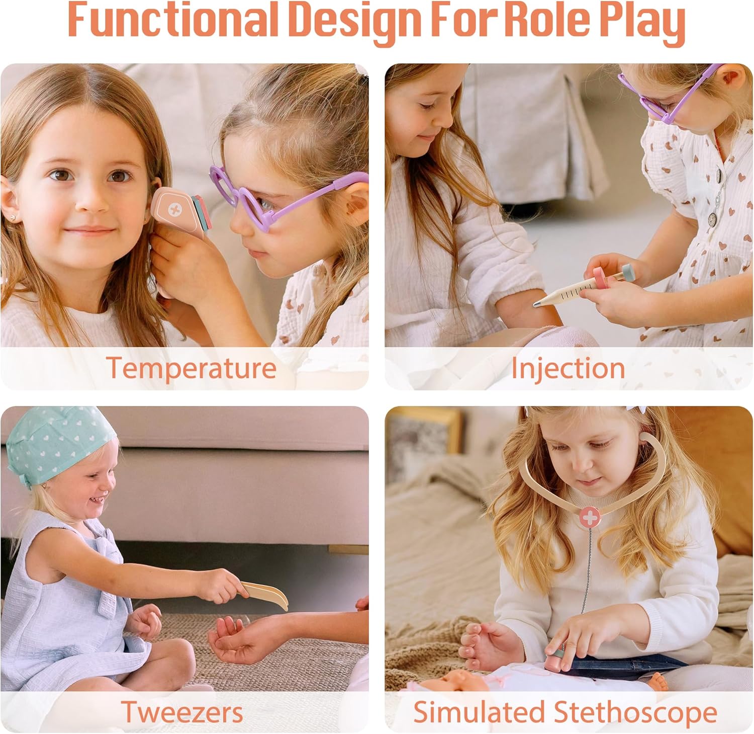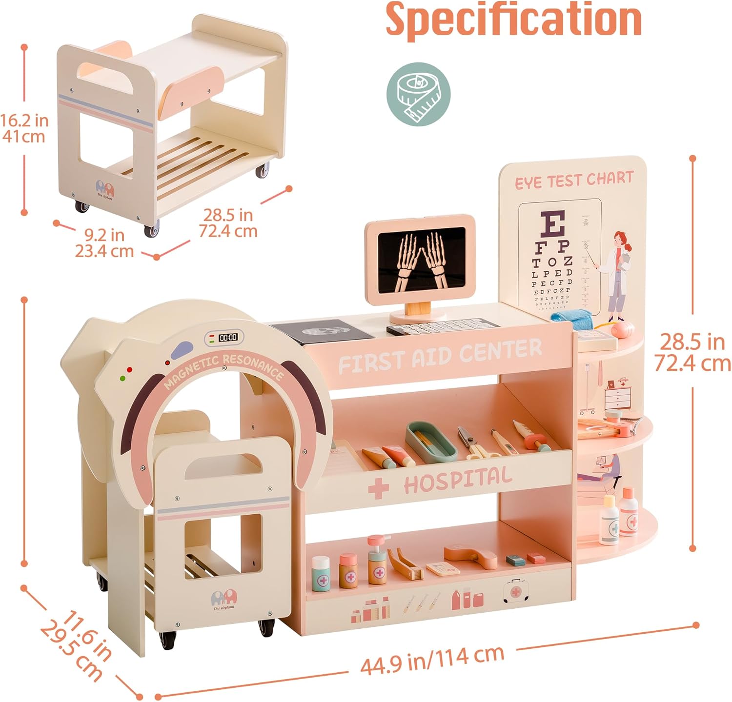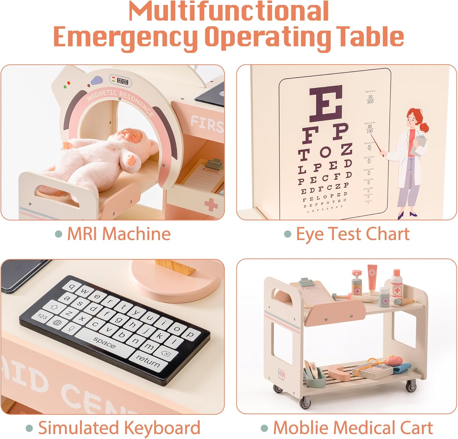 Kit giocattolo medico creativo per emozionanti giochi di ruolo: il centro di attività mediche in legno offre ai bambini un ambiente realistico con risonanza magnetica, controllo visivo ed elementi interattivi. Ideale per giochi di ruolo fantasiosi che incoraggiano la convivenza sociale. Attrezzatura medica versatile: include stetoscopio, siringa, flacone di medicinali, forbici, pinzette, misuratore di pressione sanguigna e termometro, il set di giocattoli medici offre tutto ciò di cui i piccoli medici hanno bisogno per gli esami. Gli accessori dettagliati garantiscono un'esperienza di gioco realistica. Design realistico con elementi interattivi: i bambini possono eseguire test della vista, gestire le cartelle cliniche dei pazienti o visualizzare le radiografie. Il design accurato con dettagli in legno crea un'autentica atmosfera da studio medico che delizierà i bambini. Promuove l'empatia e la creatività: questo set di giocattoli medici aiuta i bambini a mettersi nei panni di un medico, a migliorare le loro capacità comunicative e a sviluppare l'empatia. Perfetto per i giochi di ruolo da soli o con gli amici. Regalo perfetto per i piccoli dottori dai 3 anni in su - Un giocattolo per giochi di ruolo di alta qualità, ideale per compleanni, Natale o occasioni speciali. Con numerose funzioni e dettagli accurati garantisce un piacere di gioco duraturo