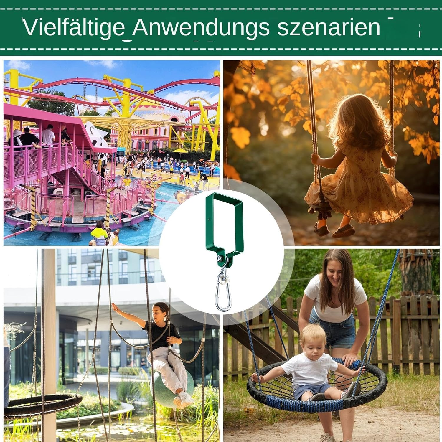 Costruzione stabile: grazie alla robusta struttura in acciaio, queste grucce altalena resistono in modo ottimale agli effetti delle intemperie e sono perfette per l'uso esterno a lungo termine. Mantengono la loro integrità strutturale per anni e forniscono un supporto affidabile. Incoraggia il gioco all'aperto: il design aggiunge vivacità e incoraggia i bambini a fare più esercizio all'aria aperta, con la tonalità adattabile del verde che si fonde armoniosamente con la natura. Dimensioni ottimali: 14,5 cm di lunghezza x 9,5 cm di larghezza con 3 cm di spessore del materiale (5,7" x 3,74" x 1,18") creando una perfetta compatibilità con le altalene standard. Consente un facile montaggio e stabilità a lungo termine senza disturbare il gioco. Multiuso: ideale per altalene, adatto per strutture da arrampicata e altalene per alberi. Queste robuste sospensioni garantiscono durata per le attività all'aperto, aumentano il divertimento in giardino e promuovono il gioco creativo. Perfetto per versatili applicazioni all'aperto. Facile da montare senza uno specialista: tutto necessario l'hardware di assemblaggio è incluso per un facile assemblaggio e un utilizzo affidabile