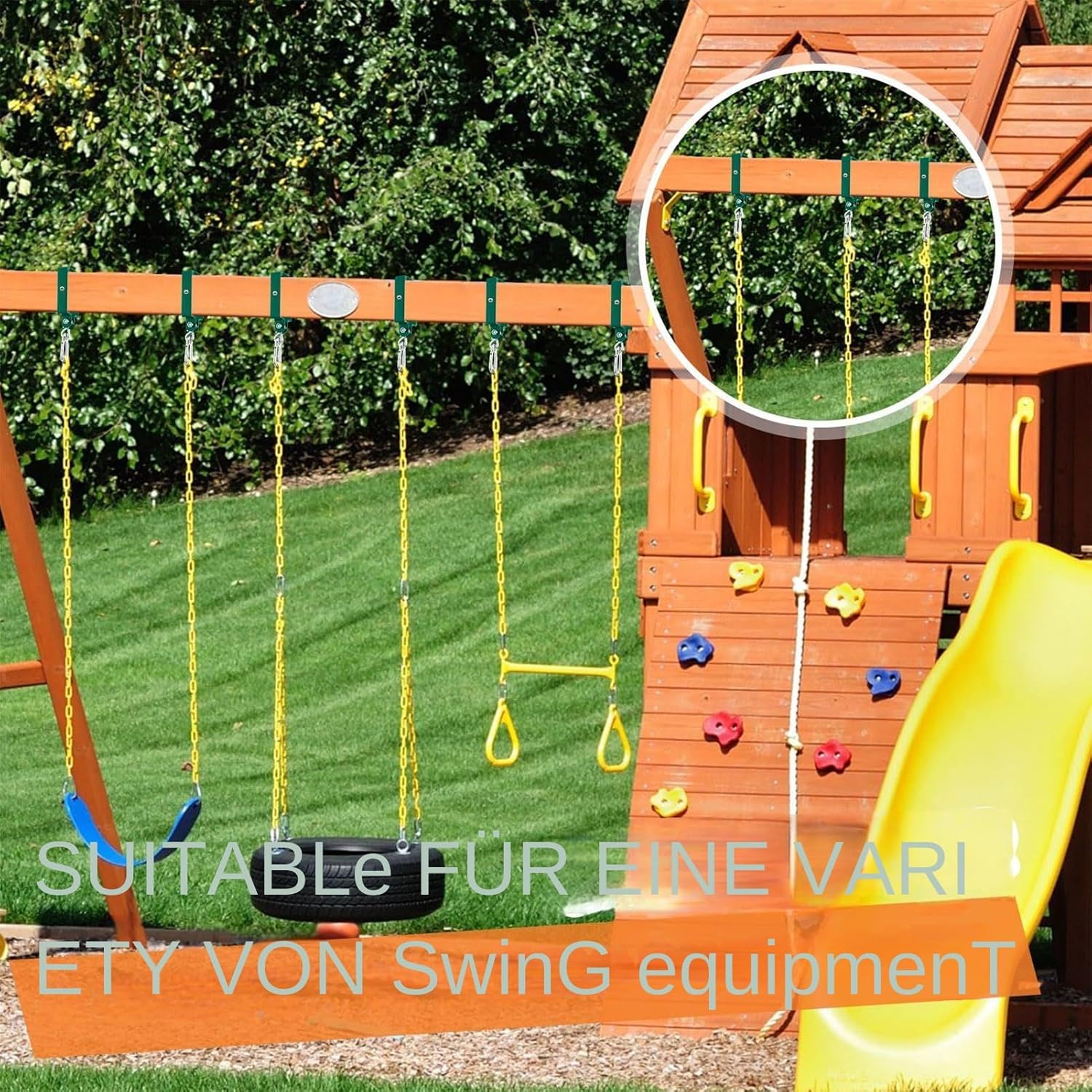 Durata affidabile: queste grucce oscillanti combinano acciaio di grosso spessore con proprietà resistenti alle intemperie per prestazioni costanti in ambienti difficili. Non mostrano alcun deterioramento e sono ideali per l'uso esterno a lungo termine. Incoraggia il gioco all'aperto: il design aggiunge vivacità e incoraggia i bambini a fare più esercizio all'aria aperta, con la tonalità adattabile del verde che si fonde armoniosamente con la natura. Dimensioni ottimali: 14,5 cm di lunghezza x 9,5 cm di larghezza con 3 cm di spessore del materiale (5,7" x 3,74" x 1,18") creando una perfetta compatibilità con le altalene standard. Consente un facile montaggio e stabilità a lungo termine senza disturbare il gioco. Utilizzo completo: soluzione ottimale per le sospensioni dell'altalena su set da gioco e altalene sugli alberi. Il design solido supporta divertimento in giardino di lunga durata e idee di gioco creative. Consente progetti esterni versatili grazie alla costante adattabilità in tutte le condizioni atmosferiche. Montaggio senza problemi: include tutti i componenti di sospensione necessari per un'installazione intuitiva ed efficiente, senza servizi professionali: ogni passaggio è autoesplicativo