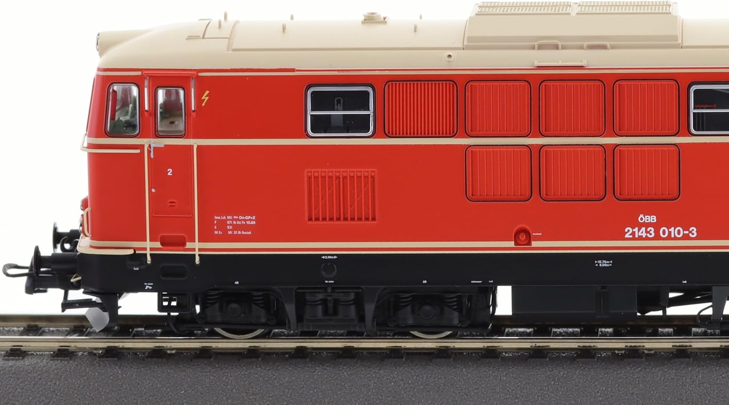 - Frizione: pozzo NEM 362 con cinematica KK - Raggio minimo: 358 mm - Massa volanica: sì - Numero assi azionati: 4 - Numero di assi con pneumatici aderenti: 1 - Numero articolo: 70073 - Traccia: H0 - Epoca: IV - Società ferroviaria: ÖBB - Motore: 5 poli. Motore – Luce di picco: 3 luci di picco / 2 luci posteriori, dipendente dalla direzione di marcia – Luce di picco LED: sì – Funzione luce aggiuntiva: sì – Sistema di alimentazione: DC analogico – Interfaccia: interfaccia elettrica per veicoli di trazione PluX22 – Lunghezza tramite buffer: 181 mm