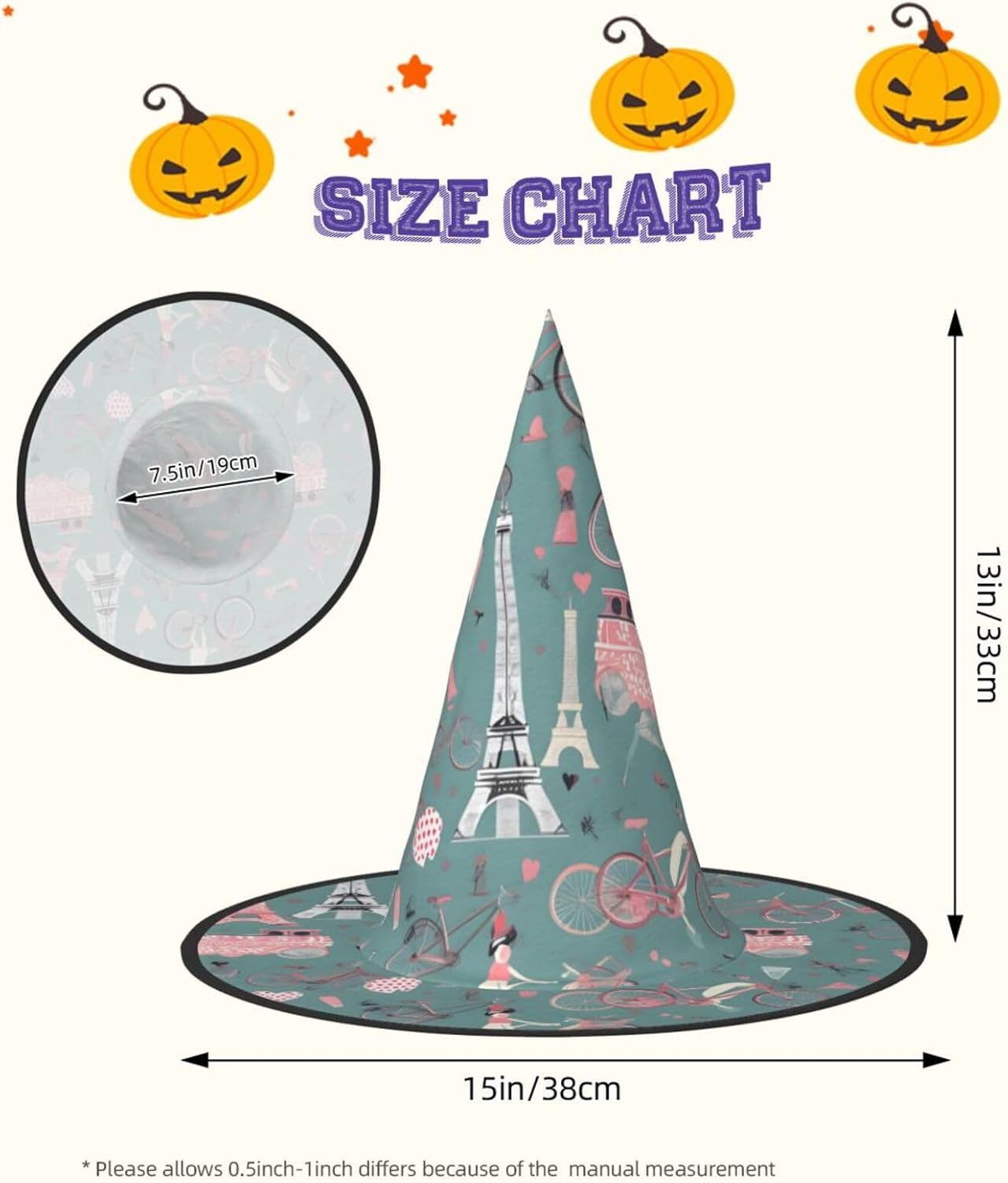 Realizzati in tessuto Oxford di qualità superiore, i nostri cappelli romantici con stampa di biciclette con Torre Eiffel di Parigi garantiscono durata e longevità. Il design unico consente di ridurre al minimo la parte superiore del cappello e i bordi di essere attorcigliati e piegati, rendendo i cappelli salvaspazio e facilmente portatili. Ogni cappello romantico con stampa di biciclette con Torre Eiffel di Parigi è generosamente dimensionato per adattarsi alla maggior parte delle persone ed è leggero per un uso confortevole. Si prega di leggere la tabella delle taglie prima di effettuare l'ordine. Il design versatile dei nostri cappelli da strega di Halloween con stampa romantica Torre Eiffel di Parigi li rende perfetti per varie occasioni. Sono lavabili in lavatrice e ad asciugatura rapida per una facile manutenzione.