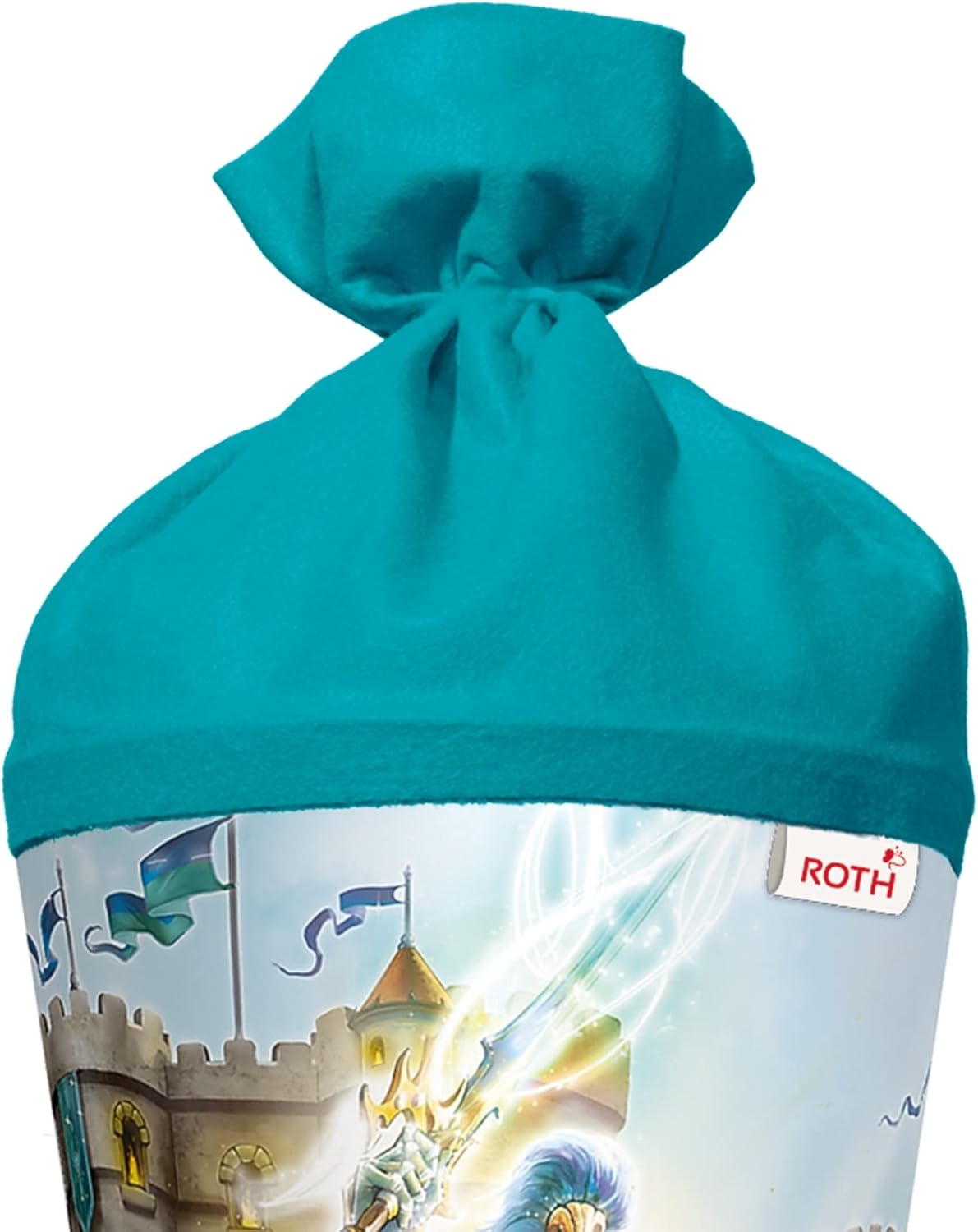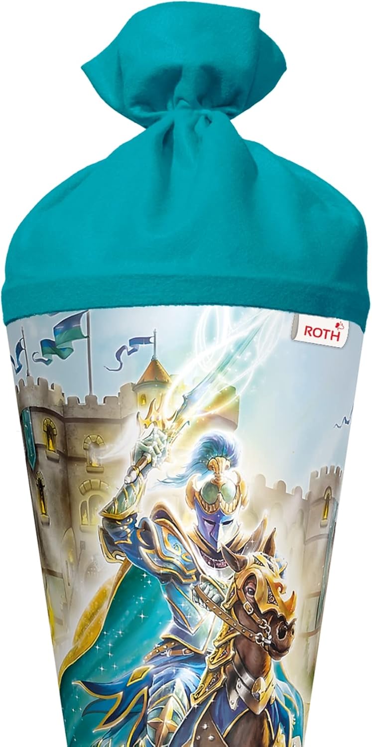 Cono per la scuola con motivo cavalieri per bambini Il cono è alto 70 cm, rotondo e chiuso con feltro blu Nel galoppo, il cavaliere tempesta in una magnifica armatura sul suo cavallo di Drachenburg Con la spada sollevata, dichiara battaglia a tutte le future note negative. Il cono è illustrato a mano. Prodotto di qualità della casa ROTH in Sassonia