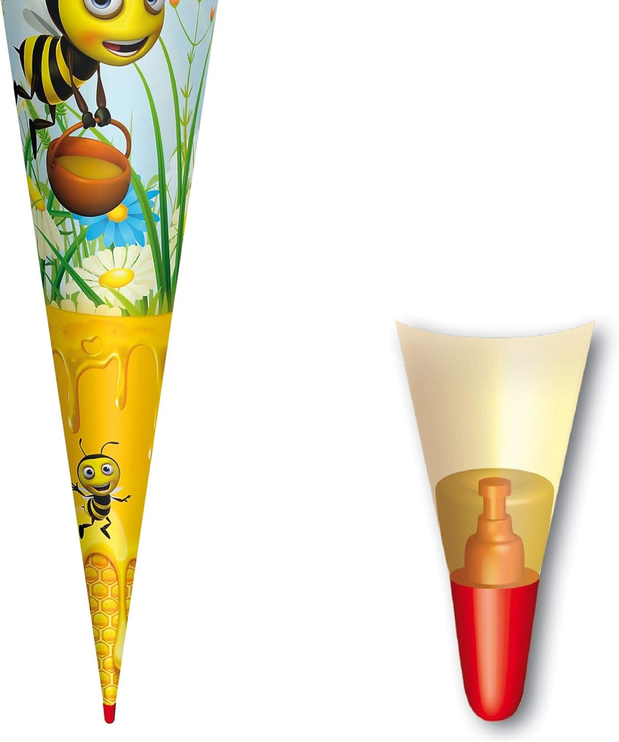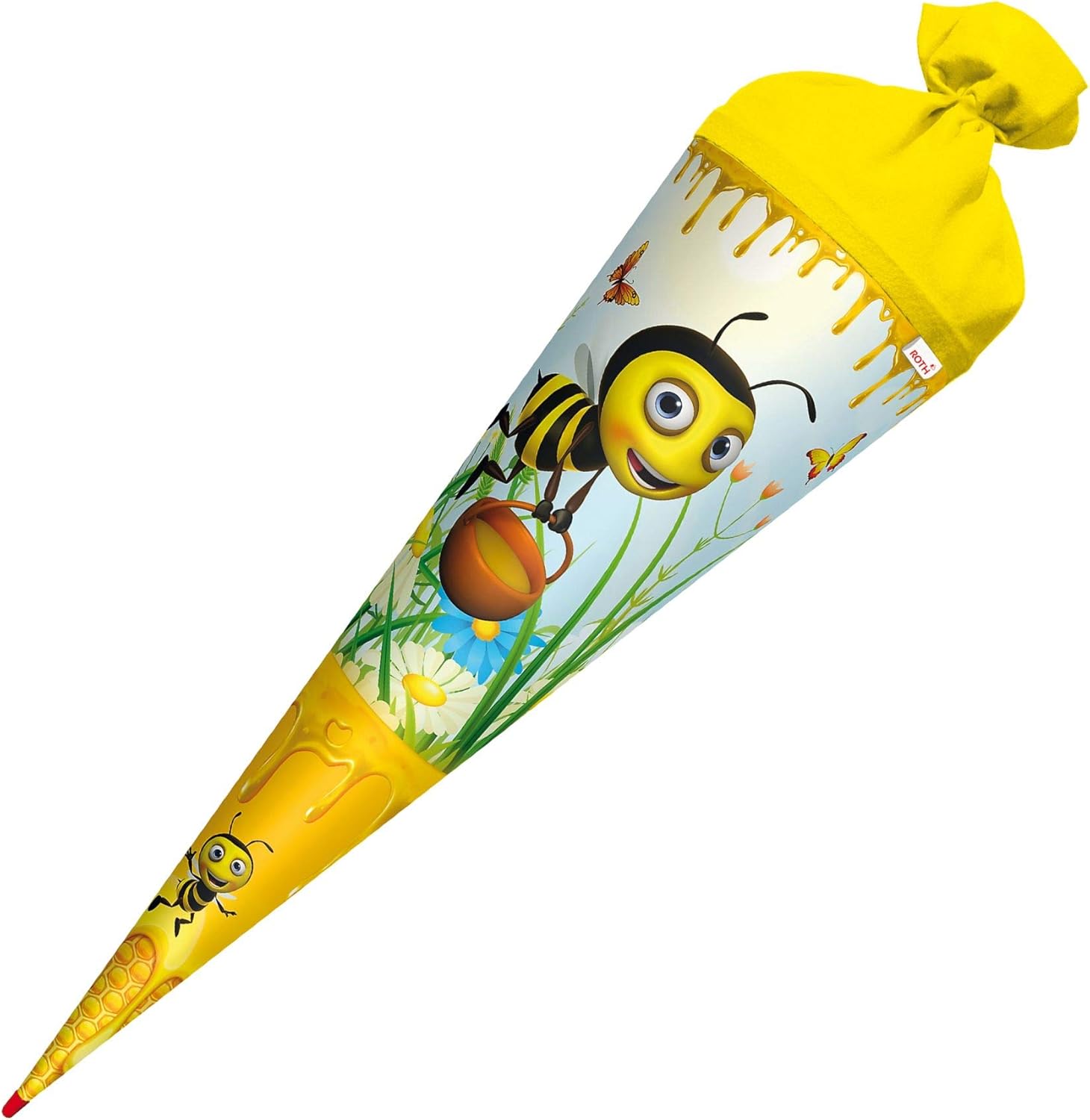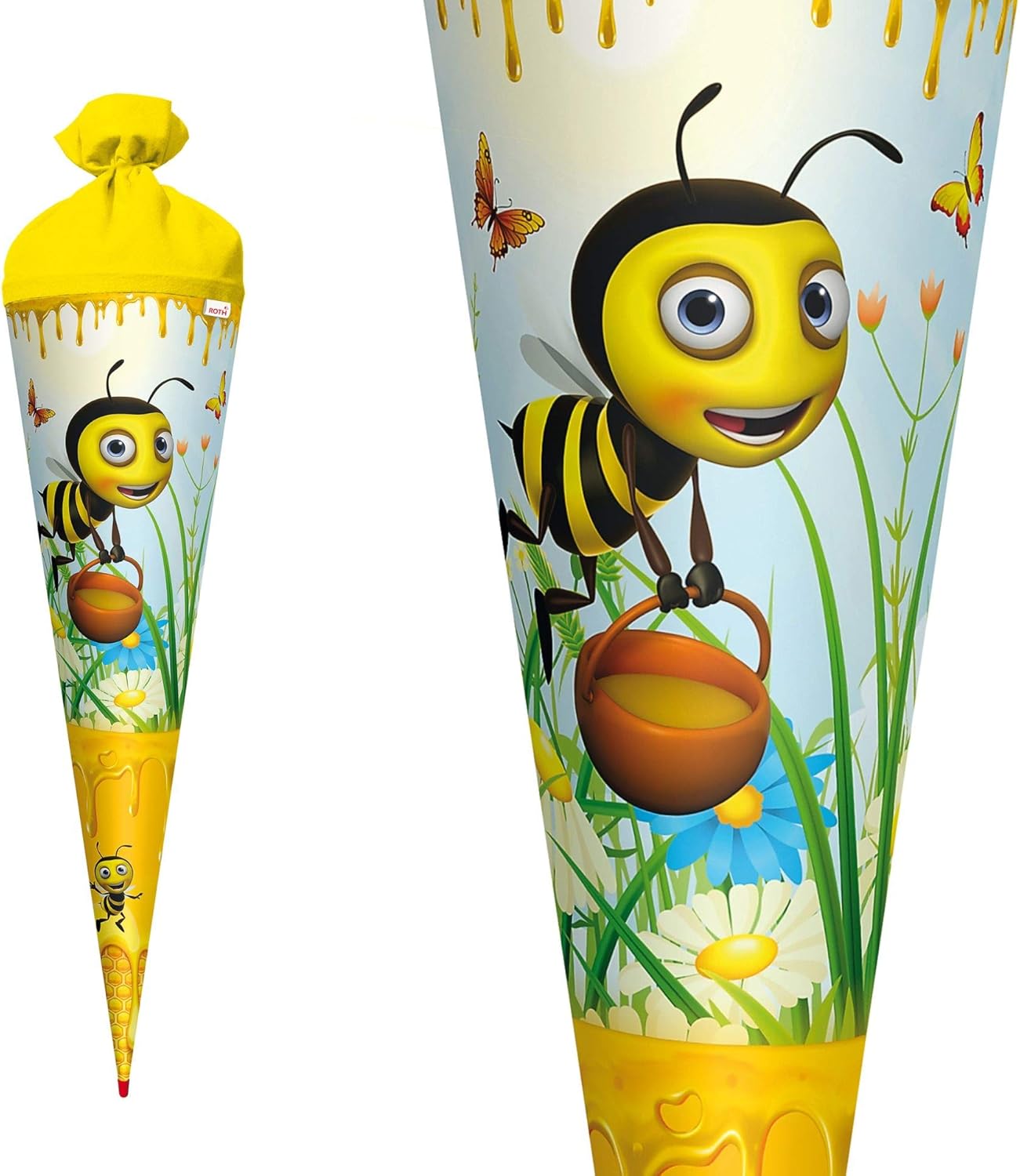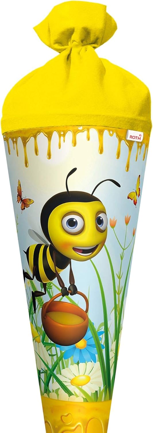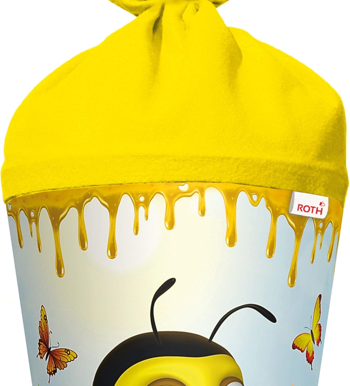 Cono scolastico di alta qualità con motivo ape, adatto sia per bambini che per bambine. Una bella combinazione di colori in giallo e verde rende il cono da 70 cm molto speciale Una scena affettuosa con ape su un prato fiorito per l'inizio della scuola Sacchetto di zucchero per la scuola con chiusura in feltro e punta in legno stabile Prodotto di qualità del marchio ROTH in Sassonia