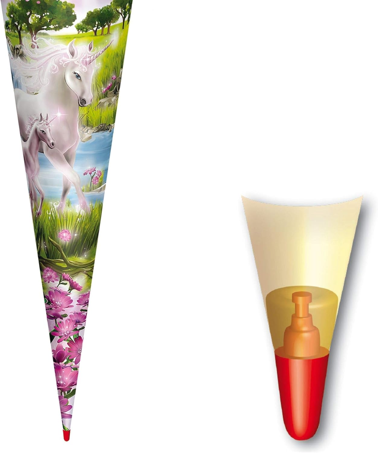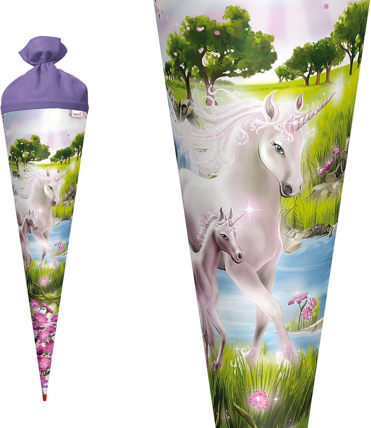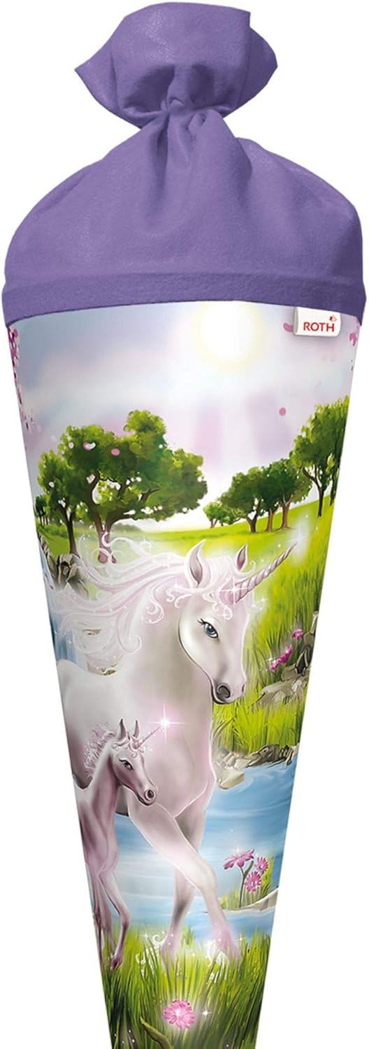 Cono per la scuola delle bambine. Motivo: unicorno e puledro Forma: rotonda. Dimensioni: 70 cm. Chiusura in feltro Spazio sufficiente per dolci e piccoli pensieri per i bambini.