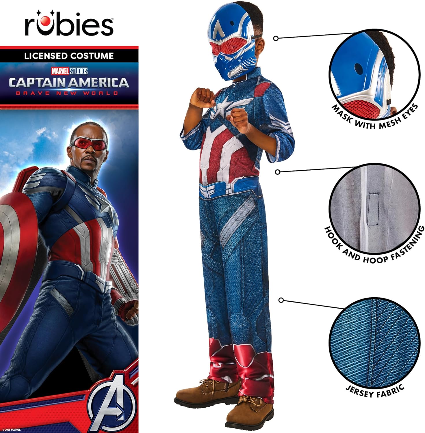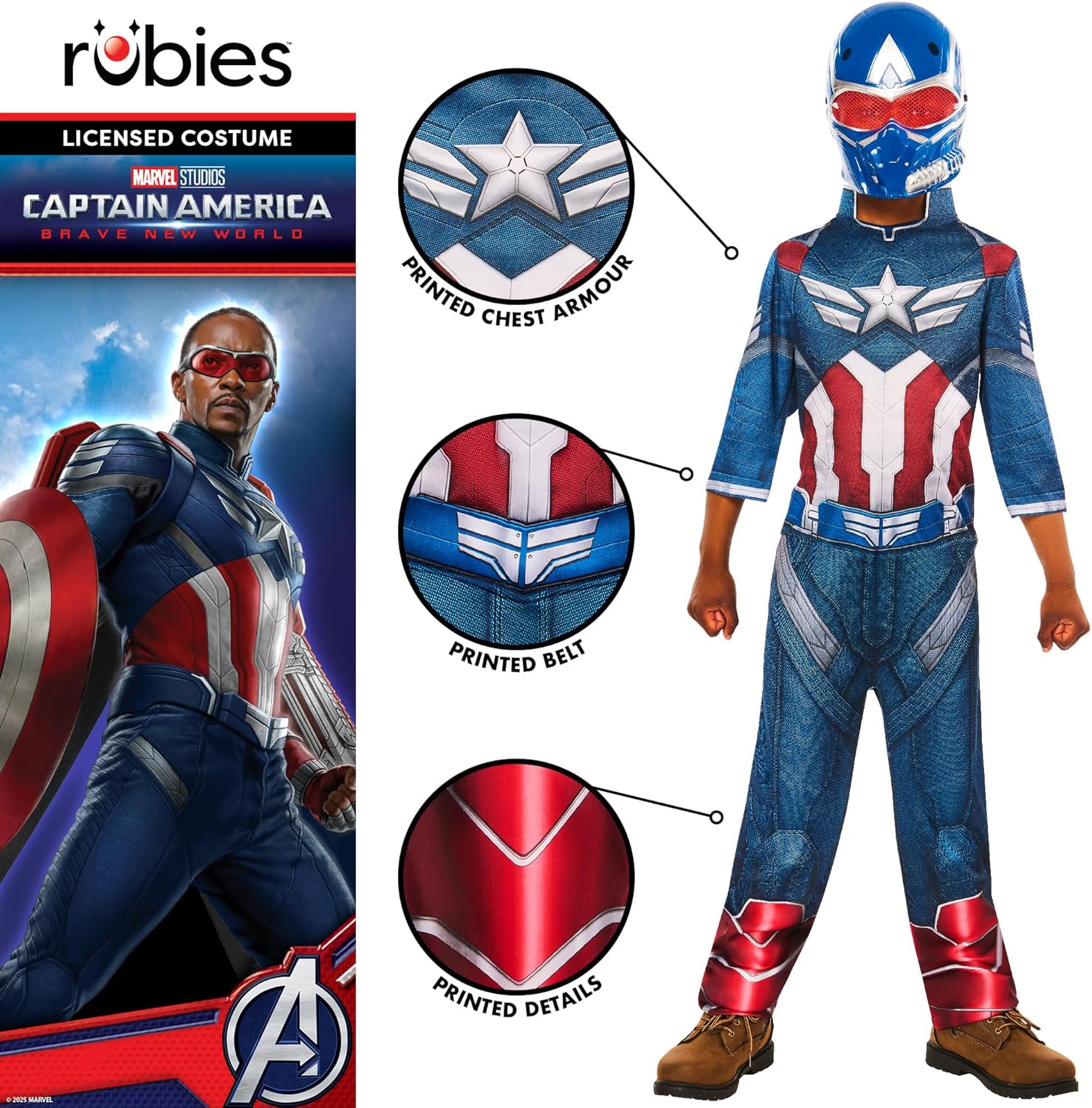 Descrizione Trasforma il tuo bambino in un supereroe Capitan America con questo costume Brave New World e la sua maschera abbinata. Progettato con materiali di qualità, questo costume del famoso Avengers è fedele al design iconico di Captain America con i suoi colori blu e rosso e il logo a stella sul busto. È progettato per adattarsi a ogni bambino grazie alle diverse dimensioni proposte, offrendo una vestibilità comoda per un'esperienza di gioco ottimale. La maschera è dotata di una fascia elastica sul retro, che permette al bambino di metterla e toglierla facilmente. Che si tratti di feste in costume di Halloween, compleanni a tema supereroi o sfilate di carnevale, questo costume è perfetto per giocare i supereroi in ogni circostanza. Lascia che tuo figlio incarni il suo supereroe preferito e vivi avventure emozionanti. Regalagli questo set di travestimenti ufficiale Marvel Captain America Brave New World e fai brillare la sua immaginazione. Avviso di sicurezza Non adatto a bambini di età inferiore ai 3 anni