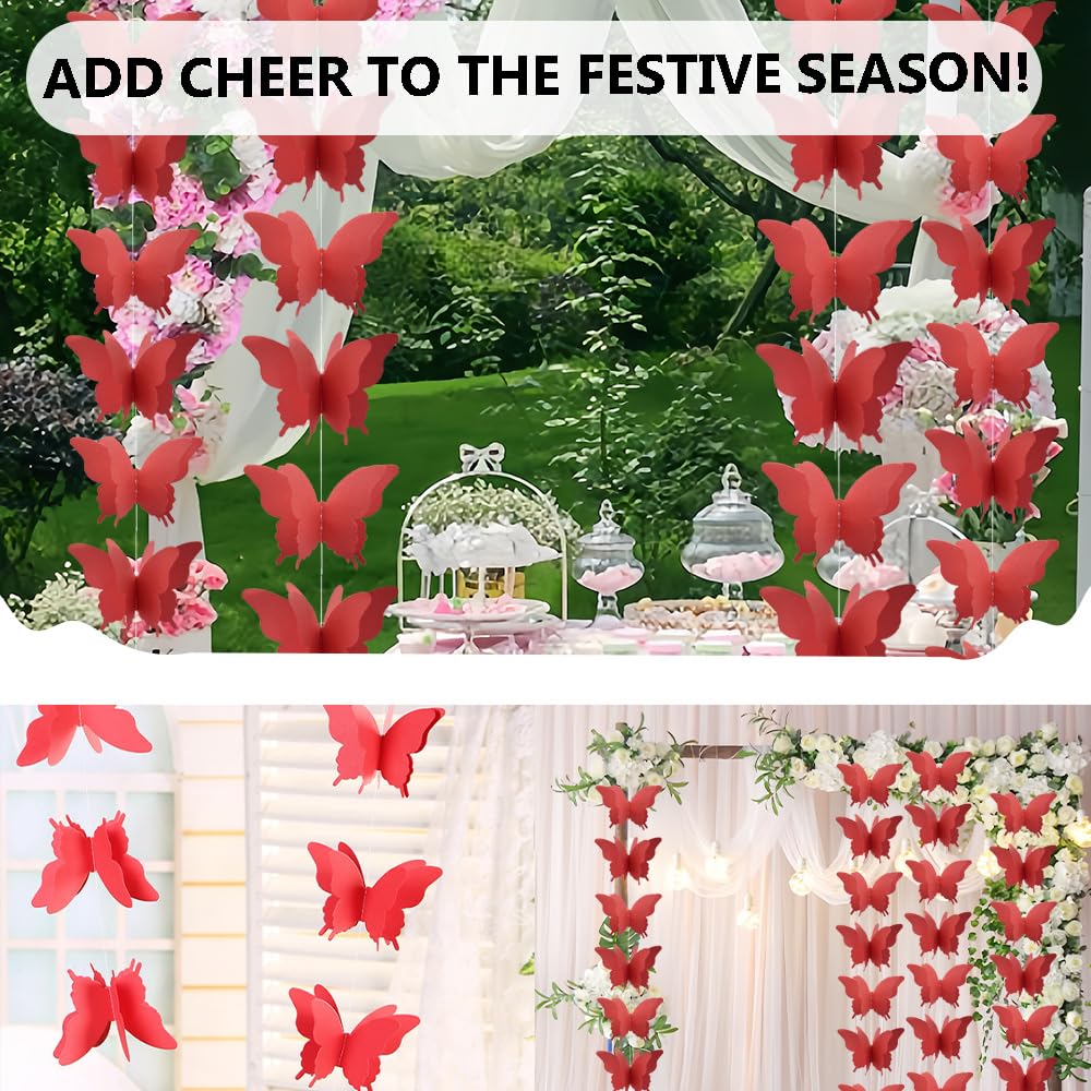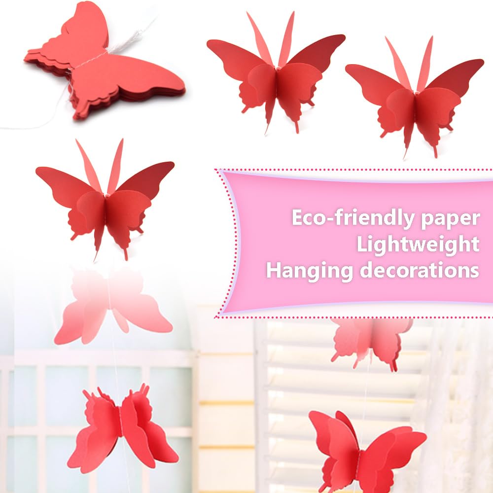 Farfalle appese a stelle filanti per feste Ghirlanda di carta a farfalla Decorazione da appendere 【Materiale】 La carta da appendere con farfalle è realizzata in carta di alta qualità, ecologica e durevole. Dimensioni: la dimensione delle farfalle è di circa 12 x 8,5 cm, ogni pezzo ha circa 18 farfalle, la lunghezza totale di ogni pezzo è di circa 2,8 m. Colore: Rosso, Quantità: 4 pezzi 【Applicazione】 La carta da appendere con farfalle è adatta a tutti i tipi di feste e celebrazioni, come feste di matrimonio, baby shower, feste di compleanno, feste di matrimonio, decorazioni natalizie, puoi anche usare queste decorazioni in mongolfiera per decorare le tue stanze dei bambini, finestre, alberi di Natale, salotti, sfondi e altro ancora.