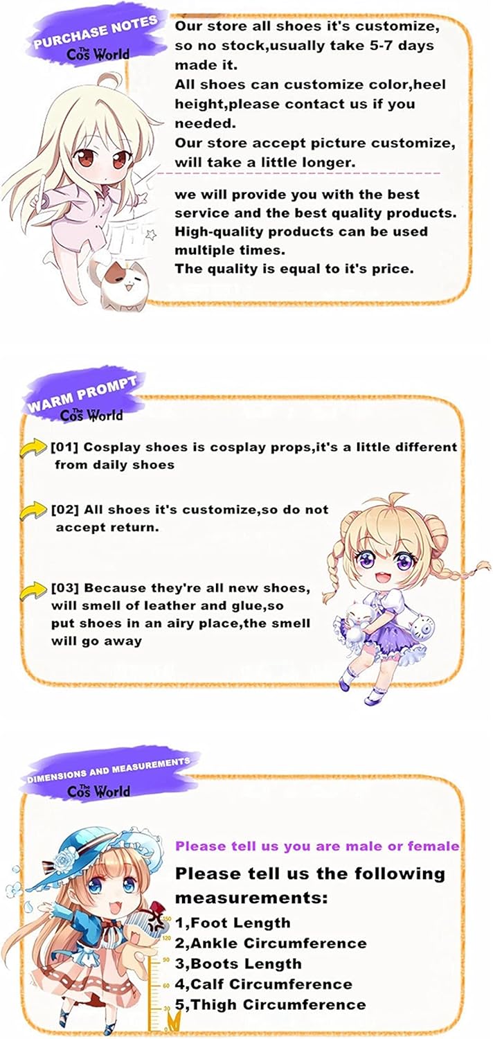 Materiale: similpelle di alta qualità. Prodotti di alta qualità possono essere utilizzati più volte. I prodotti includono: scarpe (stivali su misura, tempo 7-9 giorni) Caratteristiche: questa scarpa da gioco di ruolo, tessuto morbido e confortevole di alta qualità, compatto e squisito fattura, confortevole e bello, asciutto e traspirante, semplice e realistico. Rendono unico Crea un look perfetto e magico con cui puoi digitare e goderti rapidamente i personaggi. Sensazione meravigliosa. Facile da indossare, è la scelta migliore per il tuo personaggio. Occasioni applicabili: questa scarpa boutique adatta per Halloween, feste a tema, carnevale, feste di ruolo, palcoscenico, feste di Natale, feste in maschera e altre occasioni speciali e altri compleanni o festival. Questo è anche un buon regalo per amici, familiari e amanti degli anime. Le nostre scarpe sono la scelta perfetta per mostrare il tuo fascino.