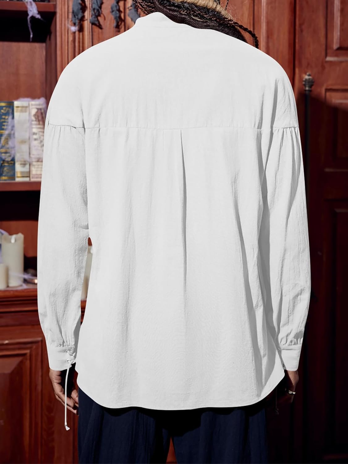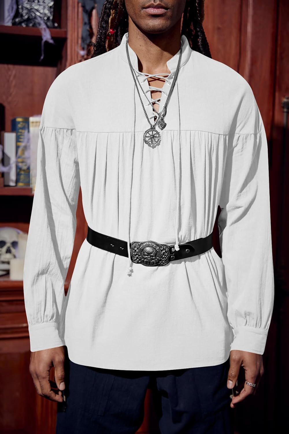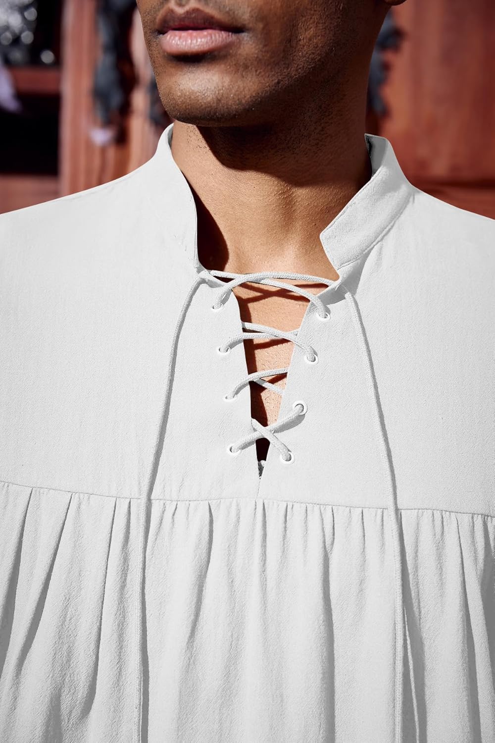 Le misure sono giuste, tranne per le maniche che mi vestono leggermente lunghe. Il tessuto della camicia è di buona qualità: è un mix cotone e lino, che rende il capo leggero e traspirante. I cordini forniti sono invece di scarsa qualità, li ho sostituiti con dei lacci da scarpa corti in cotone. In generale fa una bella figura nell' abito medievale per cui la uso!