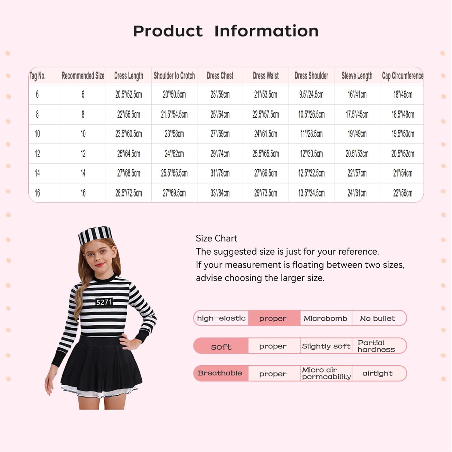 Il set include: 1 vestito, 1 berretto da forzato. Condizione: nuovo con etichette Materiale: 90% poliestere, 10% elastan Etichetta No.---|---Misura consigliata: --|---Vestito Lunghezza---|---Spalla al Cavo---|---Vestito Chest---|----Vestito da spalla---|---Lunghezza delle maniche---|---Lunghezza del manico---|---Cap Circumference ------6---------|---------5-6 anni--------|----20,5"/52,5 cm---|--------20"/50,5 cm-------|-----23"/59 cm----|----- 21"/53,5 cm----|-----9,5 cm----|---------16"/41 cm---------|--------18"/46 cm---------46 cm. ------8---------|---------7-8 anni--------|-----22"/56,5 cm-----------21,5"/54,5 cm------|-----25"/64 cm----|---22,5"/57,5 cm---|----|----10,5 cm----|--------17,5"/45 cm--------|------------|------------|------------|-------18,5 cm--------|-------18,5 cm--------|------------48 cm. ------10--------|--------9-10 anni--------|----23,5"/60,5 cm---|---------23"/58 cm--------|-----27"/69 cm----|----61,5 cm----|-----11"/28,5 cm-----|---------19"/49 cm---------|-------19,50 cm---50 cm--- ------12--------|--------11-12 anni-------|-----25"/64,5 cm----|---------24"/62 cm--------|-----29"/74 cm----|---25,5"/65,5 cm---|-----12"/30,5 cm-----|--------- 20,5"/520,520,520,520 "/520,52 "/520,52 "/52 cm--- ------14--------|--------13-14 anni-------|-----27"/68,5 cm--------------25,5"/65,5 cm------|-----31"/79 cm----|----69,5 cm----|----|----12,5 cm----|---------22"/57 cm---------21"/54/54/544/54 cm----|-------- cm---- ------16--------|--------15-16 anni-------|----28,5"/72,5 cm---|--------27"/69,5 cm-------|-----33"/84 cm----|----73,5 cm----|----|----13,5 cm----|---------24"/61 cm---------|---------222"/56 cm-------------------------------------------------------------------------------------------------------