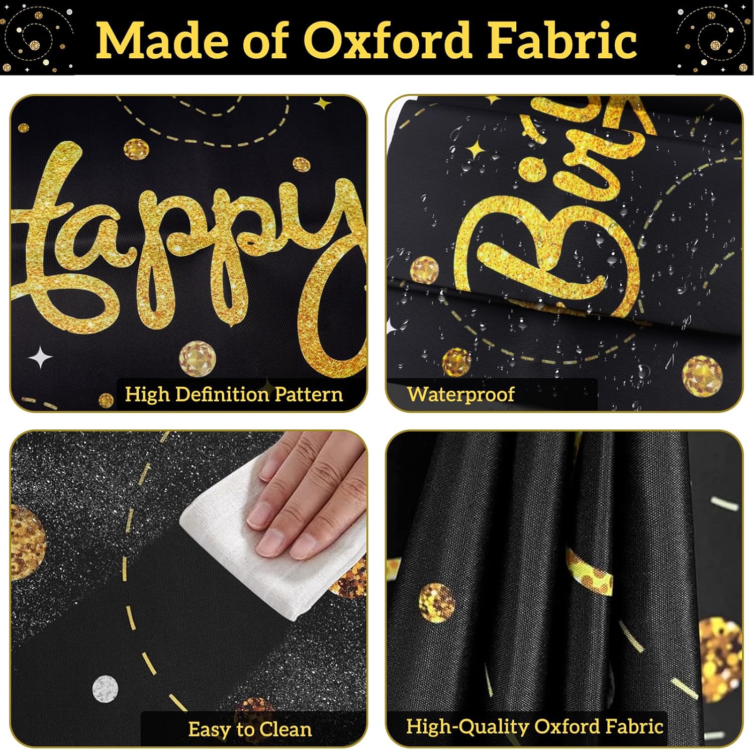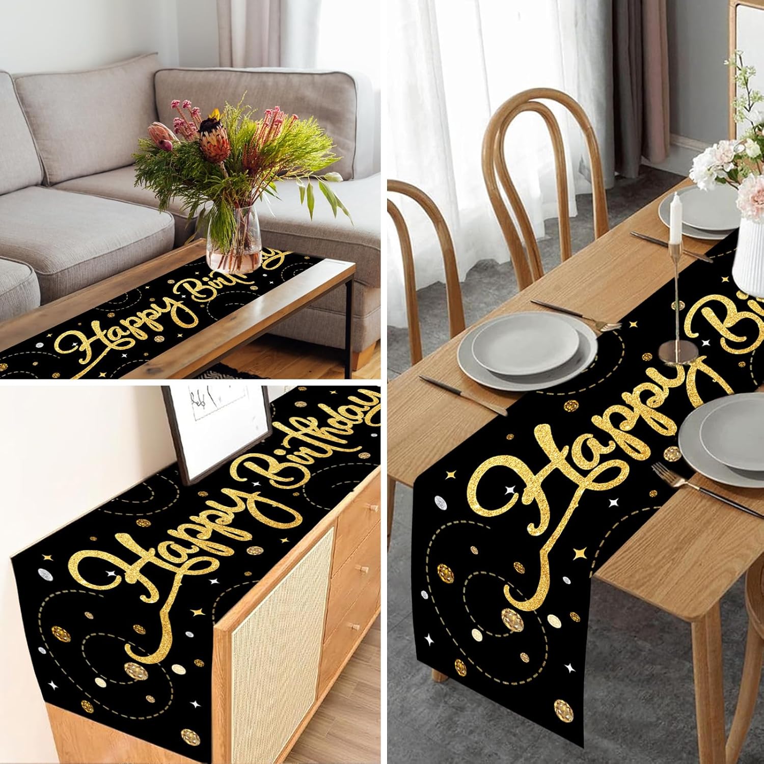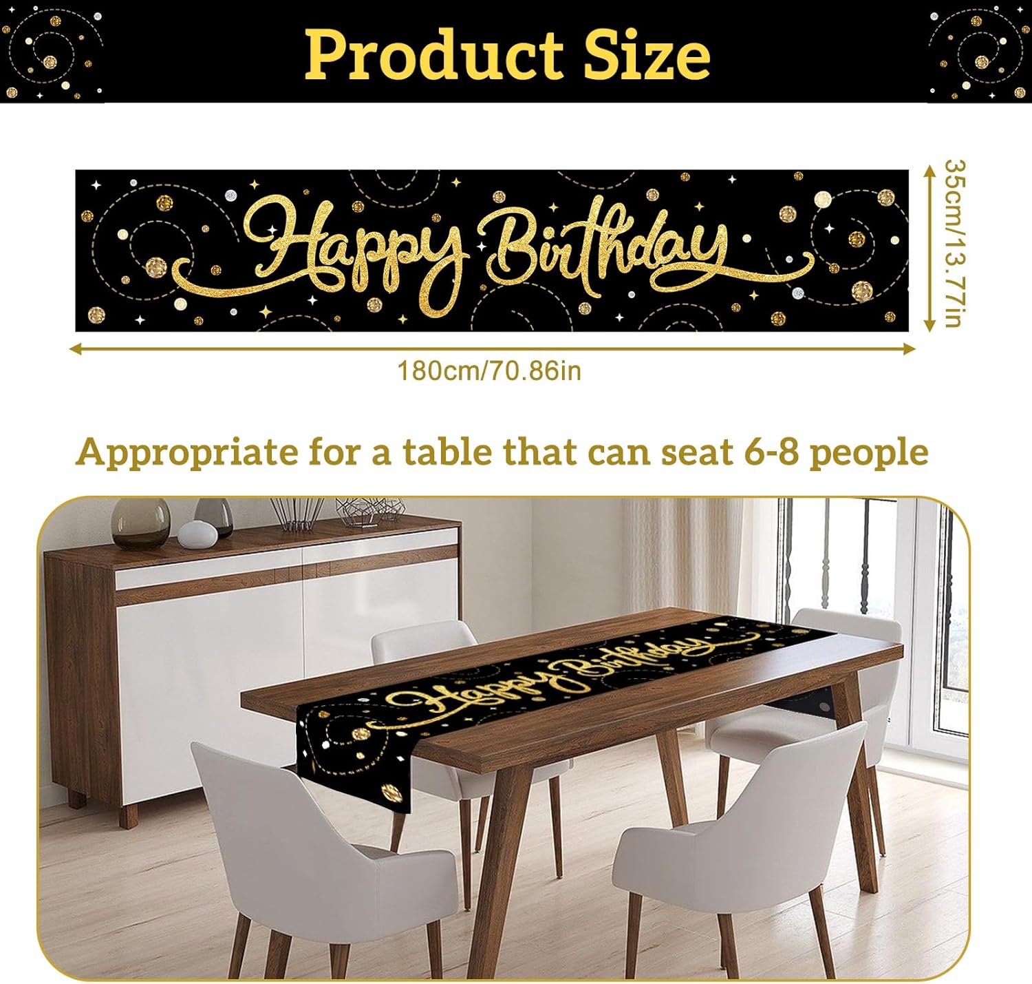 Runner da tavolo nero per compleanno: riceverete una tovaglia di compleanno di dimensioni 180 x 35 cm con scritta dorata. Con la scritta "Happy Birthday", questa decorazione di compleanno è adatta per tavoli da 6 a 8 posti ed è ideale per feste per bambini e adulti. Perfetto come runner da tavolo per compleanno o decorazione di compleanno Materiale: questa tovaglia di compleanno è realizzata in tessuto Oxford. È impermeabile, antistrappo e resistente e protegge il tavolo da graffi, macchie e danni al calore. Ideale per decorazioni di compleanno, mantiene il colore e la forma originali anche dopo numerosi lavaggi Facile da pulire: basta arrotolarlo e lavarlo dopo la festa. Non si restringe, non perde pelucchi e non sbiadisce, perfetto per decorazioni di compleanno riutilizzabili, colore nero Uso: perfetto per cucina, sala da pranzo, feste e occasioni speciali. Può essere utilizzato anche come runner da tavolo nero o per decorare comò, tavolini, supporti TV e molto altro ancora Design decorativo: con il suo design unico con colori vivaci e motivi vivaci, è riutilizzabile e aggiunge un tocco di eleganza a qualsiasi tavolo di compleanno o decorazione della casa