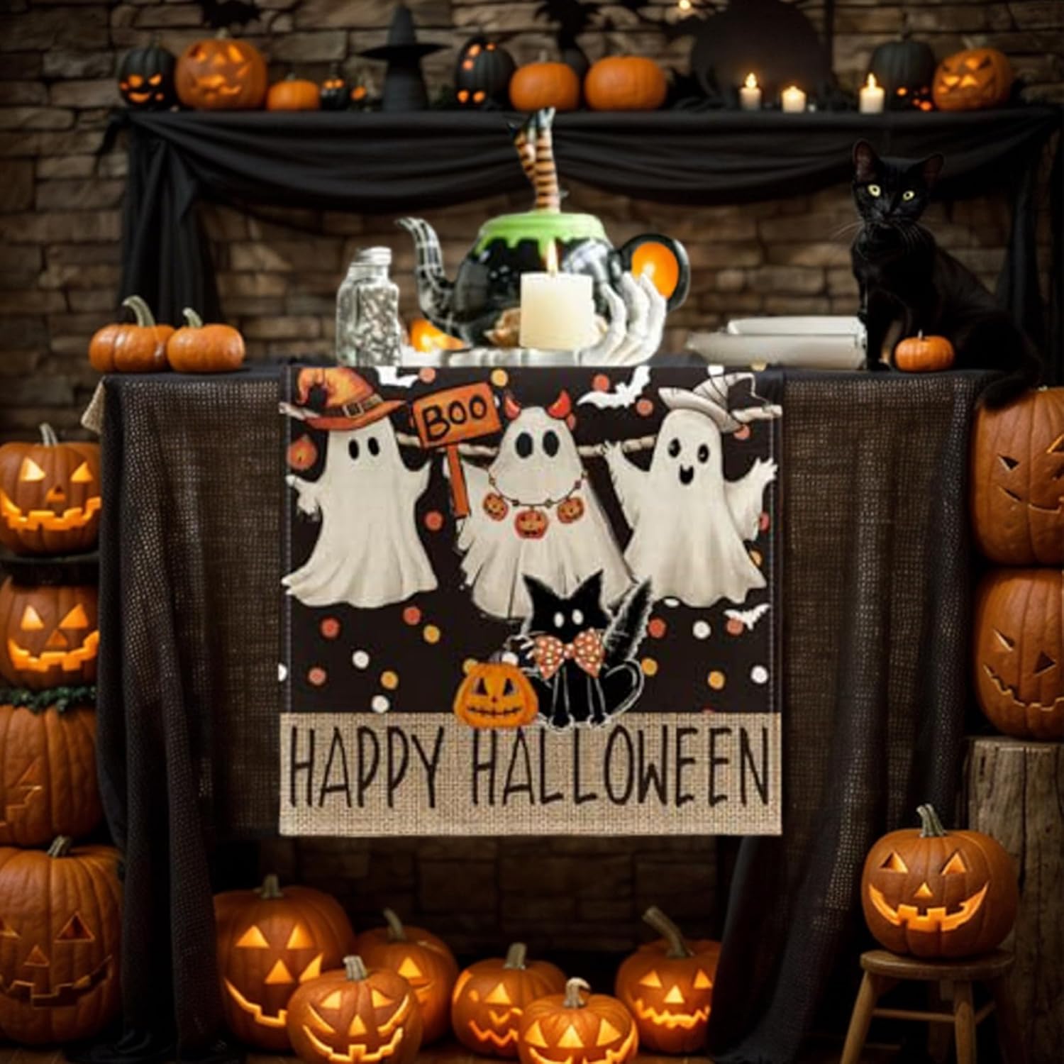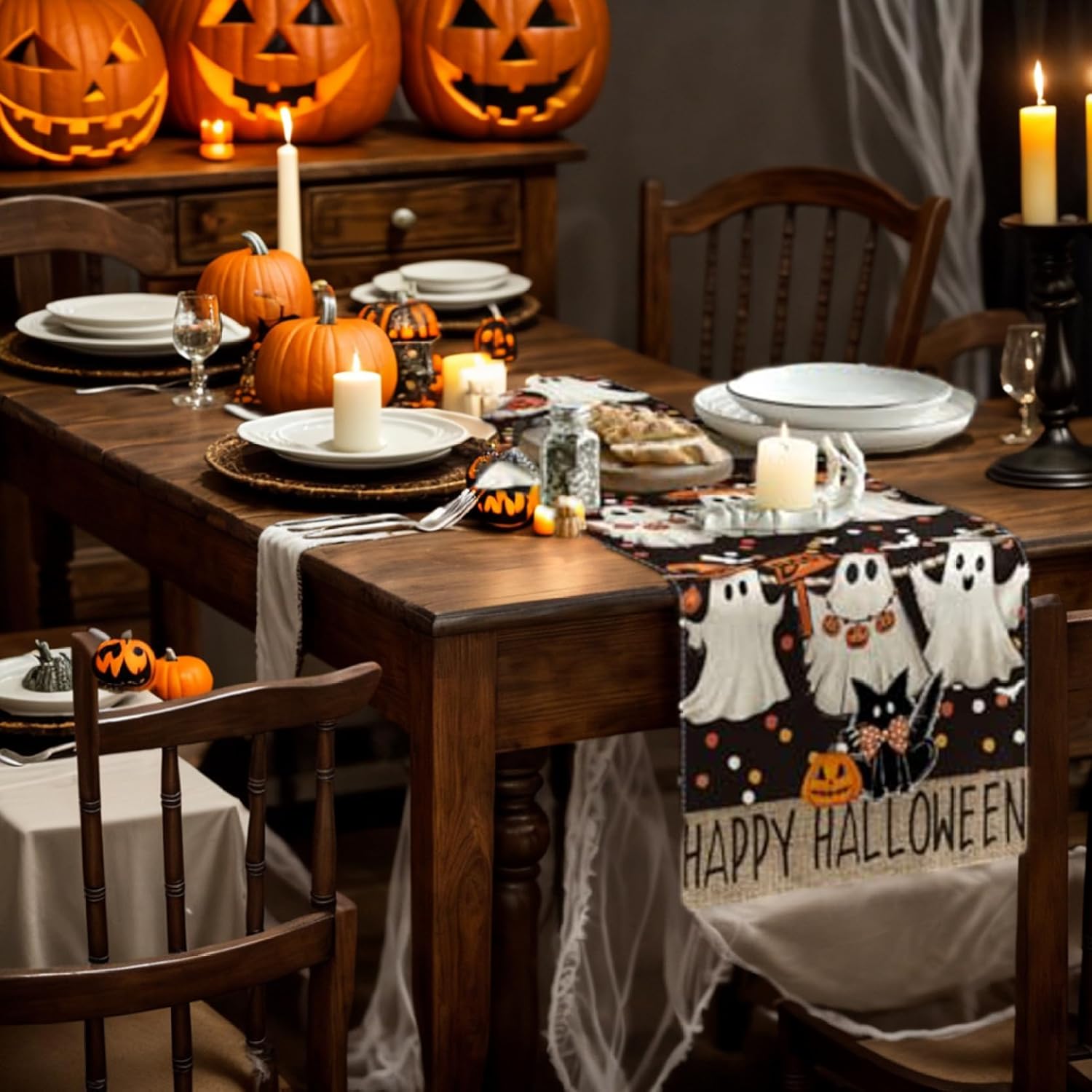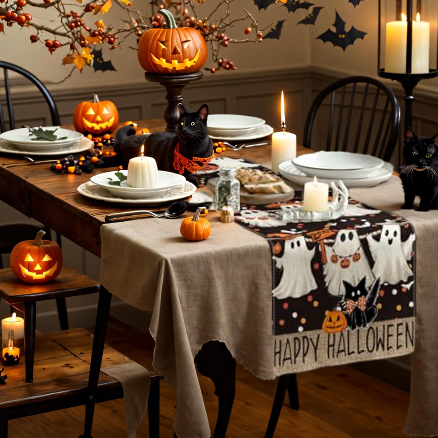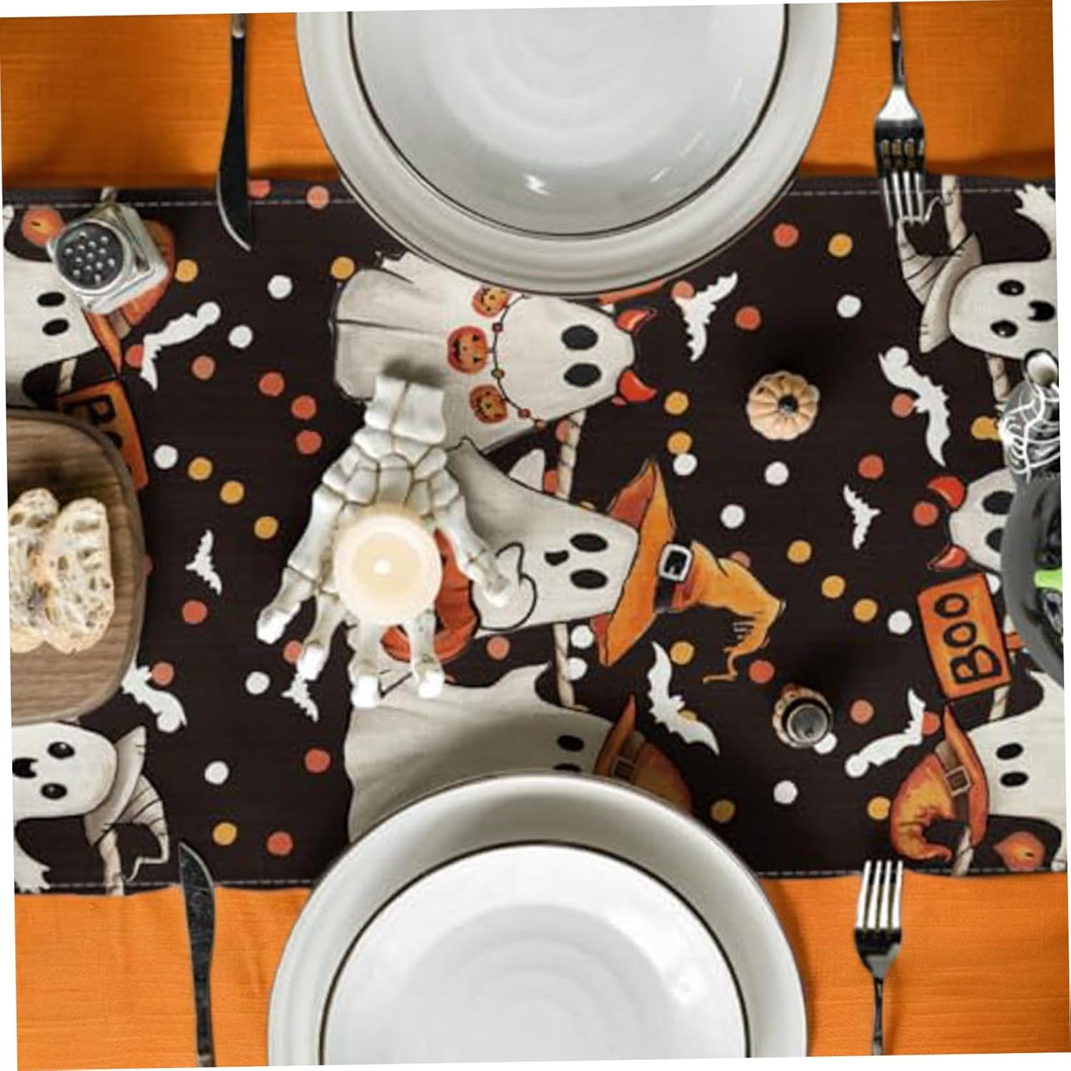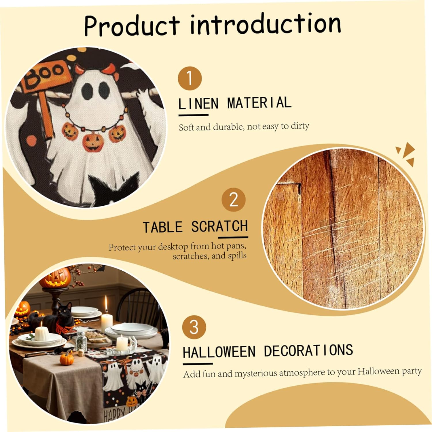 Decorazione versatile: perfetto per più di un semplice Halloween, questo runner da tavola può anche migliorare l'arredamento della tua casa per eventi a tema autunnale, feste o uso quotidiano, rendendolo un'aggiunta versatile alla tua collezione. Decorazione della tavola di Halloween Dimensioni ottimali per qualsiasi tavolo: misura 33 x 182,9 cm, questo runner da tavola è progettato per adattarsi a una varietà di dimensioni del tavolo, rendendolo un centrotavola ideale per la tua cucina o tavolo da pranzo durante le riunioni di Halloween. Runner da tavola per Halloween Materiale di qualità: realizzato in materiale di lino di qualità, questo runner da tavola è impermeabile e resistente al calore, protegge facilmente il tavolo da fuoriuscite e danni da calore aggiungendo un tocco elegante al tuo arredamento. Runner da tavola Design festivo di Halloween: aggiungi un tocco spettrale alla tua esperienza culinaria con il nostro runner da tavola di Halloween in lino con affascinanti stampe di fantasmi, lanterne Jack-O'-e gatti neri. È il modo perfetto per festeggiare la stagione di Halloween! Centrotavola Halloween Per Tavoli Facile da pulire e mantenere: progettato per la comodità, il nostro runner da tavola per Halloween è facile da pulire, basta pulirlo o pulire a macchia se necessario, consentendo di concentrarsi sul godersi i pasti festivi piuttosto che preoccuparsi di disordine. Decorazioni da tavola di Halloween