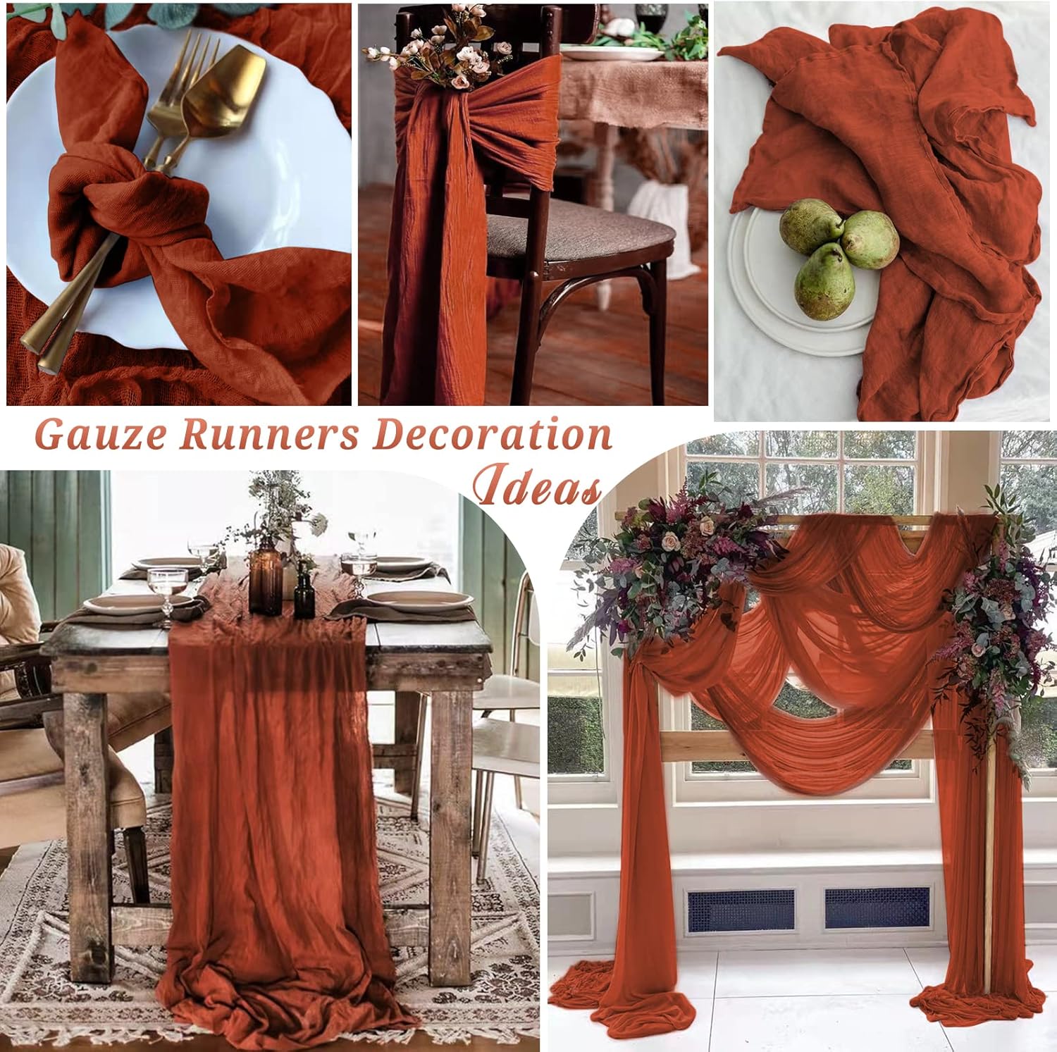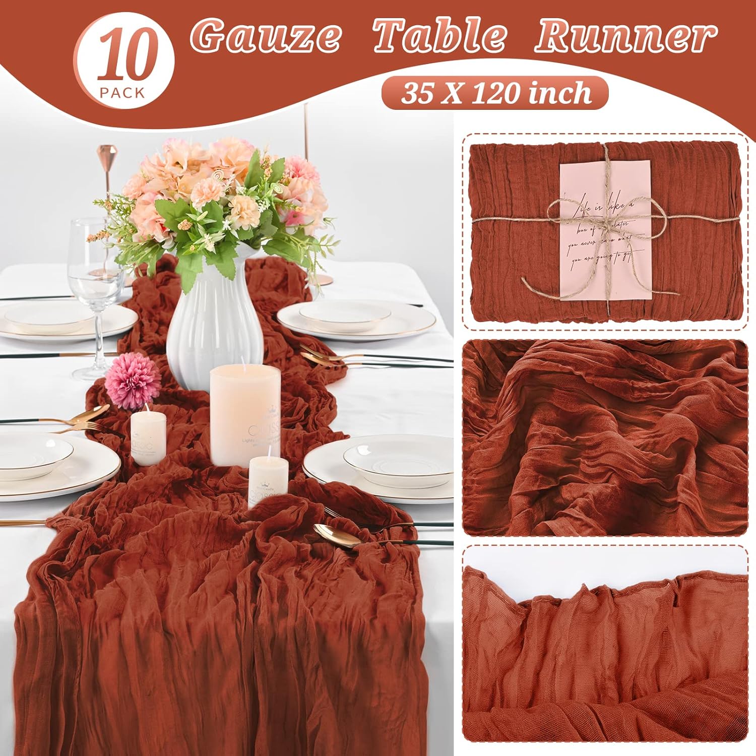 Informazioni sul prodotto: La confezione include 10 runner da tavolo in garza di terracotta, design elegante e di bell'aspetto, lavorazione squisita e la quantità è sufficiente per l'uso quotidiano e le esigenze di sostituzione, perfetta per la decorazione domestica, le decorazioni per la tavola di nozze e le decorazioni per la tavola delle feste. Dimensioni: la dimensione di ogni runner da tavolo in garza è di ca. 35" x 120", adatto alla maggior parte dei tipi di tavoli, adatto per un tavolo che può ospitare 8-10 persone. Abbastanza grande per tavoli rettangolari e rotondi. Usane di più come decorazioni per la tavola. Questo pratico runner da tavolo in garza offre molte idee decorative e può essere utilizzato per le fodere delle sedie o per i tovaglioli decorativi, per i drappeggi sullo sfondo o anche per le confezioni regalo ecologiche. Materiale di alta qualità: il runner da tavolo è realizzato in delicata garza di cotone, con buona durata e flessibilità, e le superfici sono lisce e confortevoli al tatto, resistenti all'usura e agli strappi. I bordi del runner da tavolo sono accuratamente cuciti per rimanere in perfette condizioni. Il runner da tavolo di alta qualità può rendere la tua festa, il tuo matrimonio attraente e impressionante. Ampie applicazioni: garza per matrimoni, banchetti, compleanni, archi o cene, addio al nubilato o baby shower, buffet di dolciumi e altre feste varie. Possono essere utilizzati anche per ravvivare le strutture di sedie, tende, caminetti, mensole, armadietti, porta TV, divani, comodini e altri mobili. Istruzioni per la cura: lavare solo a mano. Si consiglia di appendere a secco per evitare il restringimento. Evita di usare l'ammorbidente quando pulisci la garza. Non è necessaria la stiratura per mantenere la consistenza spiegazzata. Per garantire un riutilizzo duraturo, non utilizzare un'asciugatrice. A causa della risoluzione dello schermo e delle limitazioni nella fotografia, potrebbero verificarsi variazioni di colore.