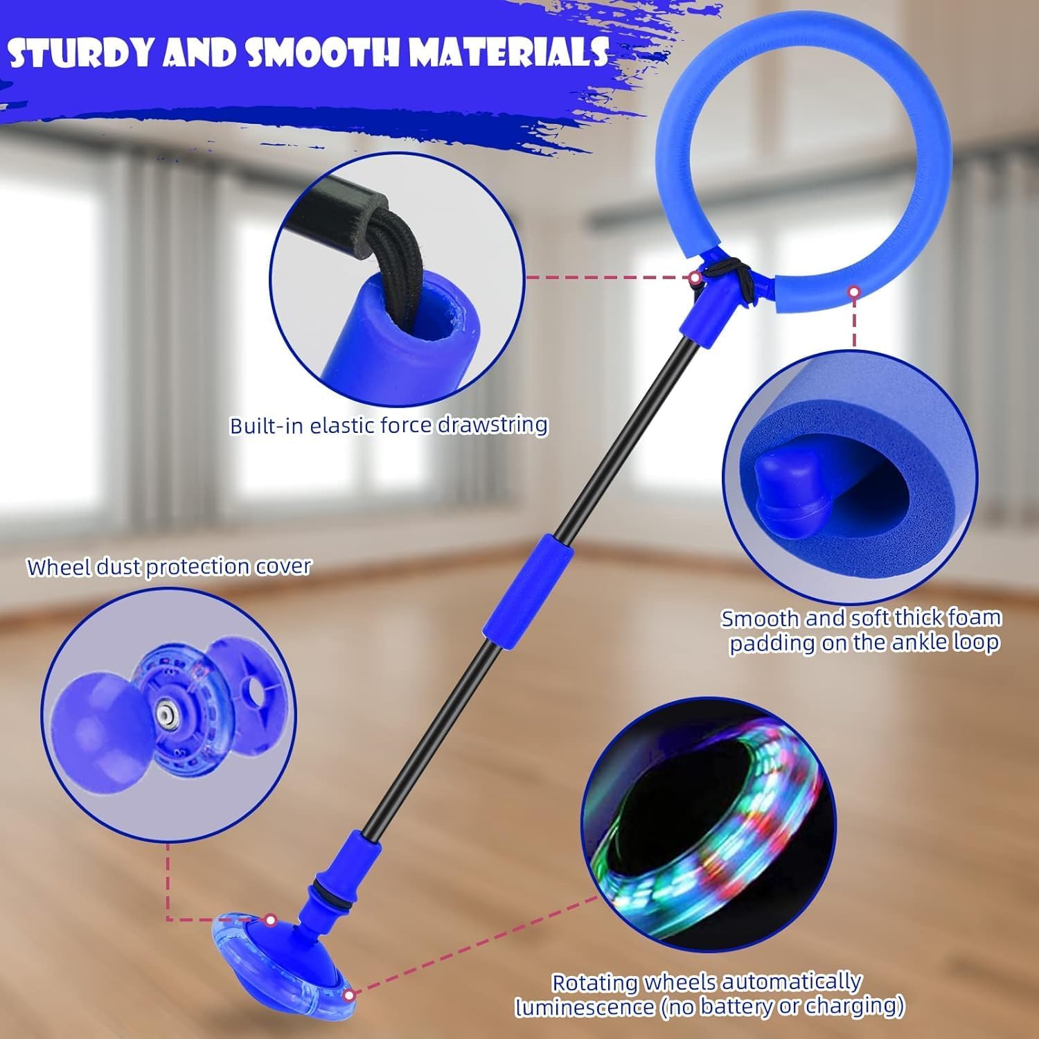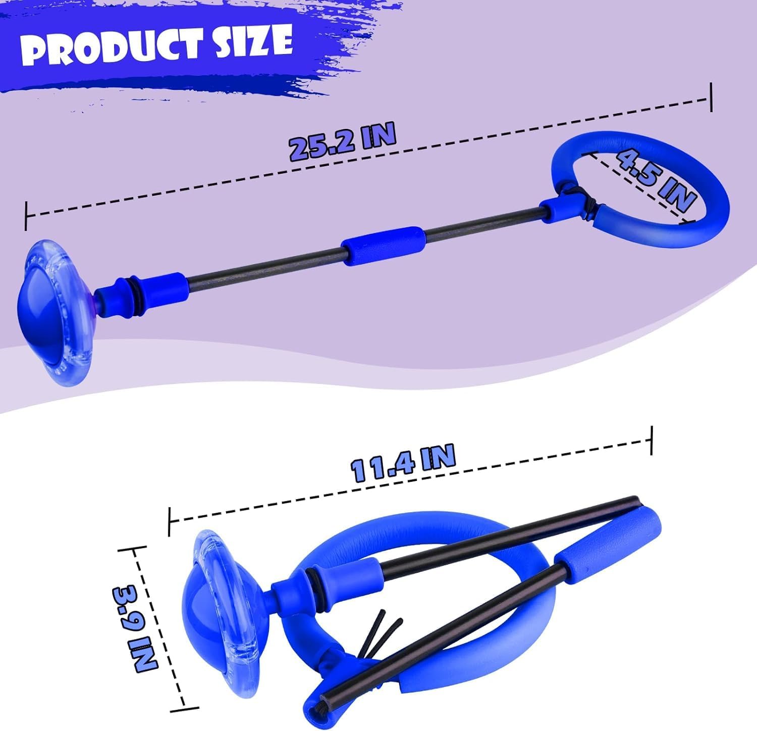 【Ruota girevole lampeggiante】 L'anello di salto lampeggiante contiene un sensore. Non sono necessarie batterie o ricarica. Ogni volta che salta, la ruota rileva ed emette automaticamente luci colorate. Questo fantastico effetto glitter può stimolare l'interesse dei bambini per lo sport. 【Giocattolo sportivo pratico】 La trottola con piede ad anello per saltare aiuta efficacemente i bambini ad allenare la coordinazione e l'equilibrio. Ideale per i giochi genitore-figlio per migliorare il rapporto tra te e i bambini. 【Palla da salto pieghevole】 La nostra palla da salto è pieghevole, la lunghezza totale è di 24 pollici/60 cm, dopo la piegatura è di 11,8 pollici/30 cm, è flessibile e non facile da rompere, meglio da trasportare e riporre. 【Alta qualità】 La palla da salto alla caviglia è realizzata con materiali ecologici in PP e PVC, durevoli e riutilizzabili. E l'anello alla caviglia è spesso imbottito, protegge efficacemente le caviglie del tuo bambino dagli urti. Facile da usare: prima posiziona l'anello della palla da salto su un piede, quindi puoi scegliere di ruotarlo in avanti o indietro, quando la barra ruota sull'altro piede, solleva l'altro piede e salta sopra la palla e la corda.