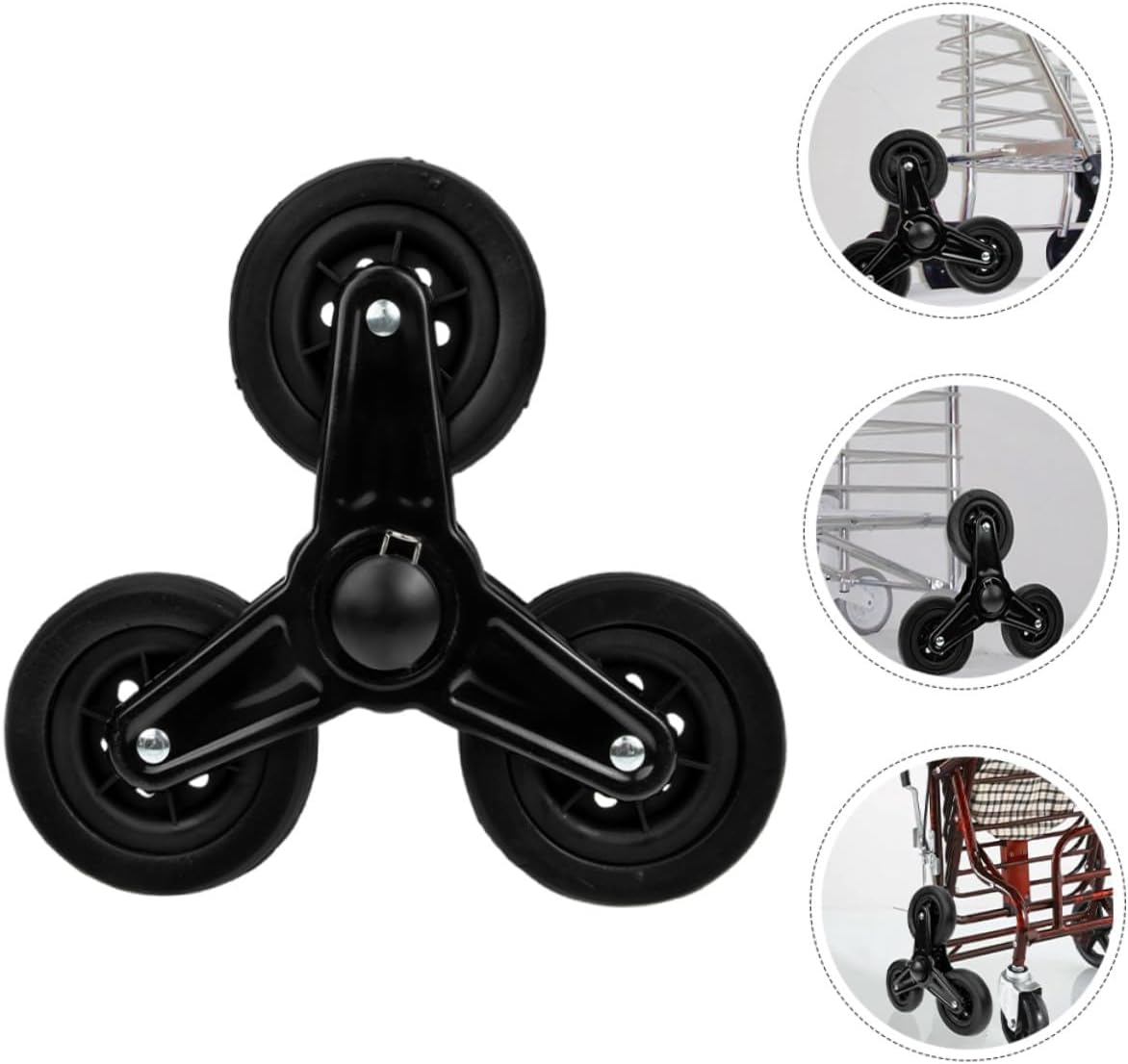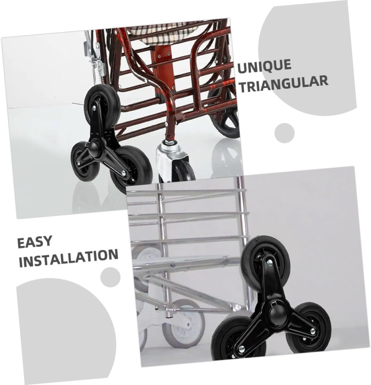 Installazione rapida: grazie al loro design intuitivo, queste ruote possono essere installate facilmente e senza attrezzi o competenze. Ampia compatibilità: queste ruote sostitutive sono compatibili con un'ampia gamma di carrelli, inclusi carrelli della spesa, della lavanderia e dei bagagli, fornendo una soluzione flessibile, ruote per montascale del carrello della spesa, carrelli da arrampicata Prestazioni per carichi pesanti: queste ruote con rotelle sono progettate per un uso intensivo e possono supportare un peso significativo, rendendole ideali per l'uso commerciale e residenziale adatte all'uso. Ruota triangolare, rotelle triangolari Liscio: dotate di rotelle piroettanti, queste ruote triangolari forniscono un movimento fluido e stabile su varie superfici, migliorando la manovrabilità complessiva del carrello Stabilità migliorata: la configurazione triangolare fornisce stabilità ed equilibrio migliorati, riducendo il rischio di ribaltamento durante la guida su scale o superfici irregolari