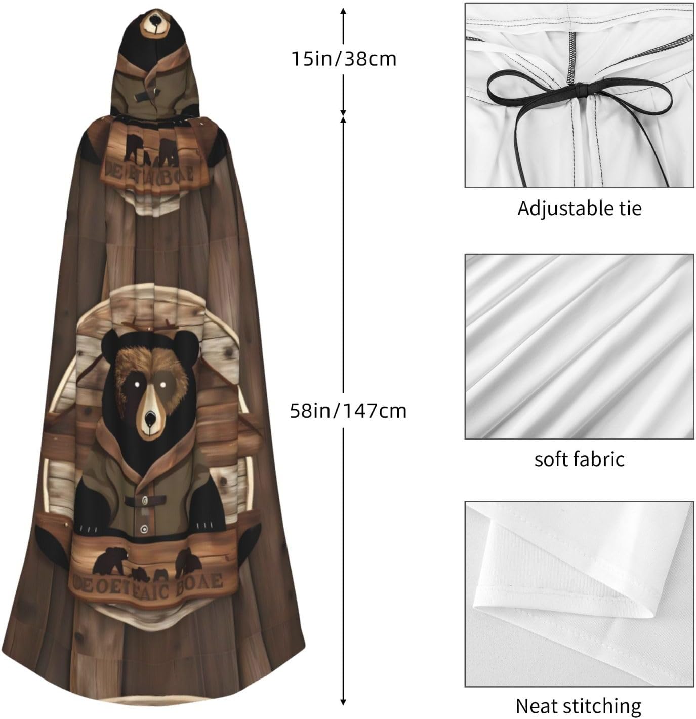 Prestazioni del costume da orso rustico Lodge: poncho oversize con cappuccio, senza cerniera, nodo a cravatta, accogliente dimensioni del vestito con cappuccio: lunghezza: 57,87 pollici, larghezza: 60,6 pollici, altezza cappello: 14,96 pollici Composizione materiale: 100% fibra di poliestere (poliestere) Scena adatta: festa, carnevale, Halloween, festa in costume, costumi cosplay, costumi di scena, feste in maschera, feste a tema, convegni di fumetti, ecc. Istruzioni di lavaggio: lavabile in lavatrice, facile da pulire, durevole