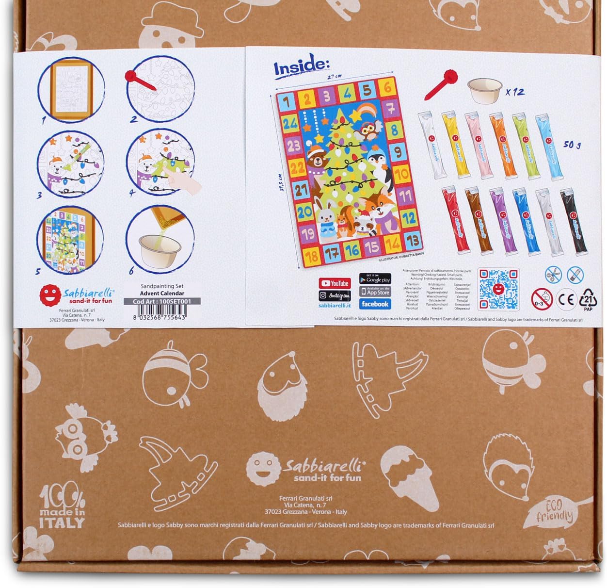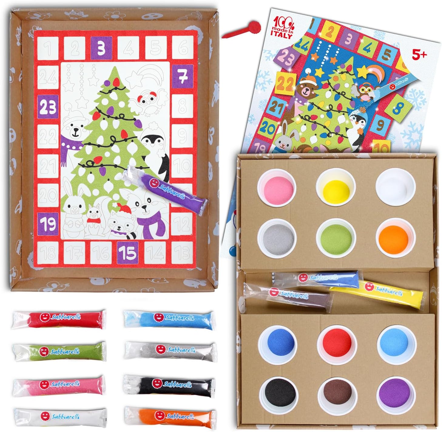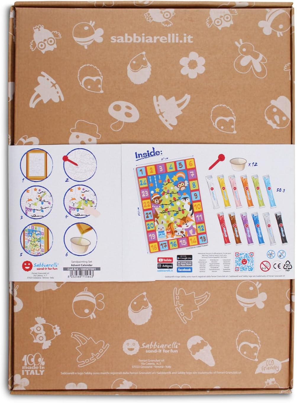🎄 CALENDARIO DELL’AVVENTO – Maxi Poster (26x40cm) con animaletti vestiti a festa davanti all’albero di Natale, incorniciato da 24 caselle numerate per il conto alla rovescia, da colorare con 12 buste da 50g di sabbia colorata incluse (bianco, giallo, arancione, rosso, rosa, viola, blu, azzurro, verde chiaro, verde scuro, marrone, nero). 🧑🎄 COUNTDOWN CREATIVO – Oltre al disegno centrale, ogni giorno fino a Natale i bambini possono completare una casella del calendario, trasformando l’attesa delle feste in un rituale creativo, divertente e condiviso. ✍️ ARTE SENSORIALE E EDUCATIVA – Il sandpainting sviluppa manualità fine, concentrazione e fantasia; grazie al pretaglio laser i dettagli anche più piccoli del disegno risultano facili da colorare, per un’esperienza precisa e appagante. 🎁 PERFETTO REGALO DI AVVENTO – Un’attività creativa originale da regalare prima di dicembre: accompagna i bambini nel conto alla rovescia natalizio con un calendario che unisce gioco, manualità e magia delle feste. 🌍 SICURO, ECOFRIENDLY E MADE IN ITALY – sabbia naturale di marmo Bianco di Carrara, pigmenti a base d’acqua atossici, 1 spellicolino incluso, 12 coppette per il recupero della sabbia, scatola con coperchio che si trasforma in pratico vassoio da lavoro.