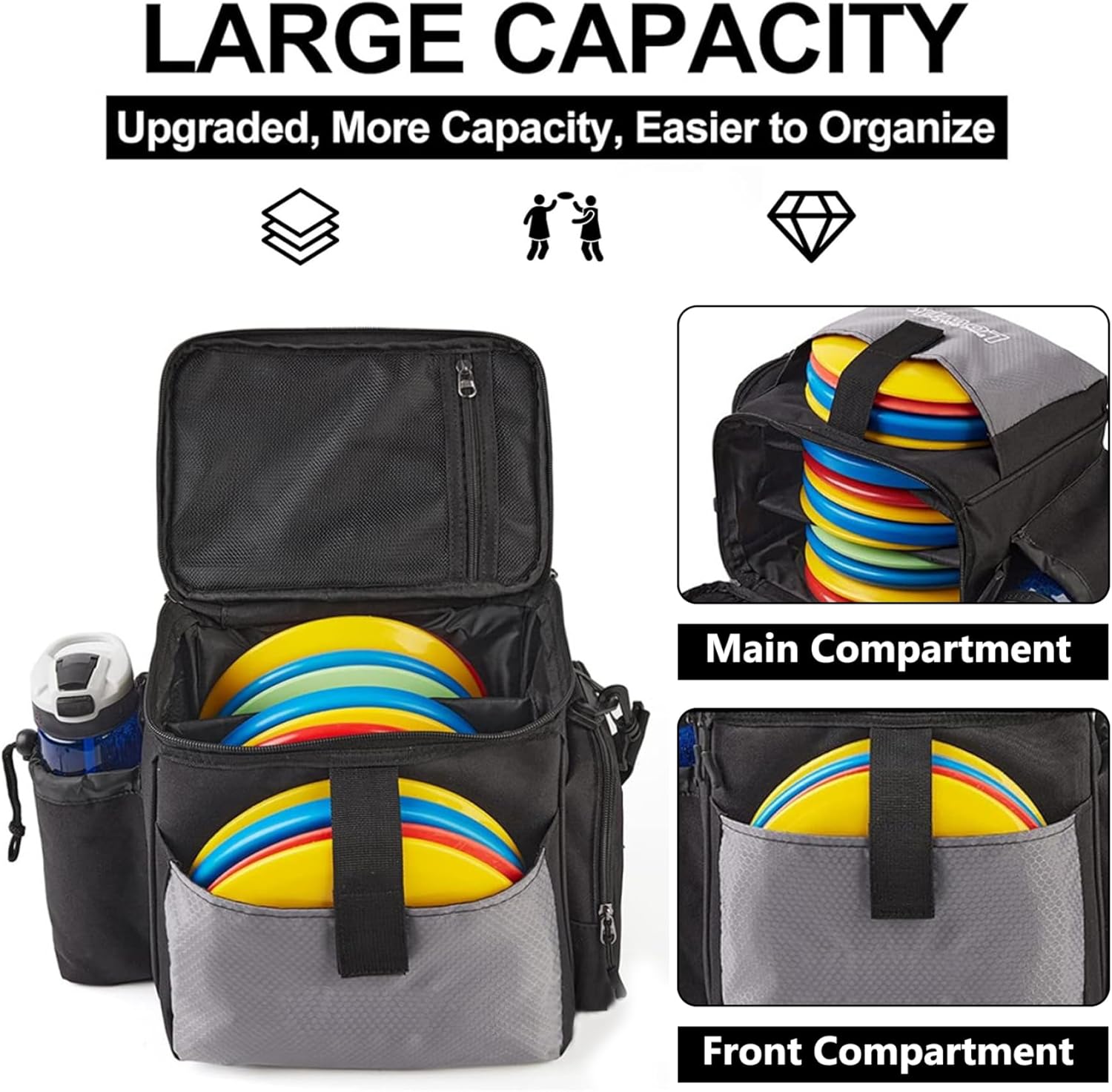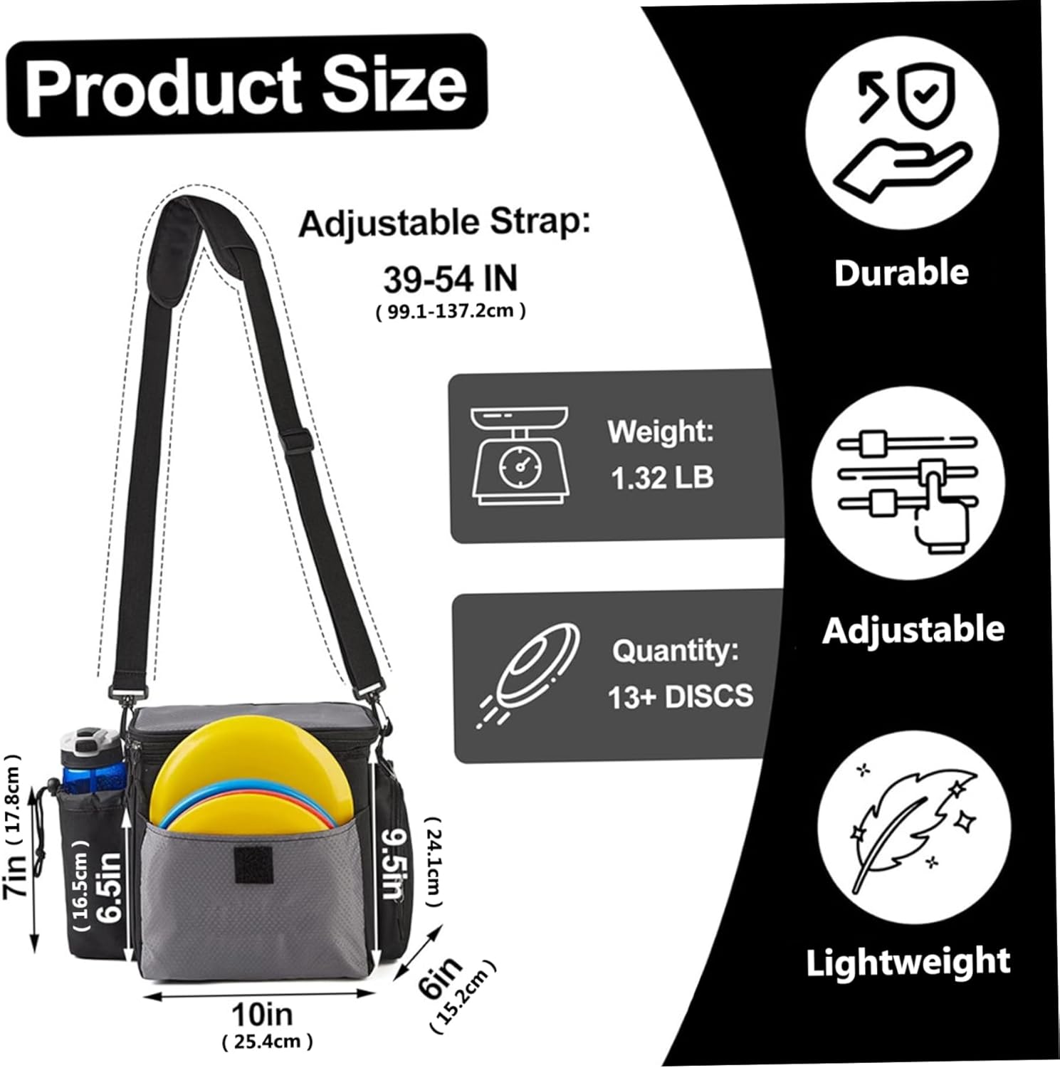 Leggera e portatile: progettata per comodità, questa borsa da golf leggera è facile da trasportare e trasportare, rendendola una scelta eccellente per i giocatori che desiderano scendere in campo senza ingombro aggiuntivo. Ampio spazio di archiviazione: questa borsa ha abbastanza spazio per contenere più dischi, accessori e oggetti personali, assicurandoti di avere tutto ciò di cui hai bisogno per una giornata di successo sul campo. Materiale impermeabile: la nostra borsa da golf Disc è realizzata in morbido poliestere impermeabile di alta qualità, garantendo che la tua attrezzatura rimanga asciutta e protetta dagli elementi durante qualsiasi avventura all'aria aperta. Vestibilità regolabile e comoda: dotato di spallacci regolabili e schienale imbottito, questo zaino da disc golf offre una vestibilità comoda per giocatori di tutte le taglie, permettendoti di concentrarti sul gioco senza disagio. Ideale per i principianti: perfetta sia per i giocatori nuovi che per quelli esperti, questa versatile sacca da golf per dischi è un fantastico compagno di allenamento, progettato per aiutarti a migliorare le tue abilità mantenendo organizzati i tuoi elementi essenziali.