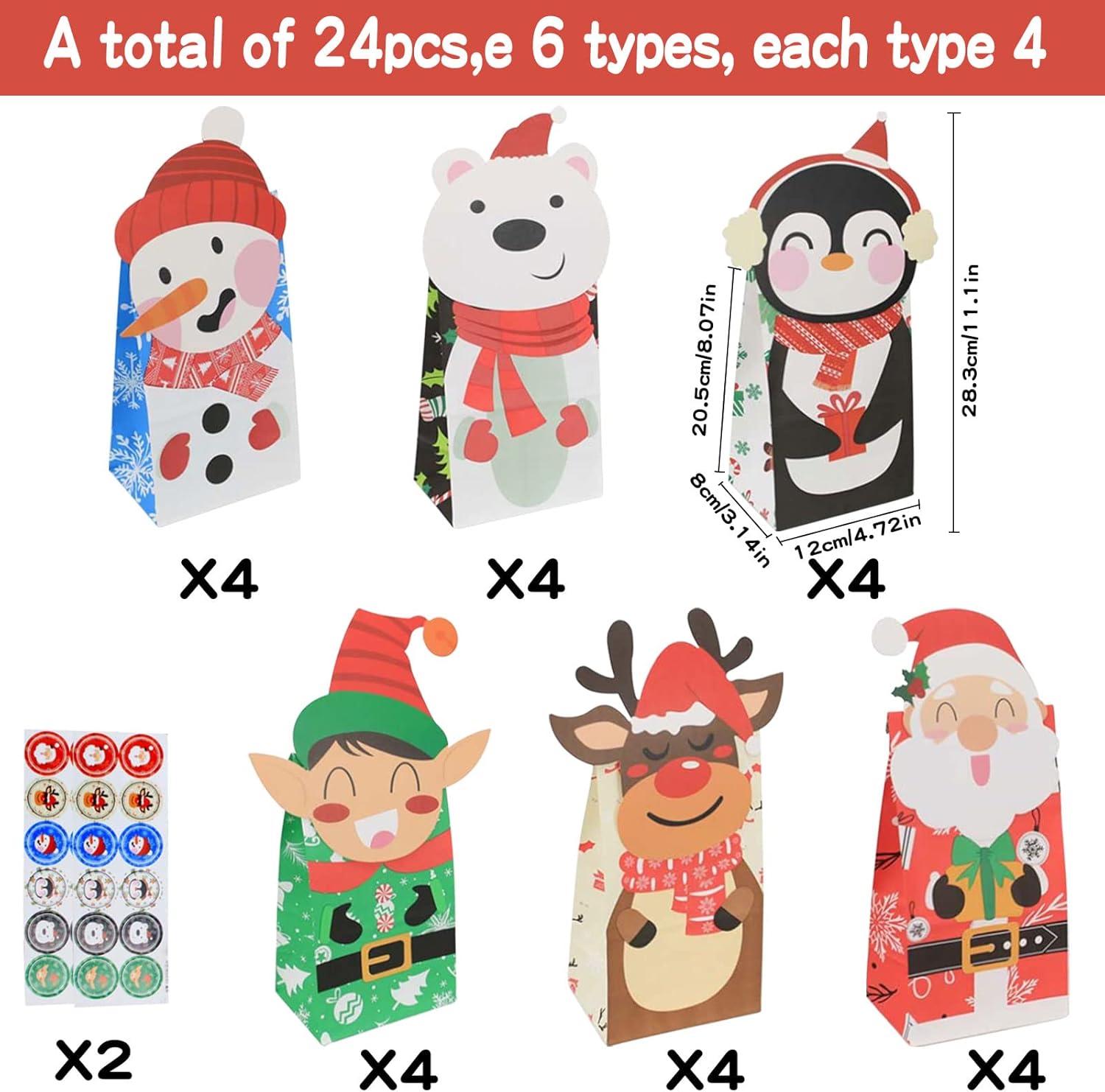 ❤ 【Set di sacchetti di carta per Natale】 24 pezzi di sacchetti di carta per calendario dell'Avvento, 6 modelli, 4 pezzi per ciascun modello. Questi sacchetti regalo sono perfetti per le feste di Natale. I bellissimi adesivi e i sacchetti di carta si completano a vicenda e aggiungono un'atmosfera festosa alle tue vacanze di Natale. ❤ 【Materiali di alta qualità】 I nostri sacchetti di carta per calendario dell'Avvento per le feste di Natale sono realizzati in carta kraft di alta qualità, sono materiali ecologici e riciclabili, sicuri, pratici e igienici. La carta è spessa e resistente, stampata con inchiostro ecologico. ❤ 【Facile da usare】 Con gli adesivi con sigillo adesivo natalizio, la borsa contiene 24 pezzi di adesivi natalizi, pratici per proteggere gli oggetti interni dalla caduta. È durevole e facile da riaprire. Perfetto per le tue prossime idee per il confezionamento di Natale. ❤ 【Multifunzionale】 I sacchetti di carta natalizi hanno 6 motivi, Babbo Natale, pupazzo di neve, pinguino, orso polare, omino di pan di zenzero e renna. Dimensioni: 20 x 12 x 8 cm per confezionare gli alimenti. Ideale per conservare pane, dolci, biscotti, dessert, colazione, biscotti, cioccolata, mentine, ecc. Quando i sacchetti per le feste sono aperti c'è abbastanza spazio. ❤ 【Pacchetto regalo perfetto】 Sacchetti regalo Natale di trucchi, regali di Natale, combinali con etichette regalo di Natale, perfetti per confezionare regali a Natale. È un regalo perfetto per i tuoi amici ed è anche un bellissimo paesaggio a casa.