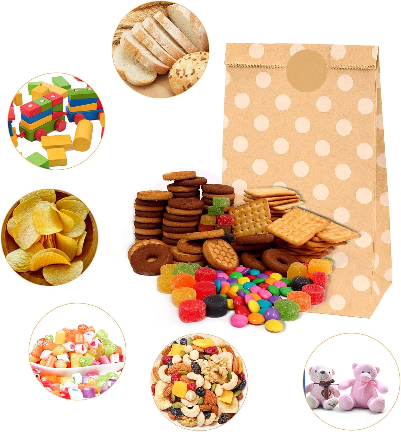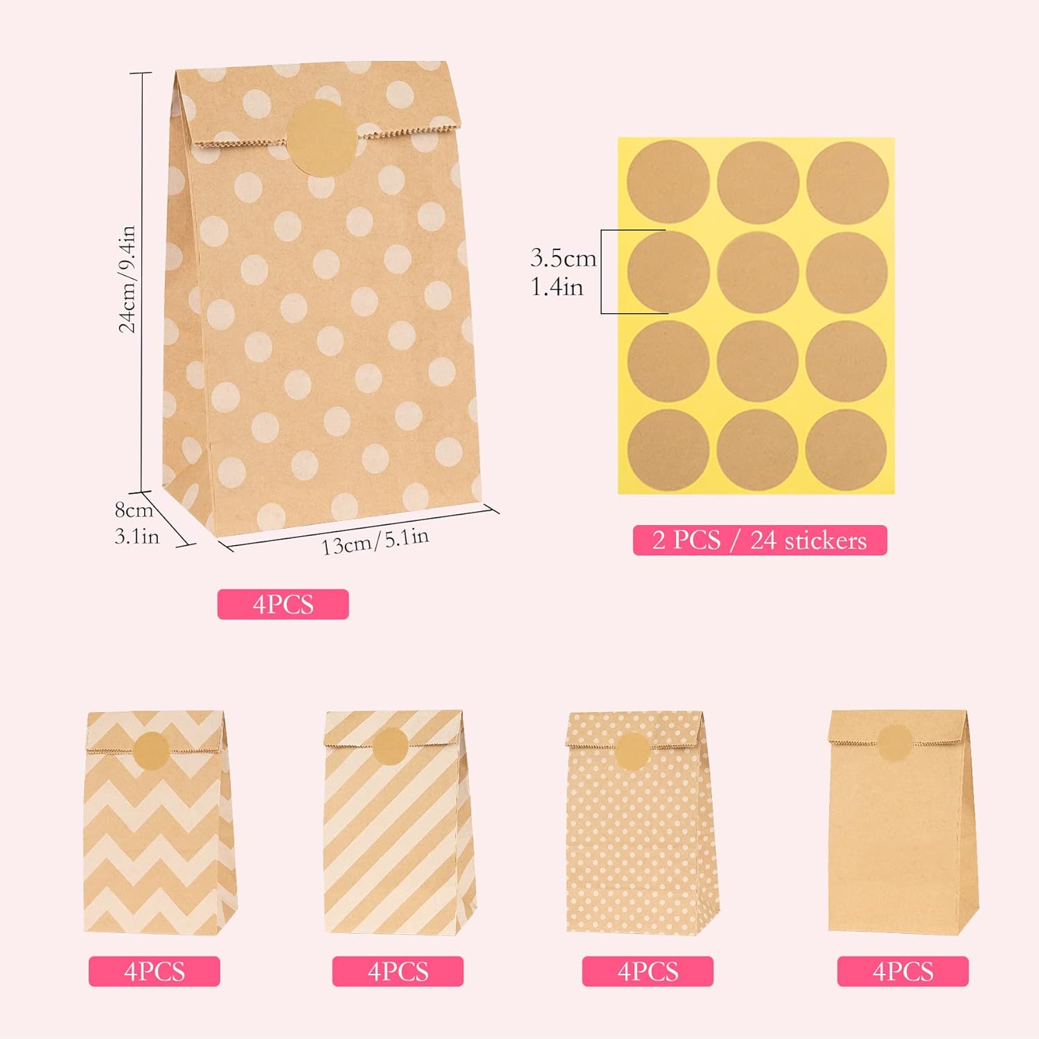 [Set di sacchetti di carta]: include 20 sacchetti di carta marrone e 24 adesivi (5 x 12 fogli). La dimensione delle buste è 24 cm x 13 cm x 8 cm e gli adesivi hanno un diametro di 3,5 cm. [Materiale di qualità]: i sacchetti di carta sono realizzati in carta kraft di alta qualità con una lunga durata, rendendo i nostri prodotti riutilizzabili, ecologici, inodori, sicuri e adatti all'uso. I nostri sacchetti regalo non sono solo esteticamente gradevoli ma anche rispettosi dell'ambiente poiché possono essere riutilizzati più volte. [Multiuso]: questi sacchetti di carta possono essere utilizzati per conservare cibo, pane, panini, snack, piccoli giocattoli, sacchetti per la conservazione, oggetti di artigianato o piccoli regali. La combinazione di bellissimi adesivi e sacchetti di carta kraft è perfetta da regalare! 【Occasioni applicabili】 I nostri sacchetti di carta sono perfetti per Natale, Pasqua, Halloween, compleanni, matrimoni, inaugurazioni di case, lauree e altre festività.