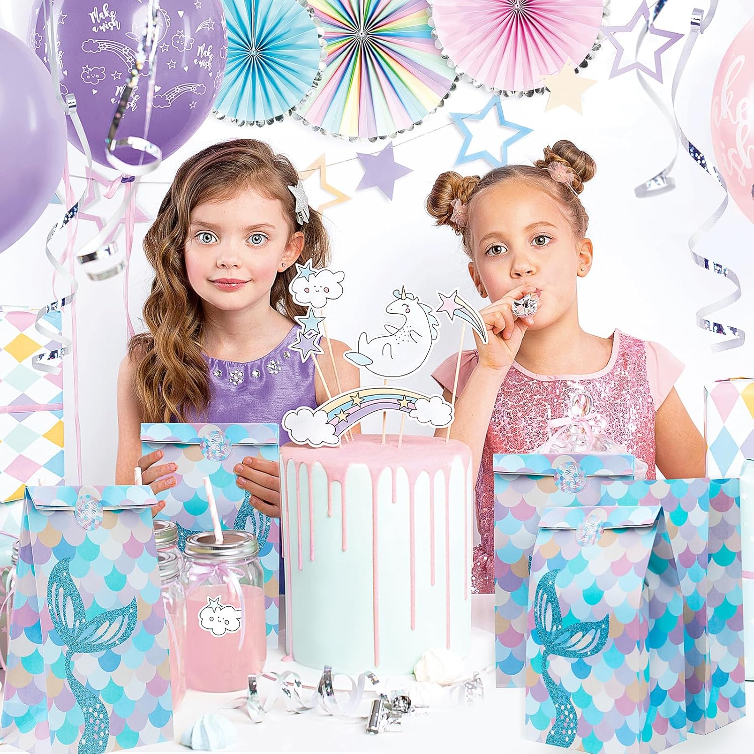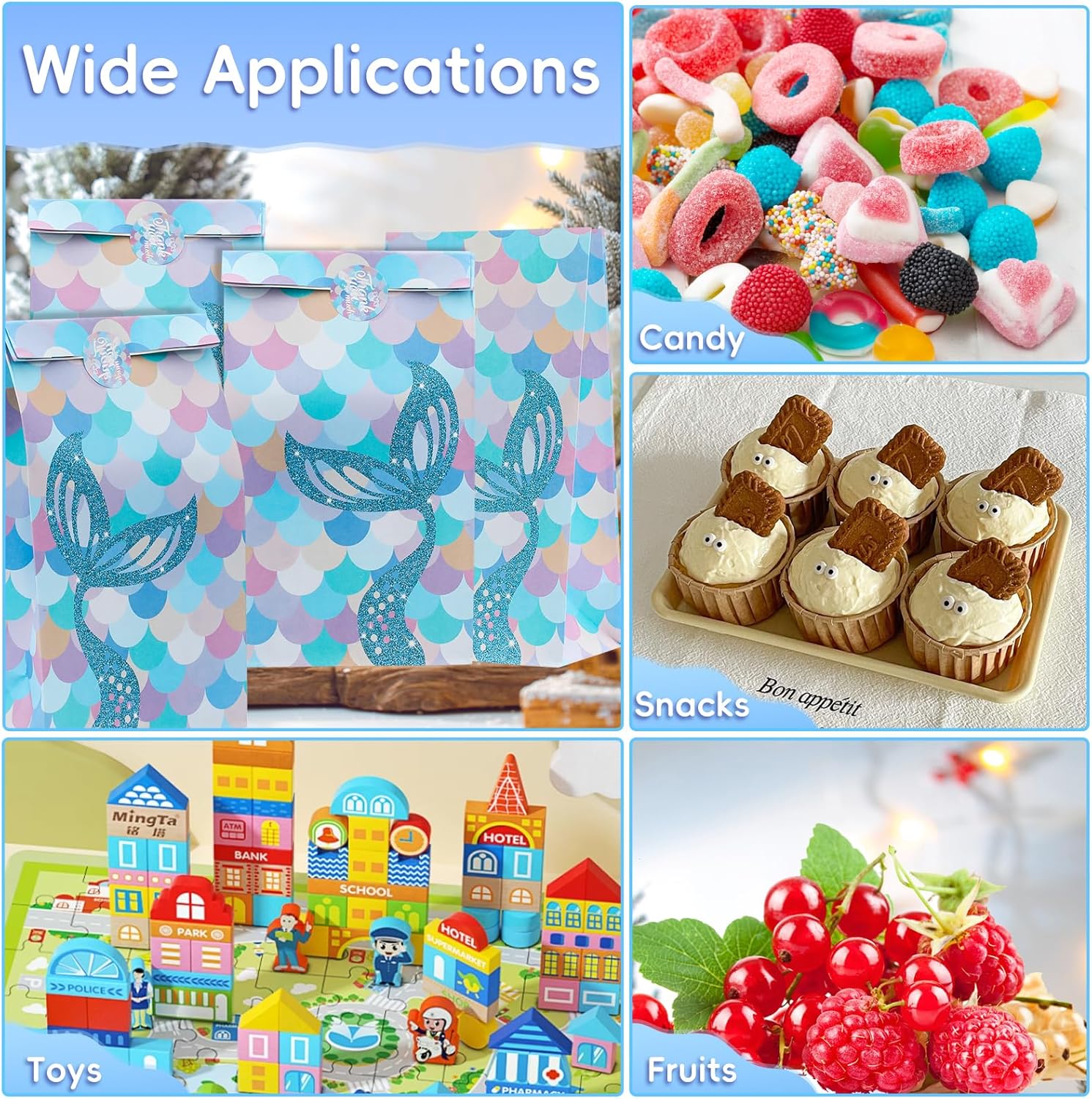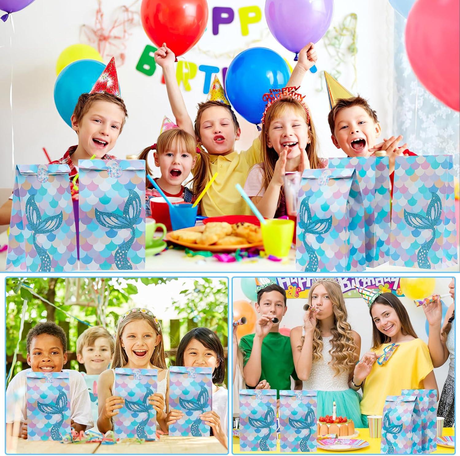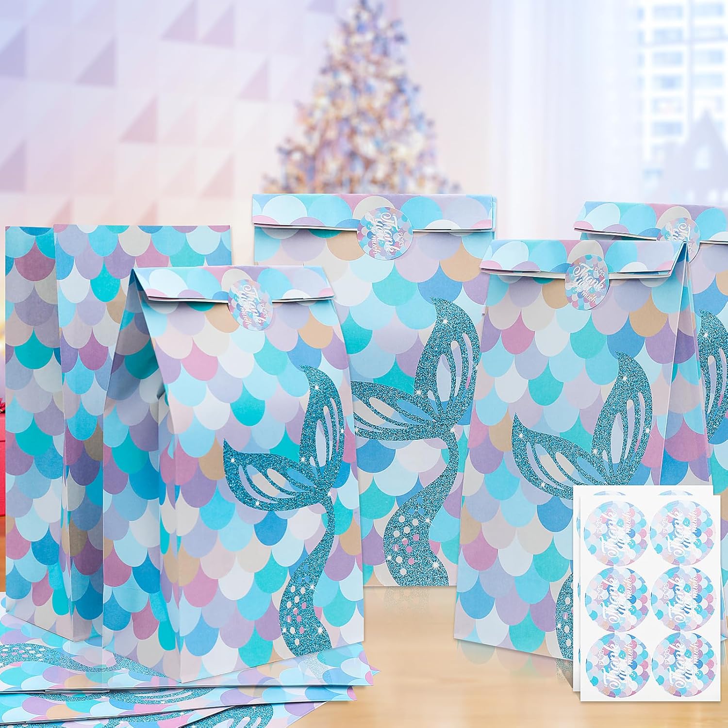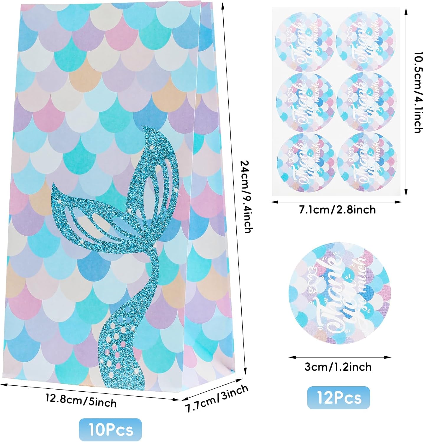 【Sacchetti da festa in carta colorata】 Il pacchetto include 10 sacchetti da festa a forma di sirena con 12 adesivi a forma di sirena. La borsa regalo misura circa 24 cm x 12,8 cm x 7,7 cm ed è perfetta per conservare caramelle, dolcetti o altri piccoli oggetti in quantità e dimensioni sufficienti per soddisfare le esigenze della festa. 【Materiale in carta kraft】 I nostri sacchetti regalo con sirenetta sono realizzati in robusta carta kraft, riciclabile e riutilizzabile, sicura ed ecologica. Inoltre, ogni borsa ha una base rinforzata che non si rompe facilmente, così puoi trasportare più oggetti. 【Facile da usare】 Le borse da festa a sirena sono piccole e facili da trasportare, abbastanza robuste e non facili da danneggiare. Che si tratti di snack, caramelle o piccoli regali, possono essere inseriti semplicemente attraverso l'apertura del sacchetto per le feste. 【Borsa regalo a sirena】Sacchetti regalo personalizzati con design a sirena e scaglie di pesce a sirena come colore di sfondo. Il design raffinato rende questa borsa regalo popolare tra i bambini e gli amanti delle sirene, perfetta per molte feste, come compleanno, baby shower, laurea, celebrazione, Natale, Capodanno, ecc.