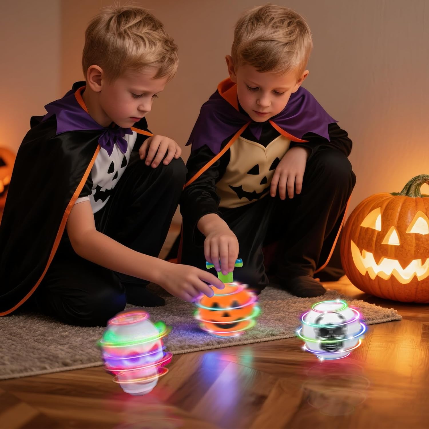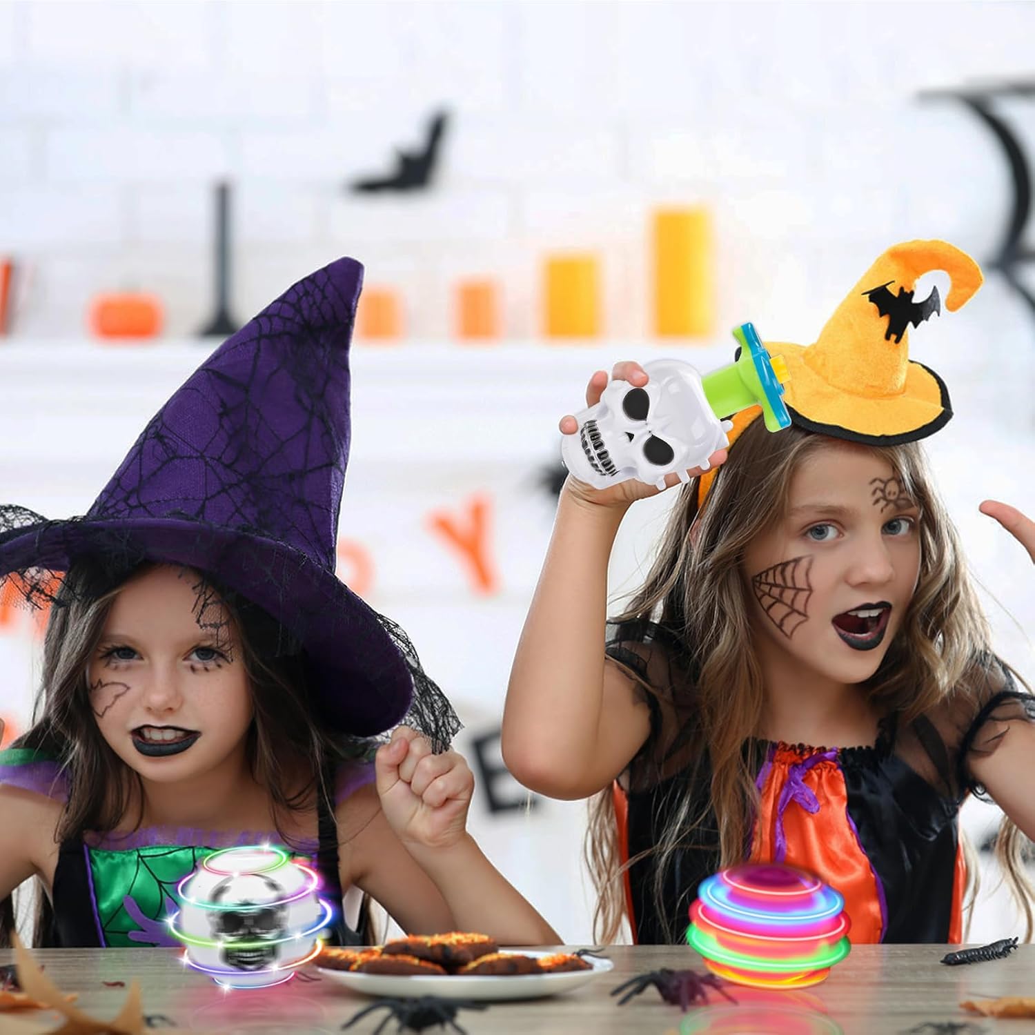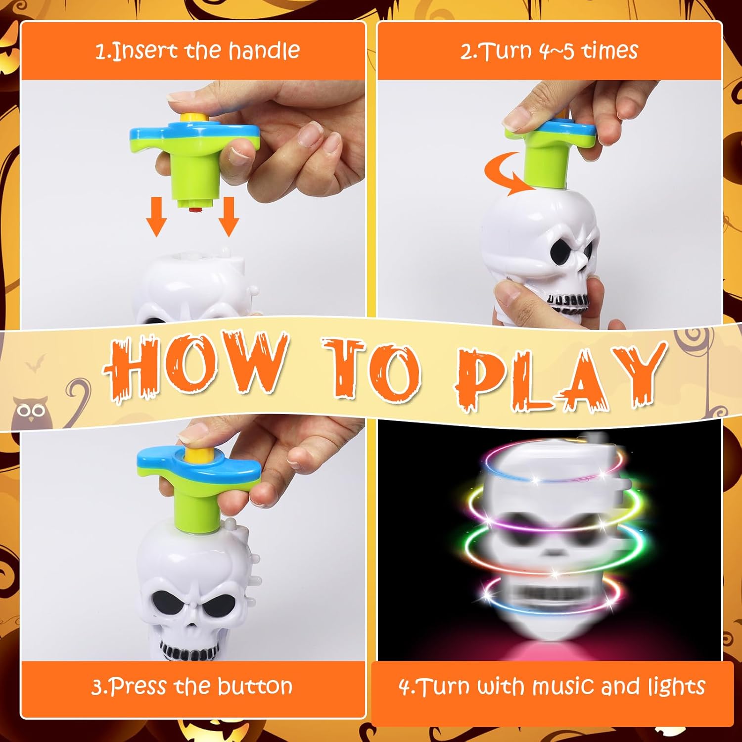 Trottola giocattolo di Halloween: include 3 trottole per bambini di Halloween, design con zucca e scheletro; Ogni parte superiore del giocattolo ha bellissime luci quando gira ed è piena di vitalità. Sarà la fonte di gioia per l'Halloween dei bambini e farà loro amare Giocattoli di sicurezza: le trottole dei regali di Halloween sono realizzate in plastica ecologica, atossica e innocua, liscia e delicata, con un aspetto rotondo, facile da afferrare, i bambini possono giocare e anche i genitori possono sentirsi a proprio agio Come usare: basta puntare il trasmettitore sull'anello della scanalatura e ruotare la trottola in senso orario per avviare l'allineamento del terreno. La parte inferiore della trottola di Halloween ha un design equilibrato che consente alla trottola di girare a lungo. Regali di Halloween per bambini: Con l'avvicinarsi di Halloween, è desiderio di ogni genitore scegliere con cura un regalo pieno di sorpresa e gioia per i propri figli. Questi regali di Halloween per bambini portano le benedizioni e la gioia delle vacanze ed è senza dubbio la scelta migliore. Piacevoli giochi di Halloween per bambini: che si tratti di una festa di Halloween in famiglia, di attività scolastiche o di interazione tra genitori e figli, questa trottola per bambini è uno strumento magico per creare un'atmosfera gioiosa. I bambini possono giocare a vari giochi interessanti legati al "giroscopio", come la collisione rotatoria, il relè rotazione, ecc