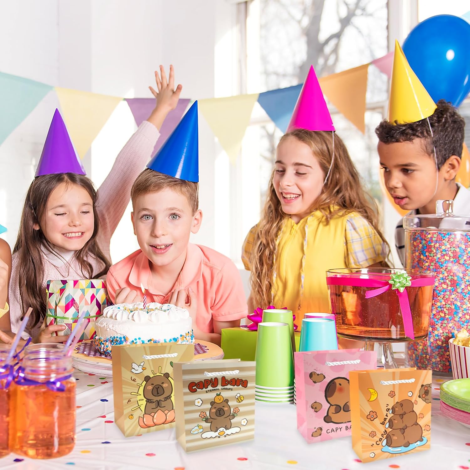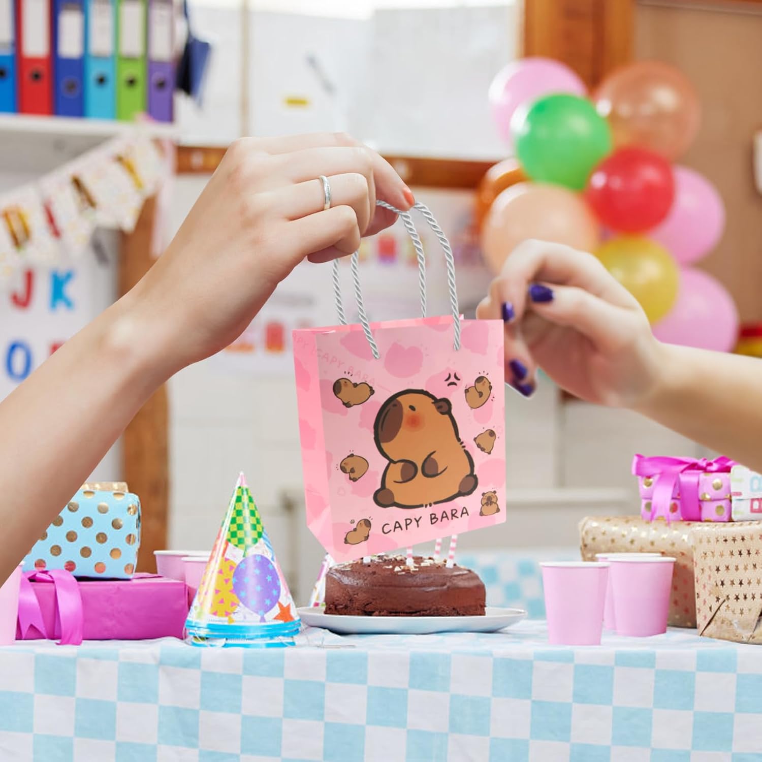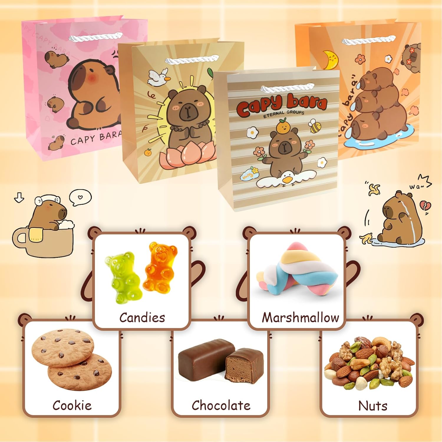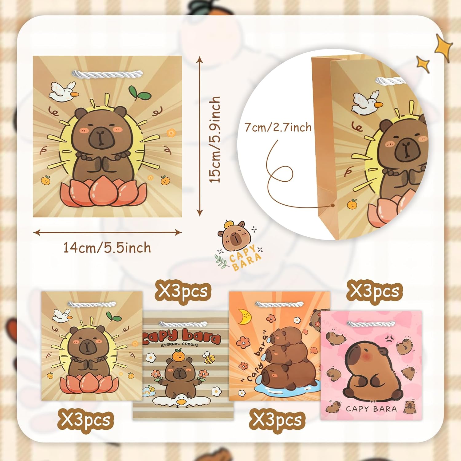 Pacchetto valore: riceverai 12 pezzi di sacchetti di carta Capybara. Questo set di sacchetti regalo capibara soddisfa le tue esigenze di regali per le feste. Fornisce una quantità sufficiente per le bomboniere dei capibara. Una fantastica decorazione per la tua festa con i sacchetti per bomboniere a tema capibara! Simpatico design di capibara: graziosi design di capibara, ogni disegno ha 3 pezzi, utili e decorativi. Con maniglie, portatili e facili da trasportare, le borse per bomboniere Capy sono facili e comode da usare. 【Dimensione perfetta】 Ogni borsa con manico in capibara misura ca. 15,5x14x7 cm. Questi sacchetti di carta hanno una capacità adeguata e sono belli, possono contenere regali di piccole dimensioni e leggeri e questo sacchetto regalo di carta è comodo da trasportare. 【Qualità Premium】 Realizzato in materiale di alta qualità per un uso durevole e duraturo. Base quadrata per una facile installazione. Più spessi dei normali sacchetti di carta, nessun odore. Design pieghevole, può essere piegato quando non in uso, non occuperà troppo spazio. 【Ampia applicazione】 Borse da festa di capibara per ragazzi e ragazze, decorazioni per feste di capibara, compleanni, baby shower, congratulazioni, confezioni di regali di Natale. Puoi riempirli con biglietti di ringraziamento, caramelle, pasticcini, giocattoli e buoni regalo per creare regali personalizzati e premurosi per i tuoi ospiti.
