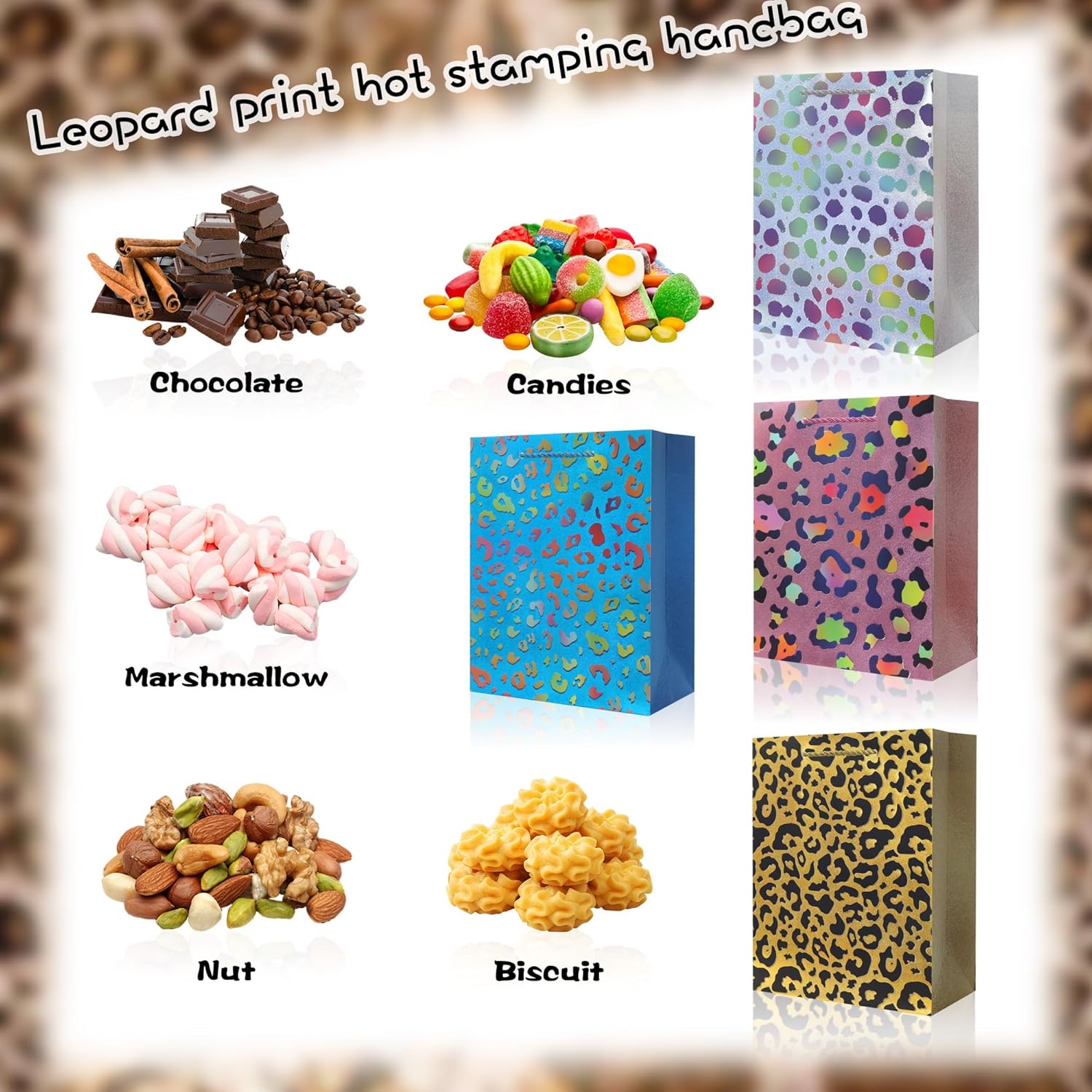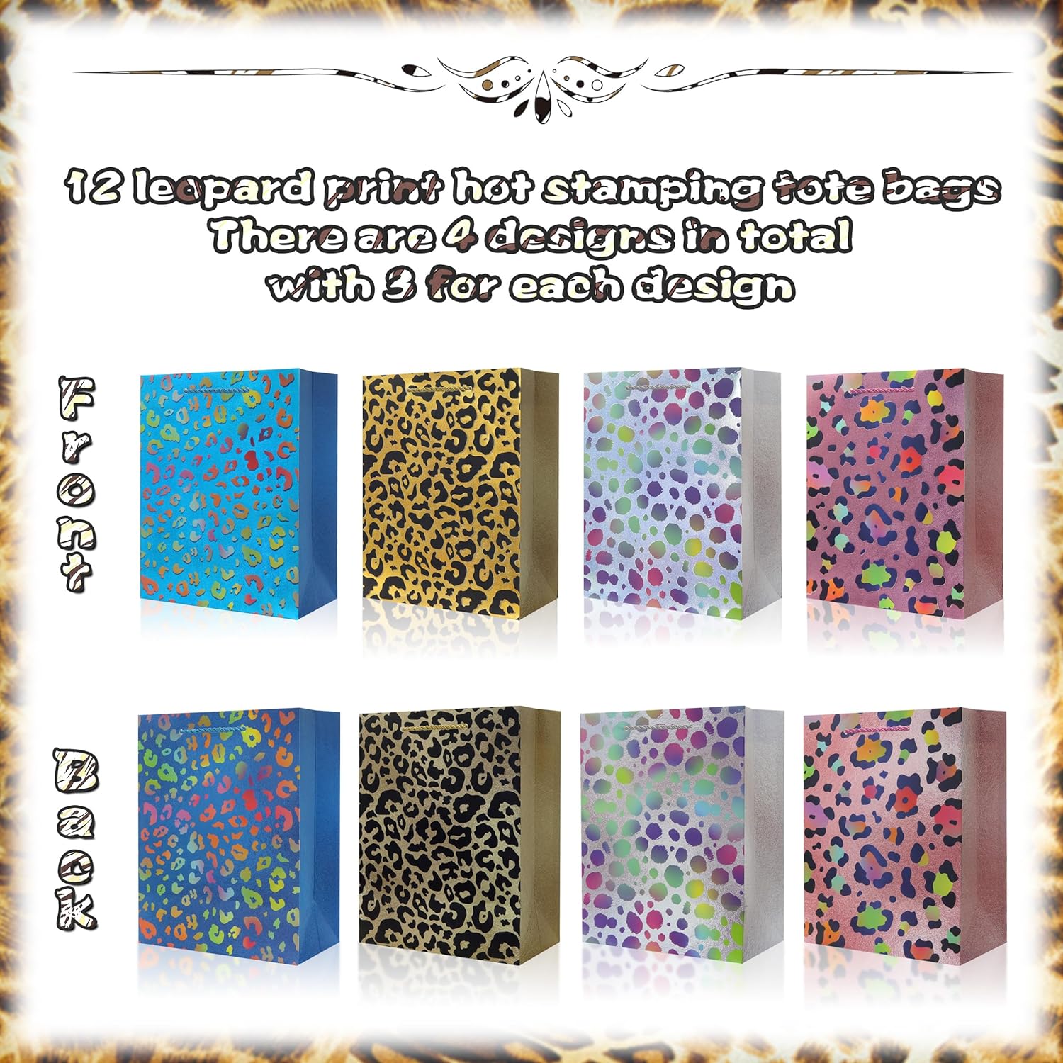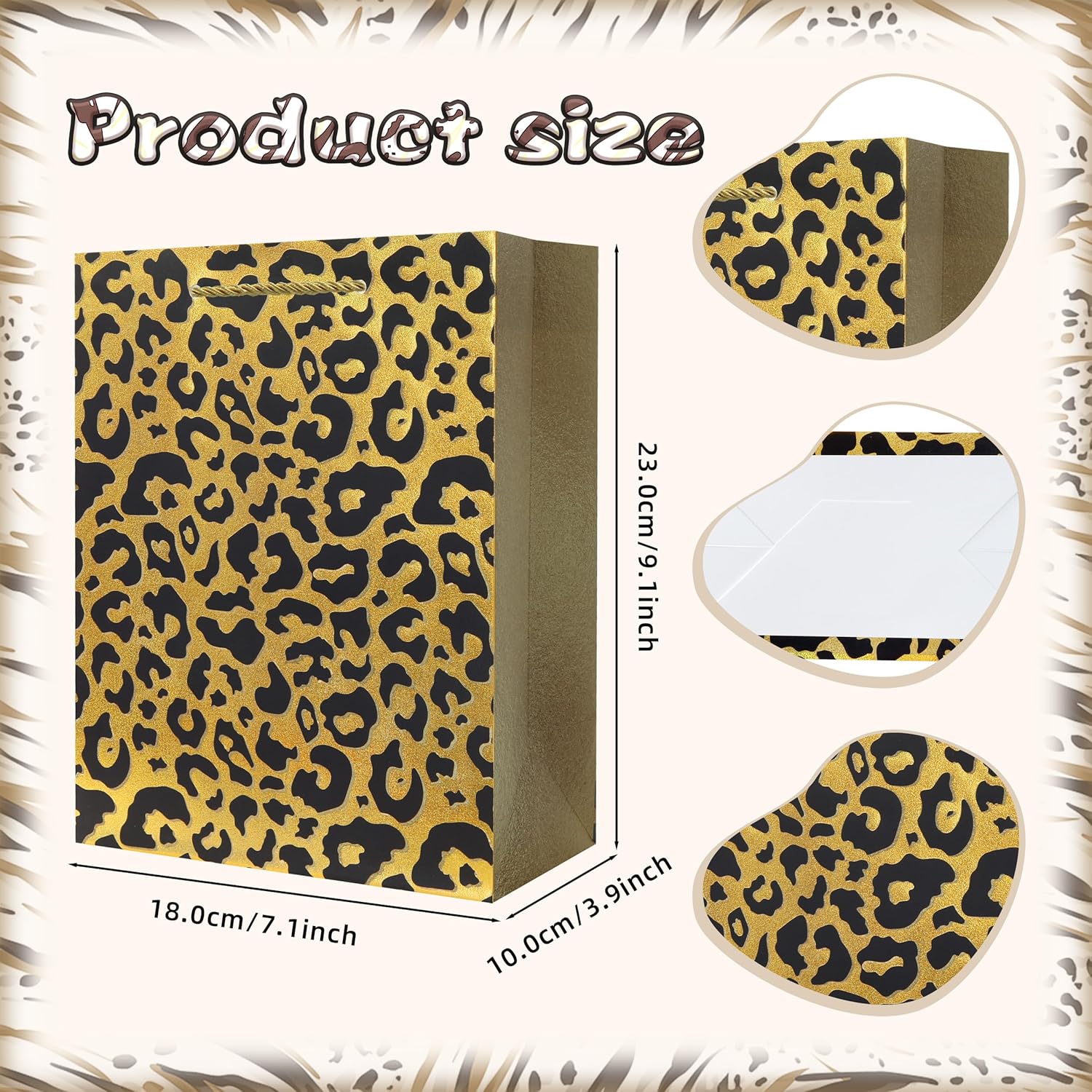12 sacchetti da festa con stampa leopardata: le dimensioni del nostro sacchetto regalo sono 23 cm di altezza, 18 cm di lunghezza e 10 cm di larghezza. Piccola borsa in cartone con stampa animalier, facile da trasportare. 4 colori, ogni colore ha 4, totale 12 pezzi. Perfetto per aggiungere varietà e stile alla tua festa. Borsa in cartone con stampa di piccoli animali e manico - Realizzata in carta resistente, questa borsa è perfetta per caramelle, giocattoli o piccoli regali. Borsa regalo con stampa animalier: classico motivo leopardato, che mette in risalto il fascino di fondere natura selvaggia e moda. Borsa regalo con stampa animalier Un must per le feste di compleanno degli adulti VERSATILE PER TUTTI GLI EVENTI - Queste borse sono ideali per feste a tema militare, celebrazioni per il ritorno a casa dei veterani, feste avventurose per bambini e altro ancora. Aggiungi un tocco divertente e audace a ogni occasione. Preparazione per feste senza sforzo: risparmia tempo ed energia con questi sacchetti regalo pronti all'uso che stupiranno i tuoi ospiti e si adatteranno a qualsiasi festa.