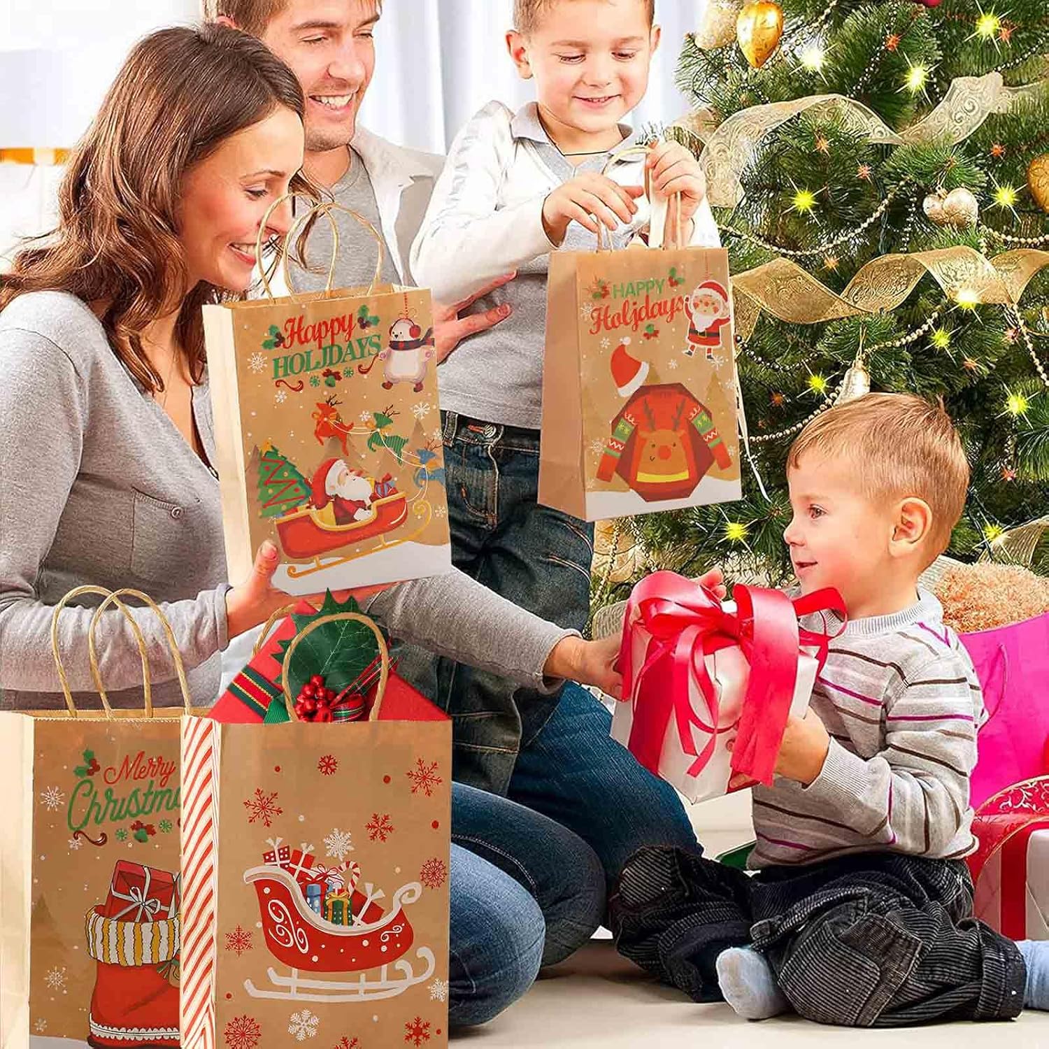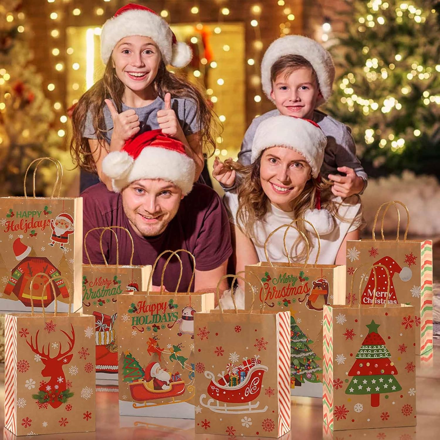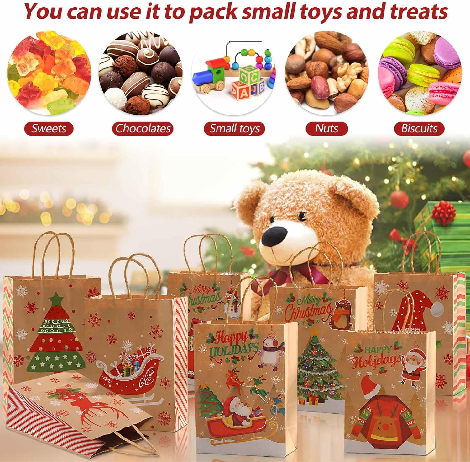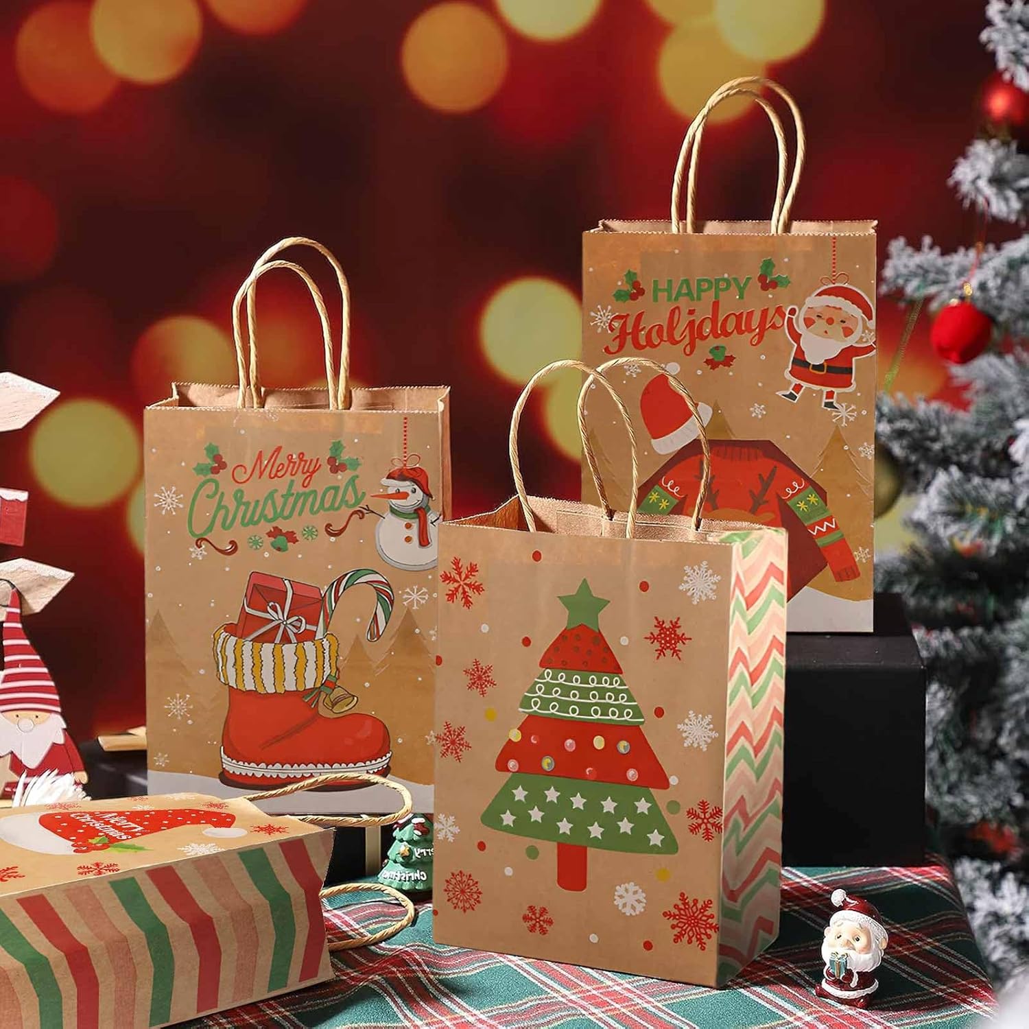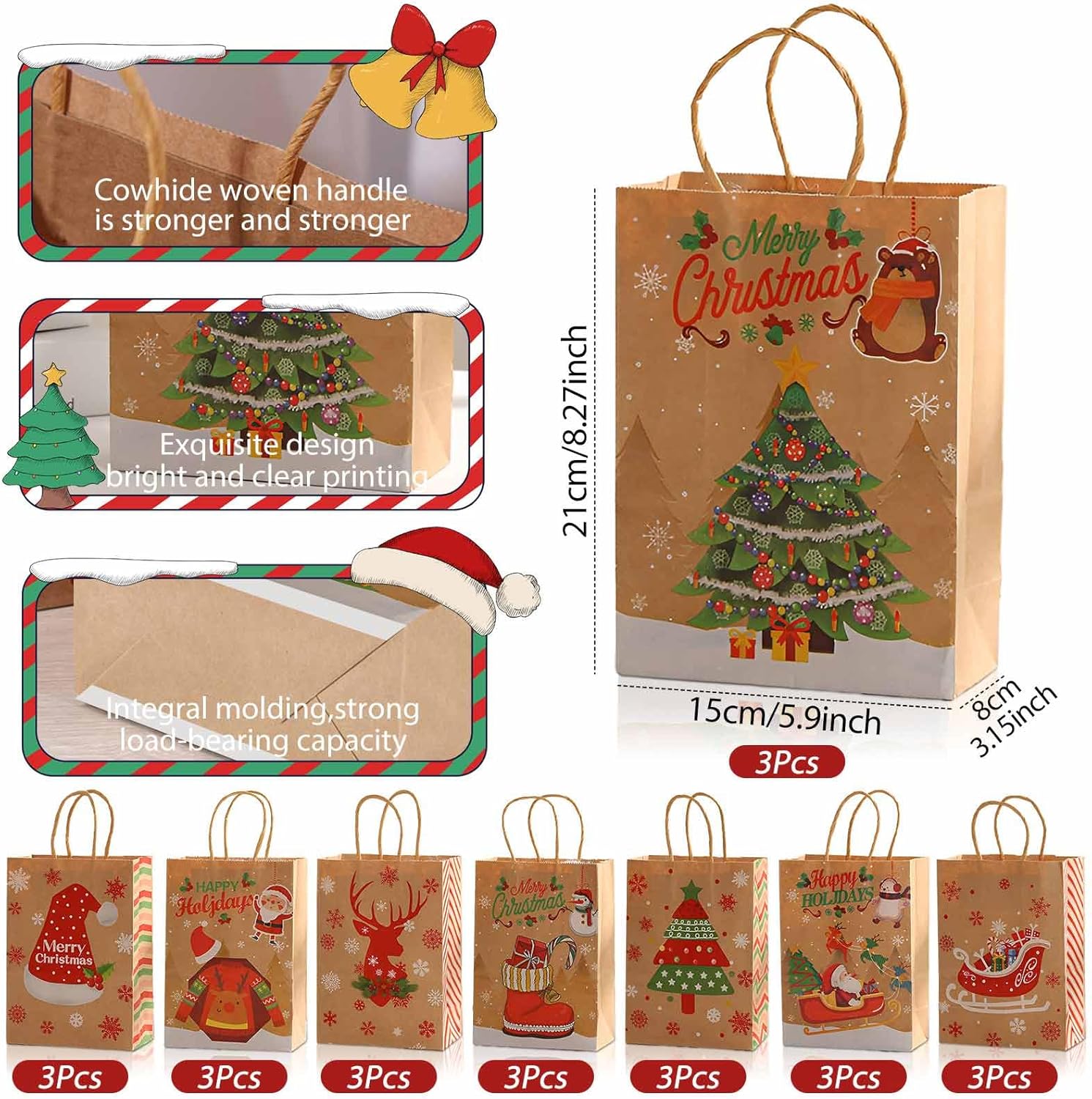 Il prodotto contiene:Include 24 sacchetti di carta che misurano circa 21 x 15 x 8 cm. Materiale dei sacchetti di carta natalizi: realizzati in carta kraft di alta qualità, non facili da rompere e strappare e riutilizzabili. Sacchetti regalo di carta natalizia Vari modelli: tra cui cappello da Babbo Natale, stivali di Natale, albero di Natale, Babbo Natale, slitta, ecc. 8 tipi di modelli classici natalizi, colori vivaci e pieni di atmosfera natalizia. Design della maniglia: ogni borsa natalizia ha una maniglia robusta per un facile trasporto. Il sacchetto di carta è facile da aprire e piegare. Ampia gamma di applicazioni: può essere utilizzato per Natale, Ringraziamento, feste di compleanno, ecc. È adatto a tutte le età. È molto adatto per confezionare regali di Natale, oggetti di artigianato, biscotti, bambole e altri prodotti da forno fatti in casa per rendere i tuoi regali più attraenti e divertenti.