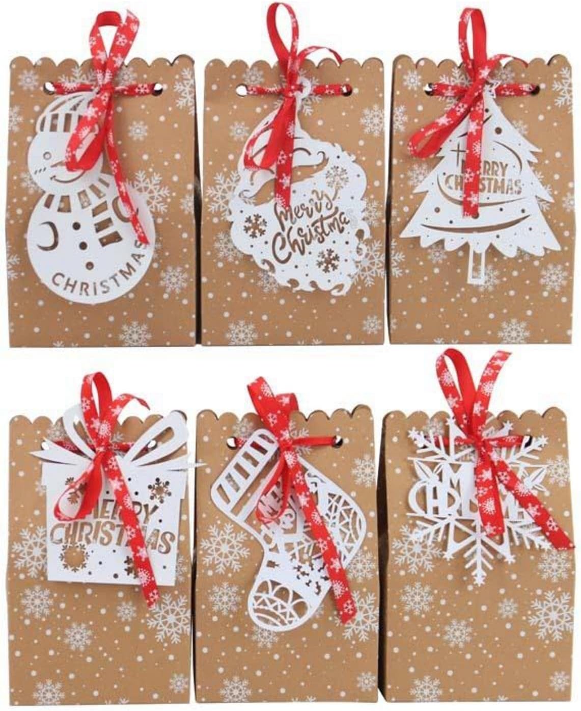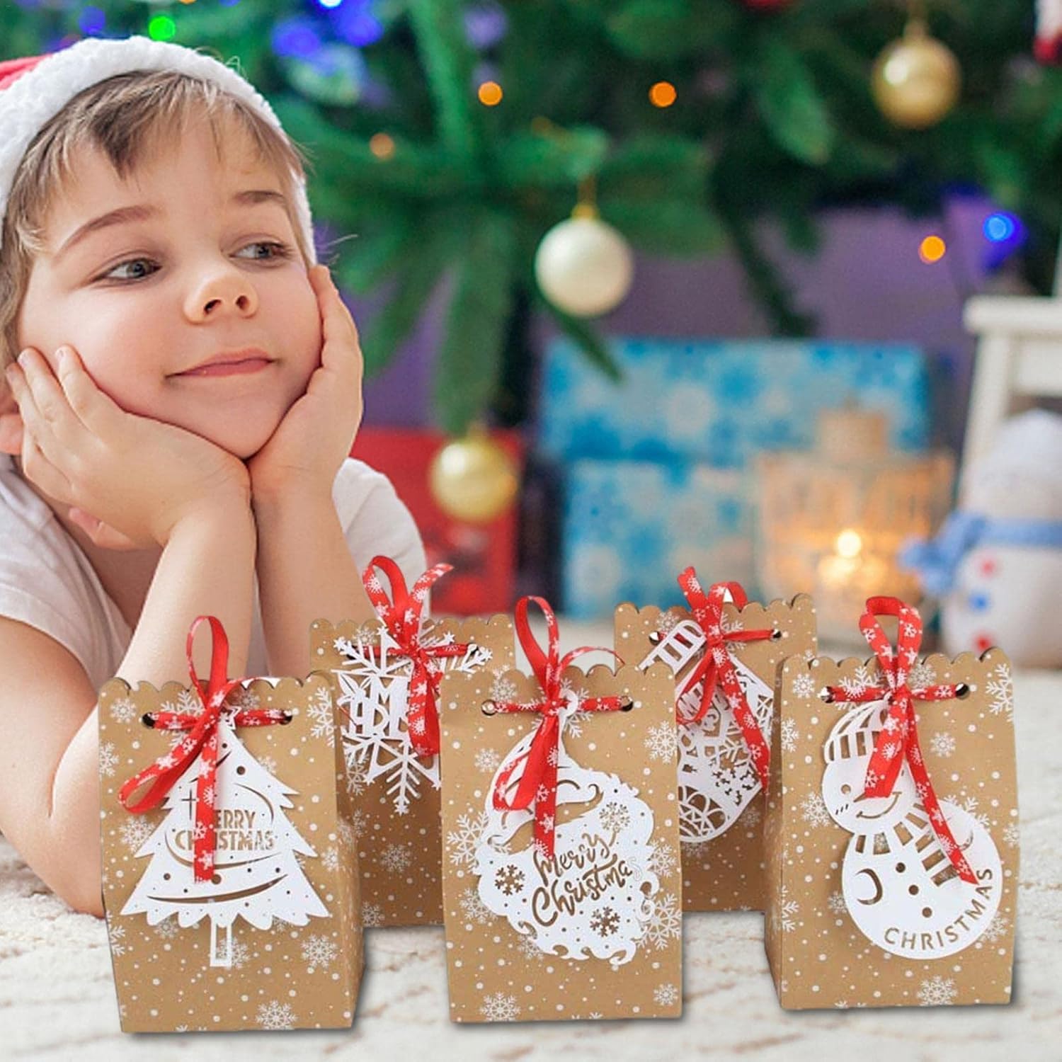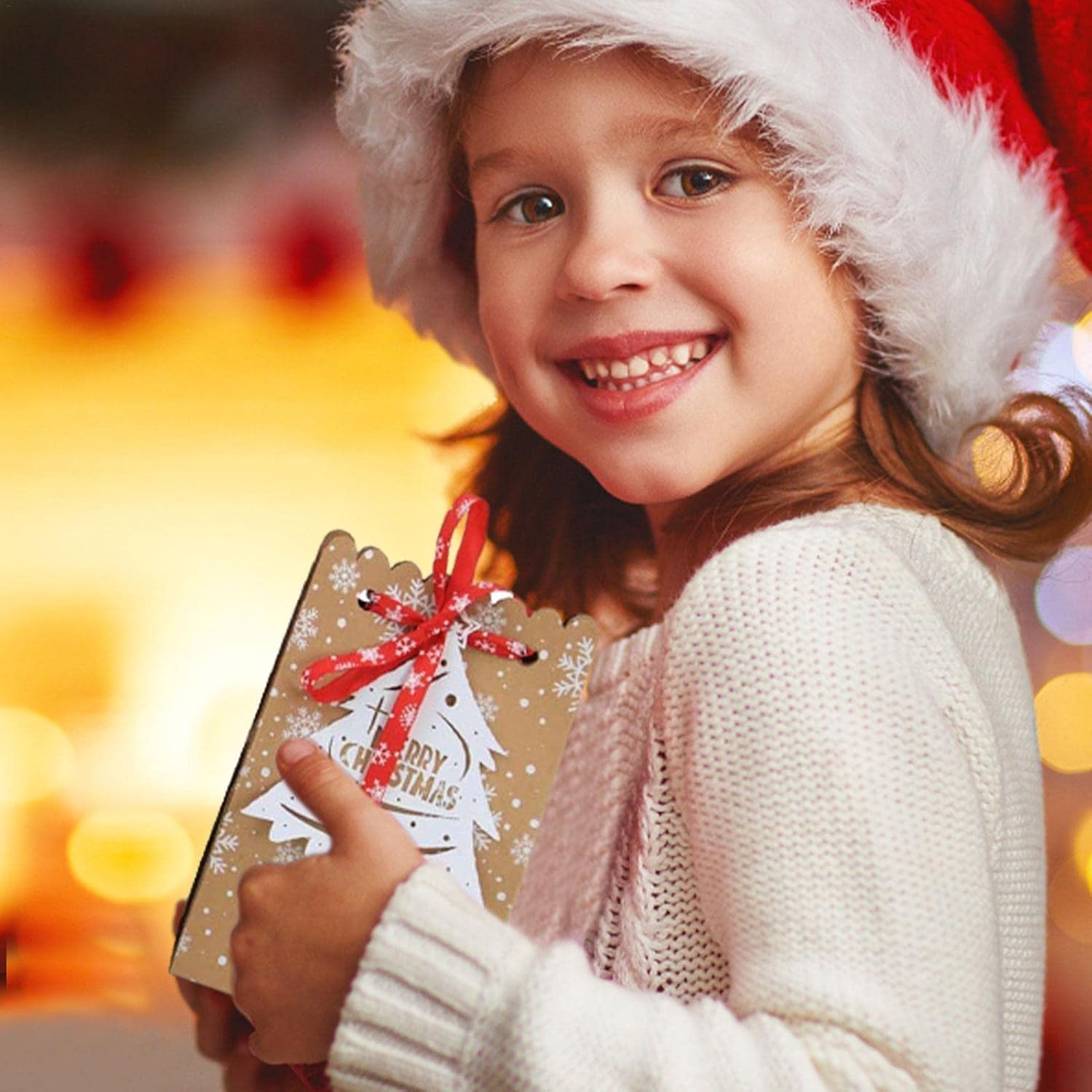 [Contenuto sufficiente]: i sacchetti regalo di Natale in carta hanno 4 design diversi e ciascuno ha 6 sacchetti, sufficienti per soddisfare le tue esigenze per feste di diverse dimensioni, inclusi 24 sacchetti, 24 etichette bianche e 24 nastri rossi con fiocchi di neve. [Comodo assemblaggio]: i sacchetti regalo natalizi in carta kraft creano un momento felice unico tra genitori e figli, progettati con pieghe per un facile assemblaggio, così semplici che i tuoi bambini possono aiutarti. [Materiale di fascia alta]: la carta per sacchetti per bomboniere offre prestazioni robuste, inodore, sicure e riciclabili, progettata per un festival felice, realizzata con carta kraft di alta qualità sotto un rigoroso controllo di qualità. [Varie occasioni]: i sacchetti di carta per bomboniere ti lasceranno un ricordo indimenticabile e ti regaleranno un'atmosfera natalizia, perfetta per feste di Natale, feste di compleanno, feste di matrimonio e feste a tema invernale. [Uso versatile]: le Goodie Bag Christmas non sono solo per dolcetti, ma anche per artigianato e giocattoli, adatte per confezionare articoli per feste e piccoli regali, perfette per confezionare dolci, biscotti, cioccolatini e altri snack.